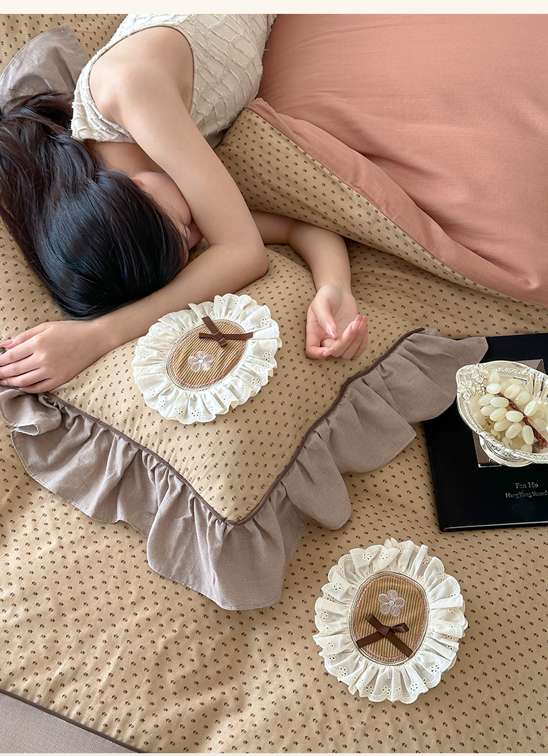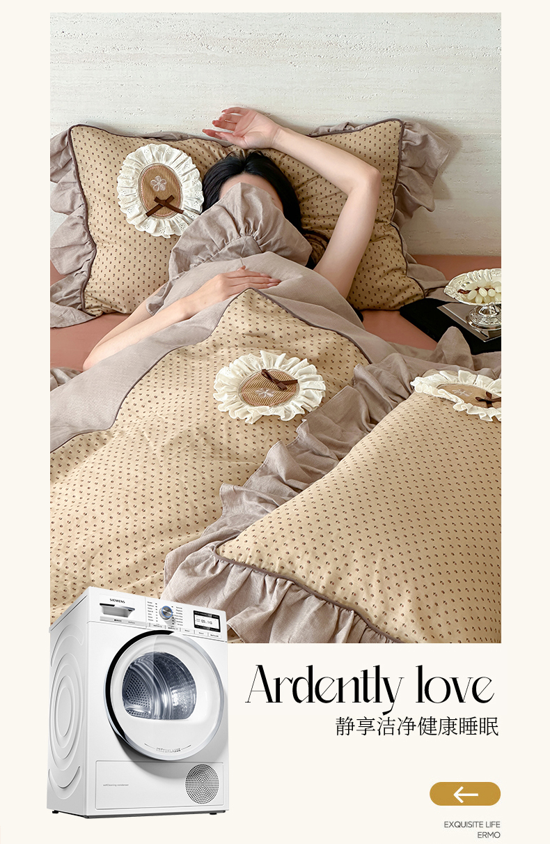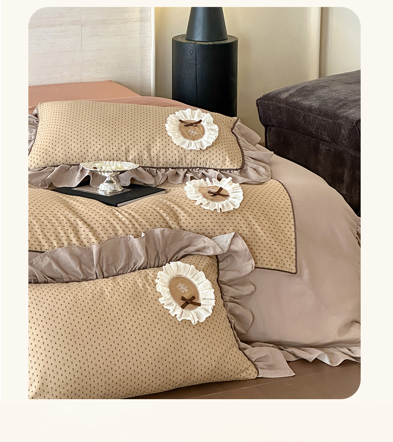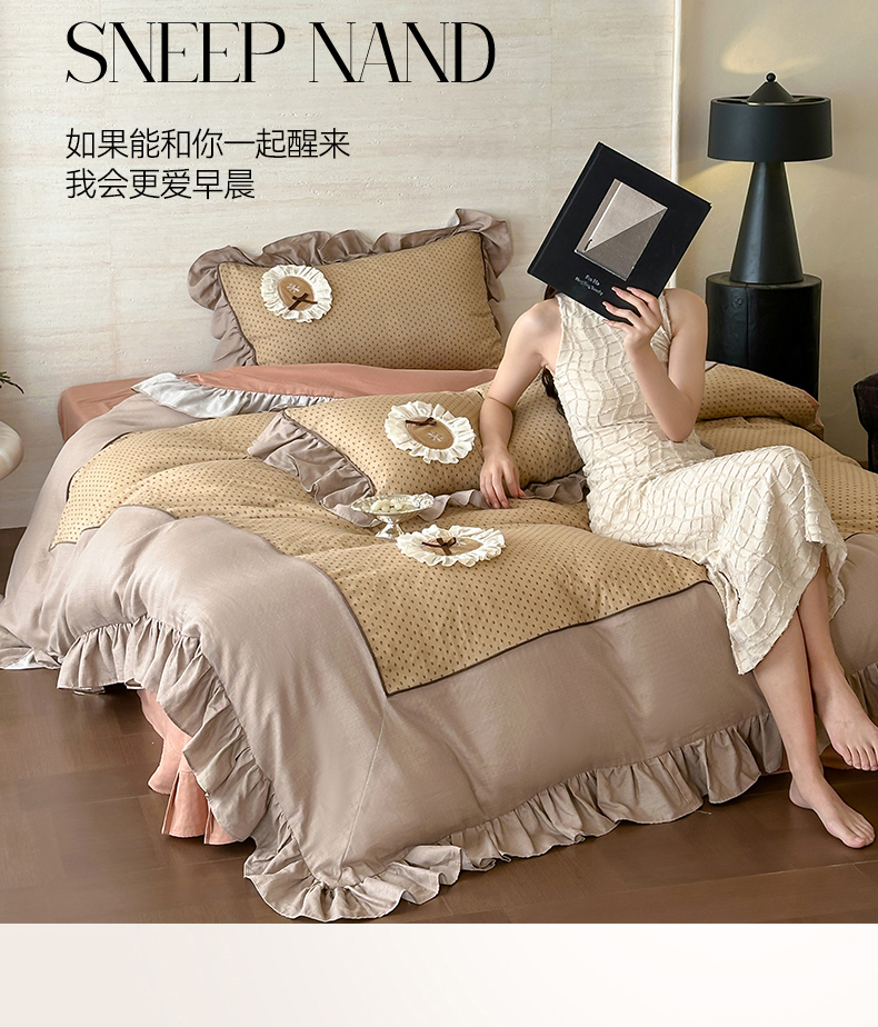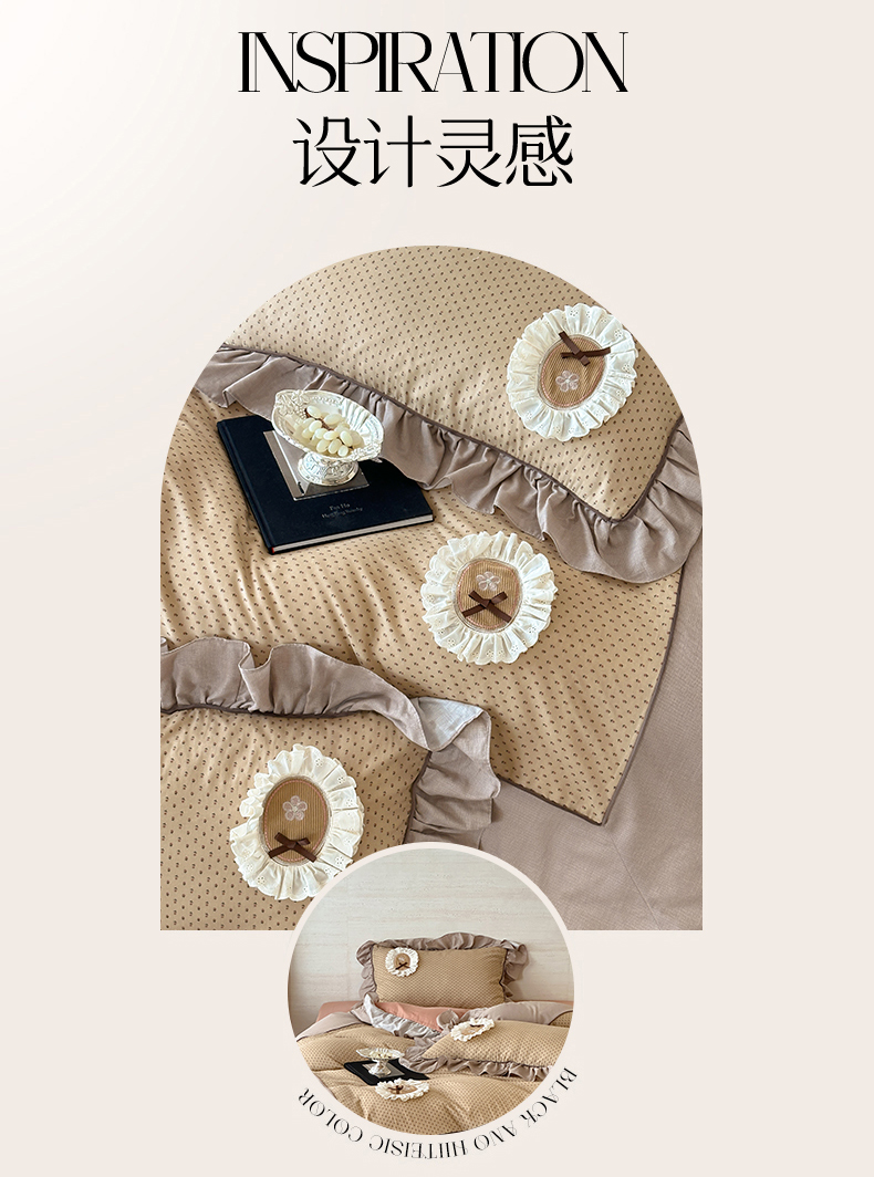 商品名称:名品优仓 2025新款纯棉水洗棉双层纱提花韩版花边四件套-爱丽丝 爱丽丝一咖
