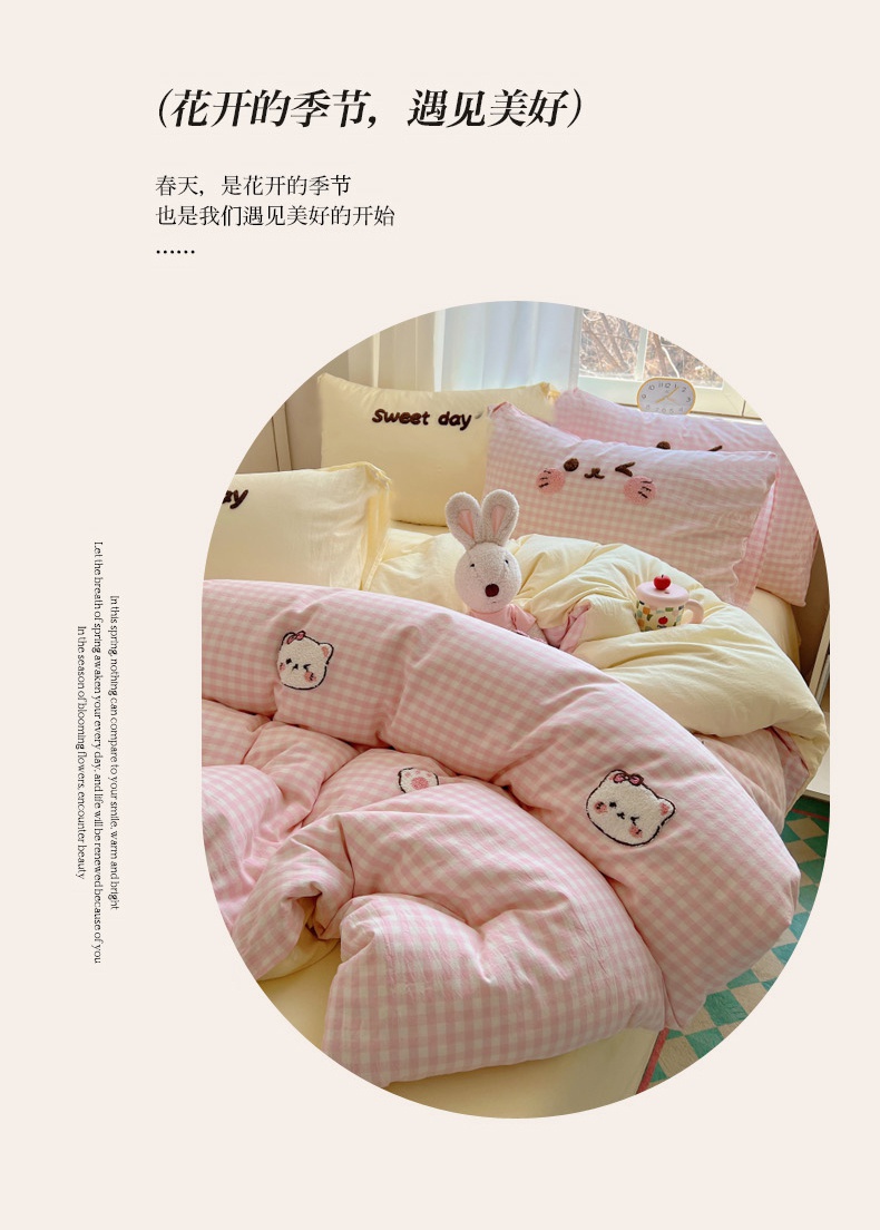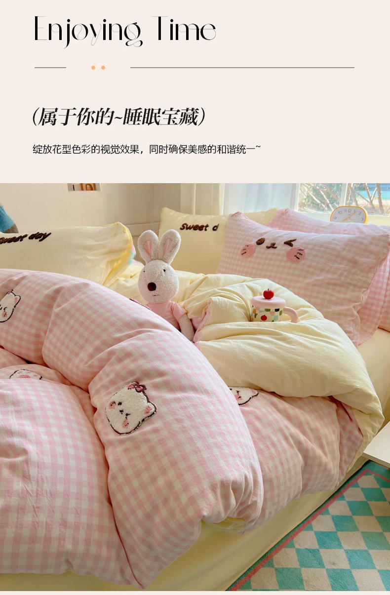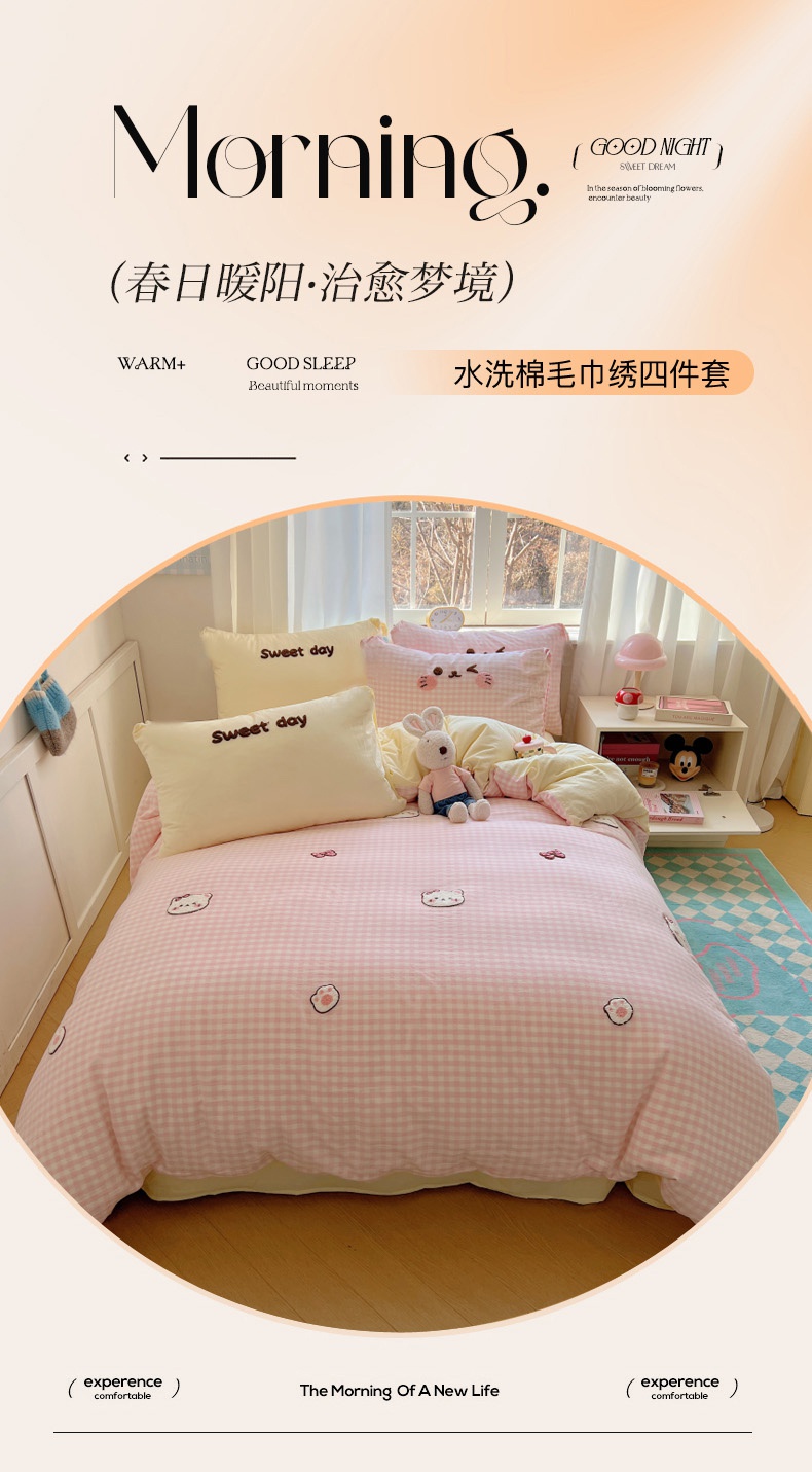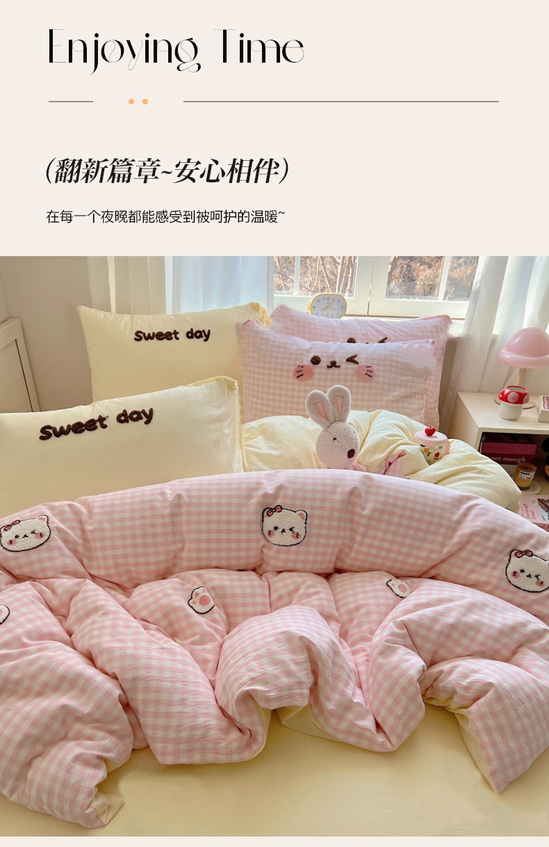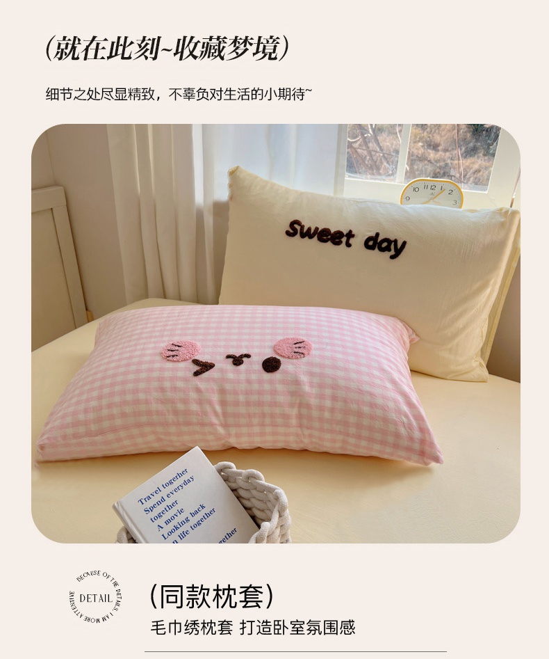当前位置: 91家纺网 > 商品网购 > 床品套件 > 四件套 > 全棉普通四件套 > 丽涵家纺 2025新款色织水洗棉毛巾绣四件套-甜心小猫系列 甜心小猫-粉黄-简单款