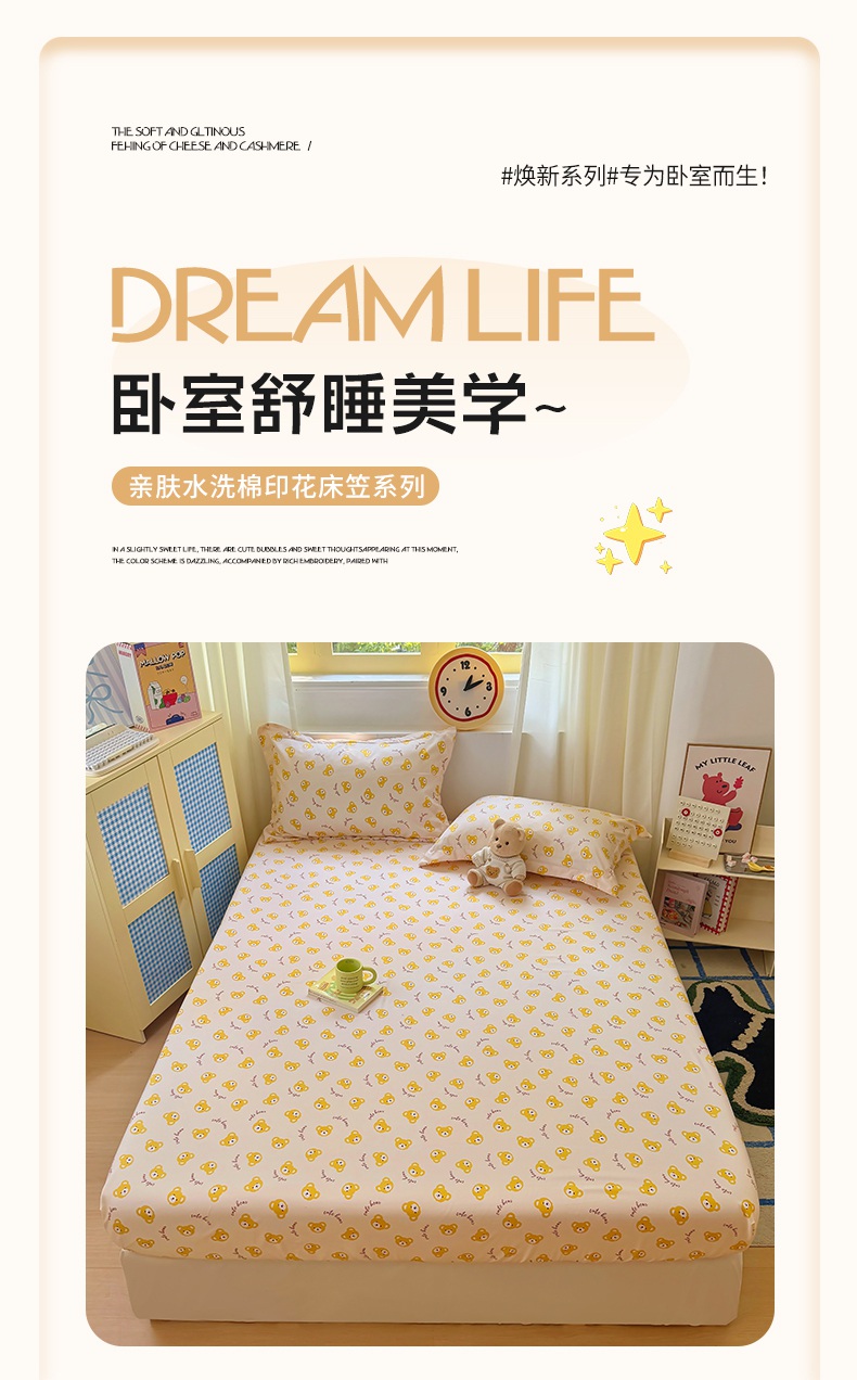 (总)十一家居 2025新款ins韩系卡通印花亲肤水洗棉床笠,黑色可颂,彩蝶之舞,波点小猫,欢乐伙伴,焦糖蘑菇,面包甜甜圈,奶芙小熊,微笑狗狗,组合