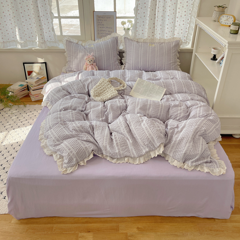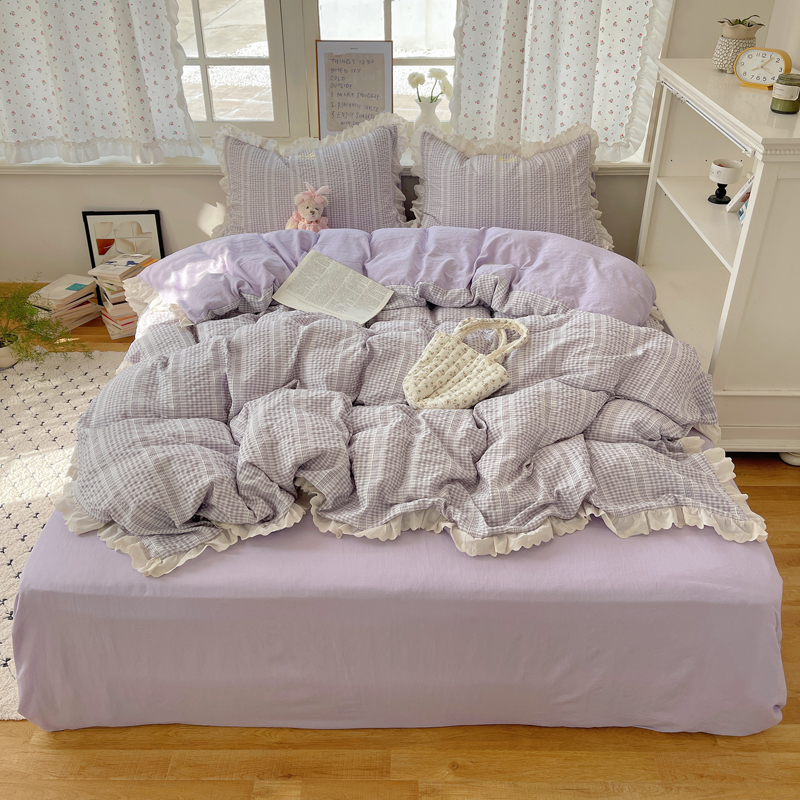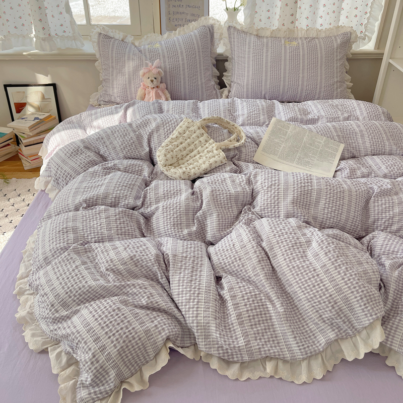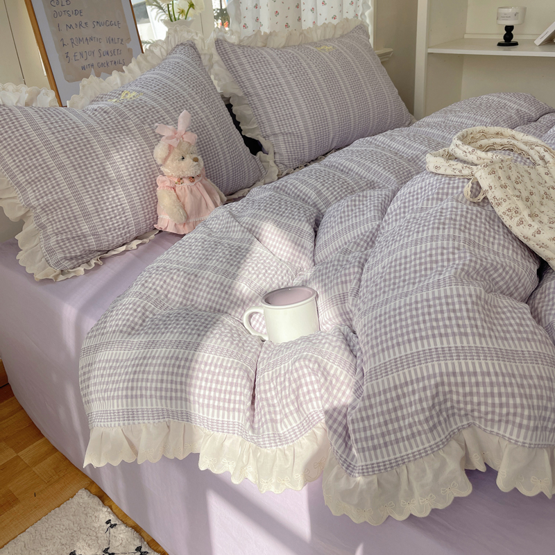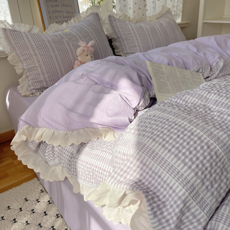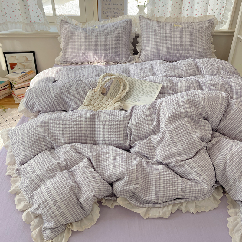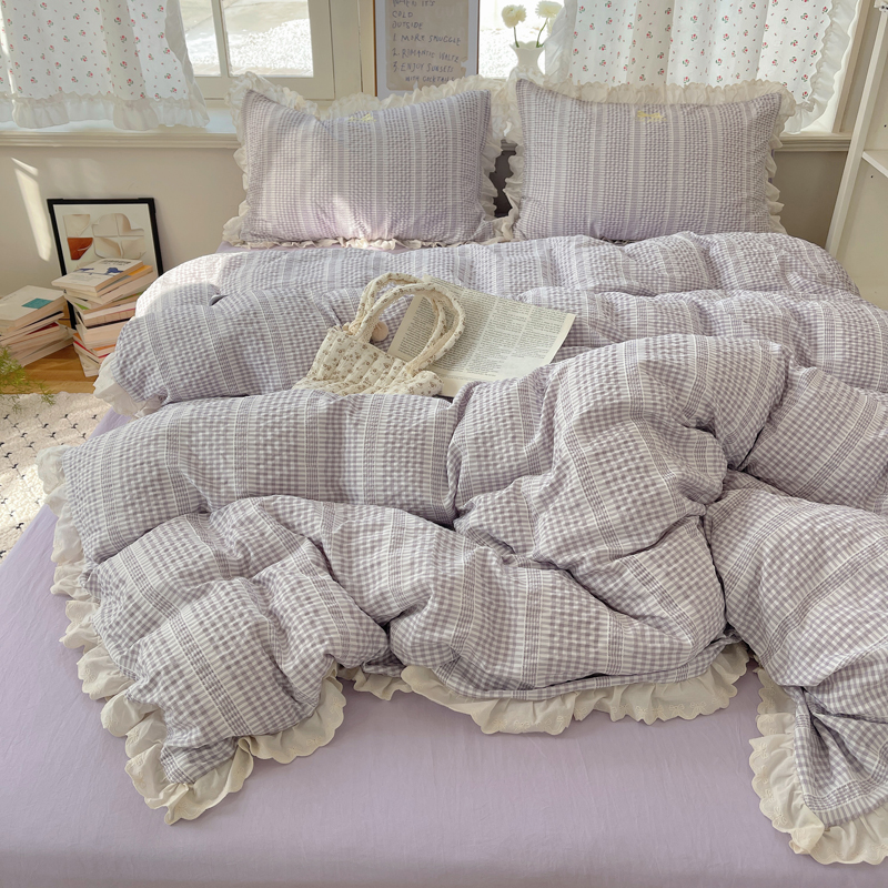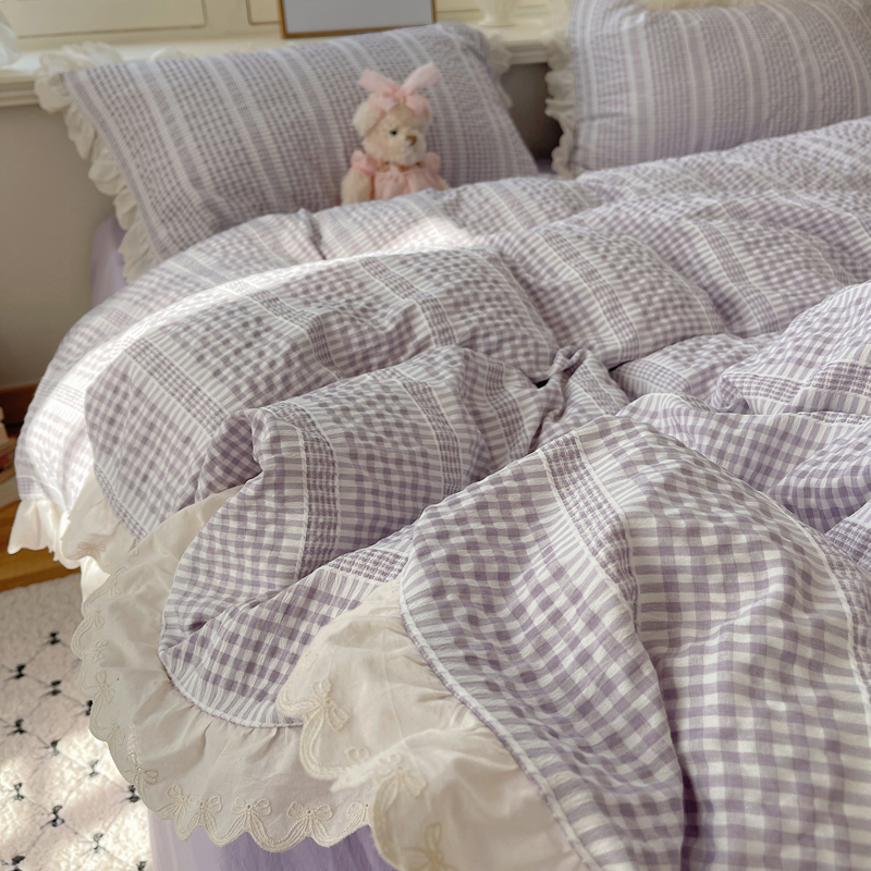 商品名称:轻奢坊 2025新款色织提花格子水洗棉仙仙花边安妮四件套 花边安妮-紫