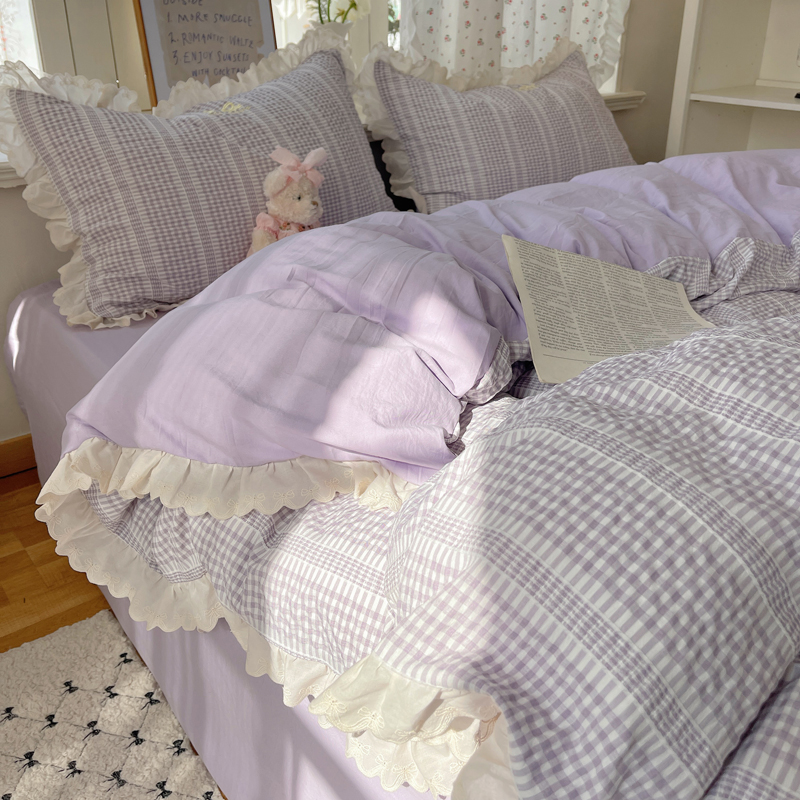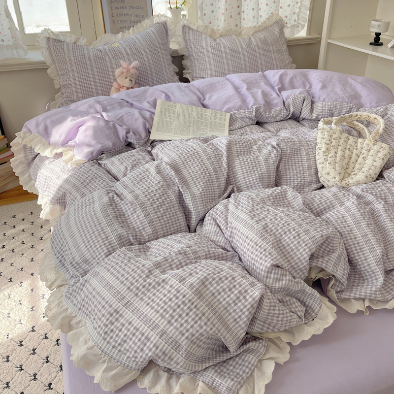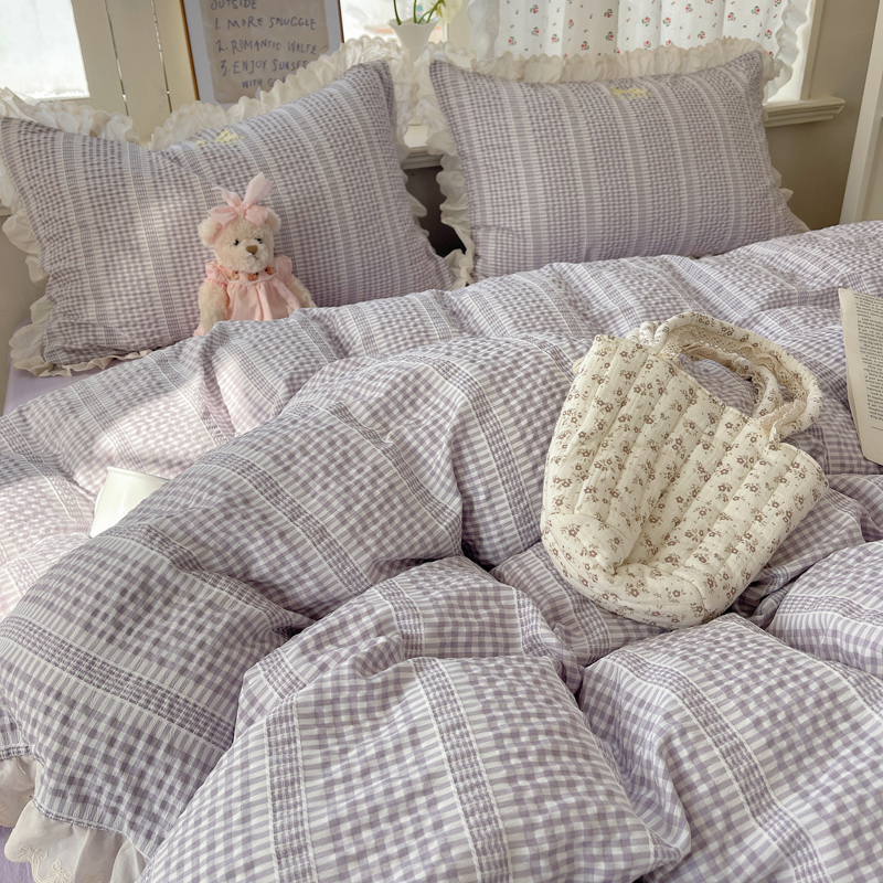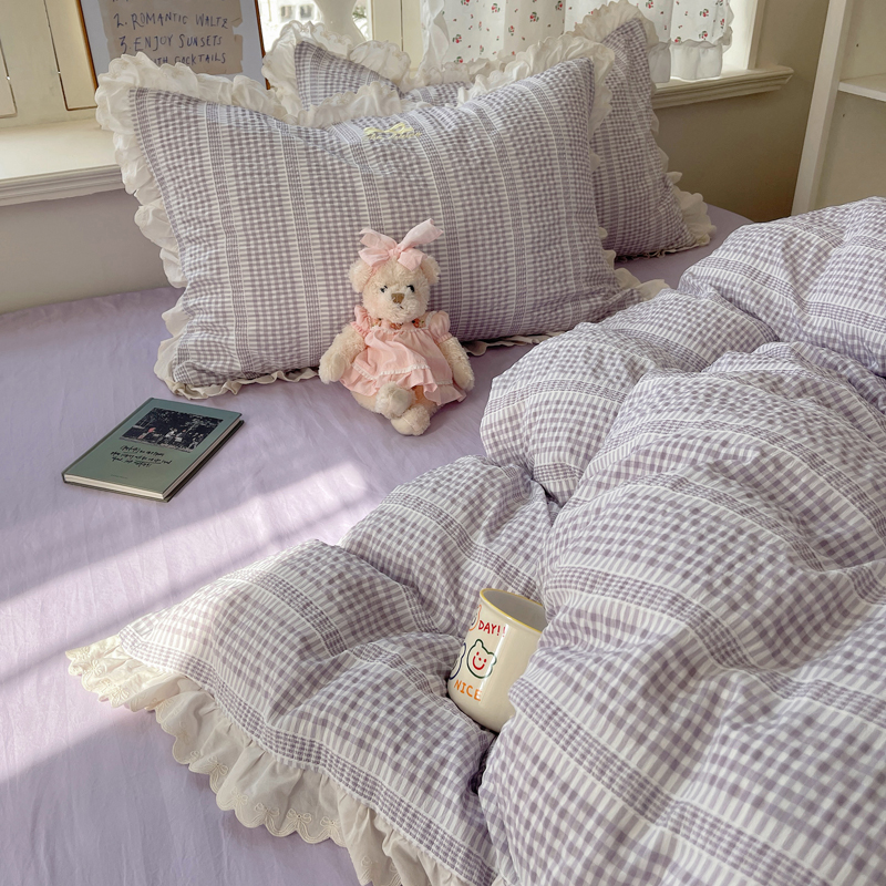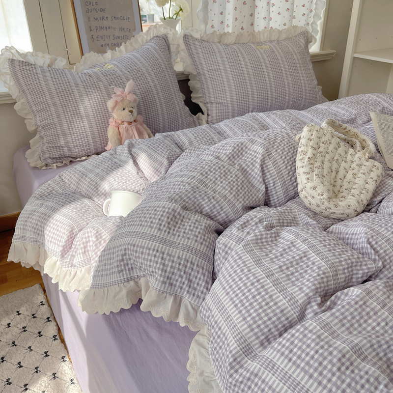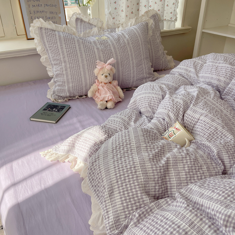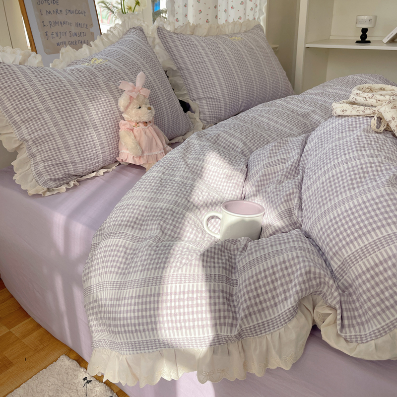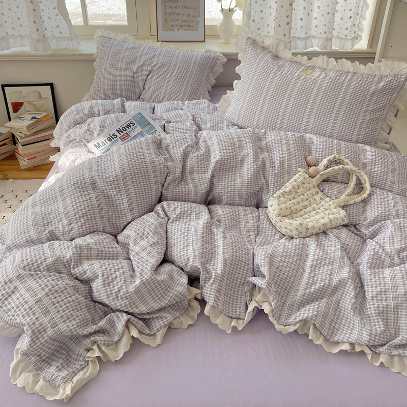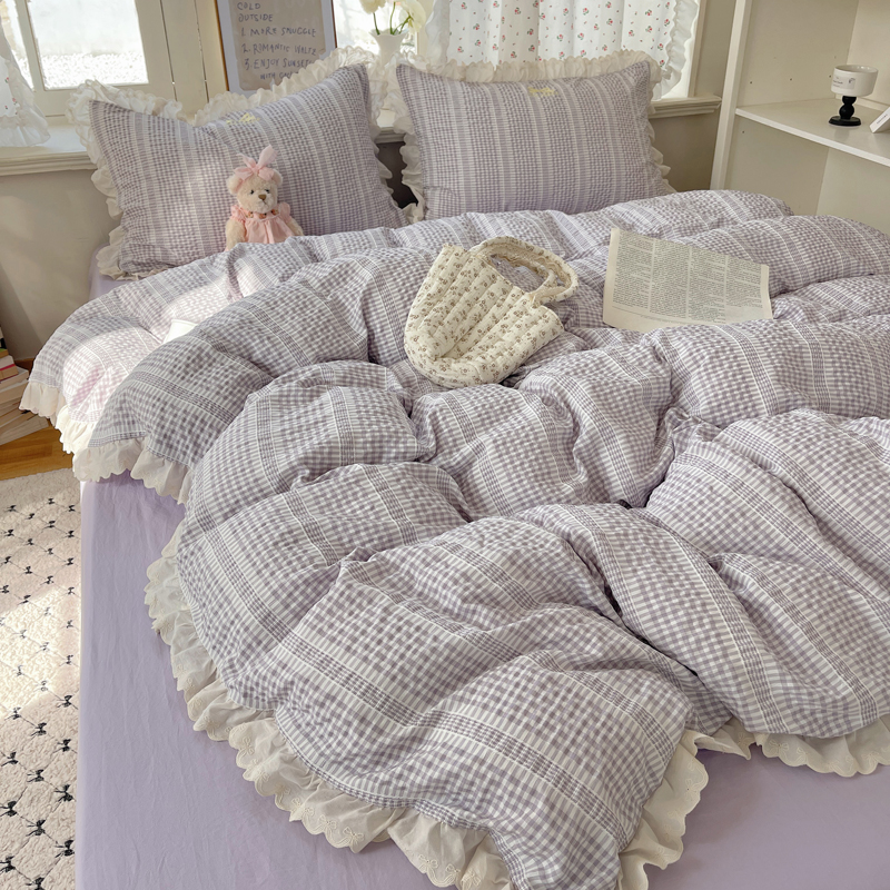 商品名称:轻奢坊 2025新款色织提花格子水洗棉仙仙花边安妮四件套 花边安妮-紫