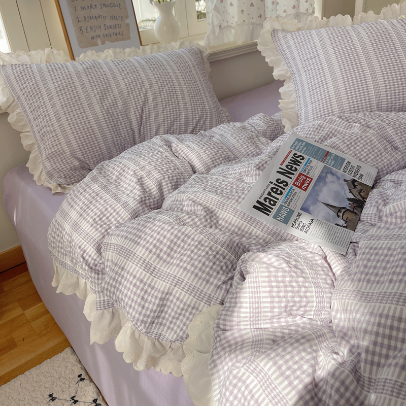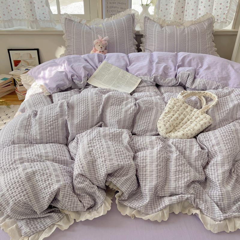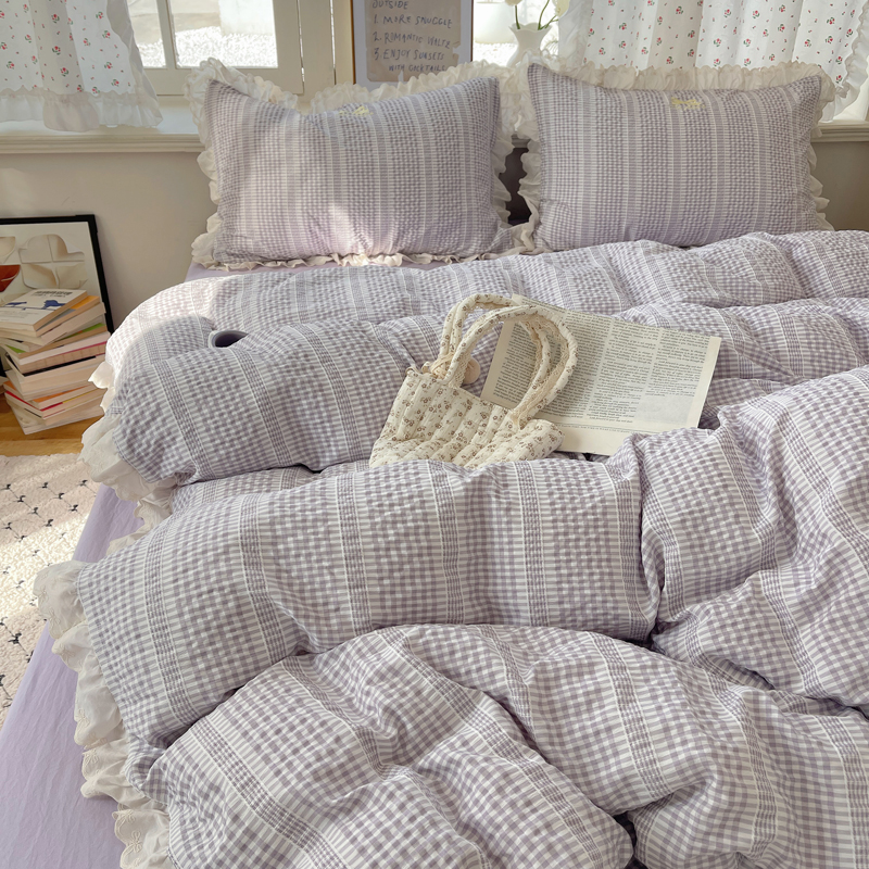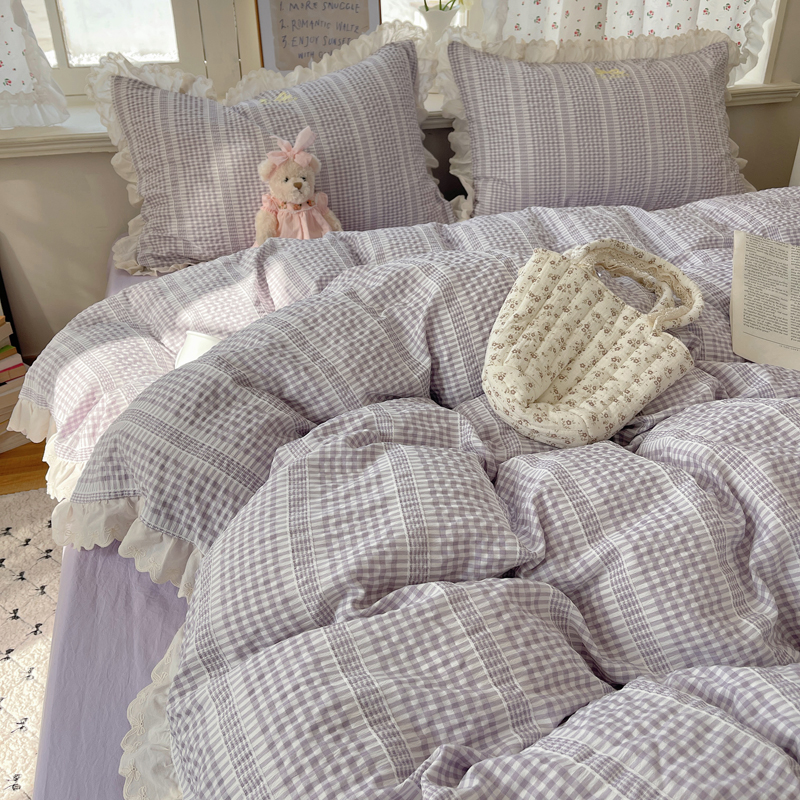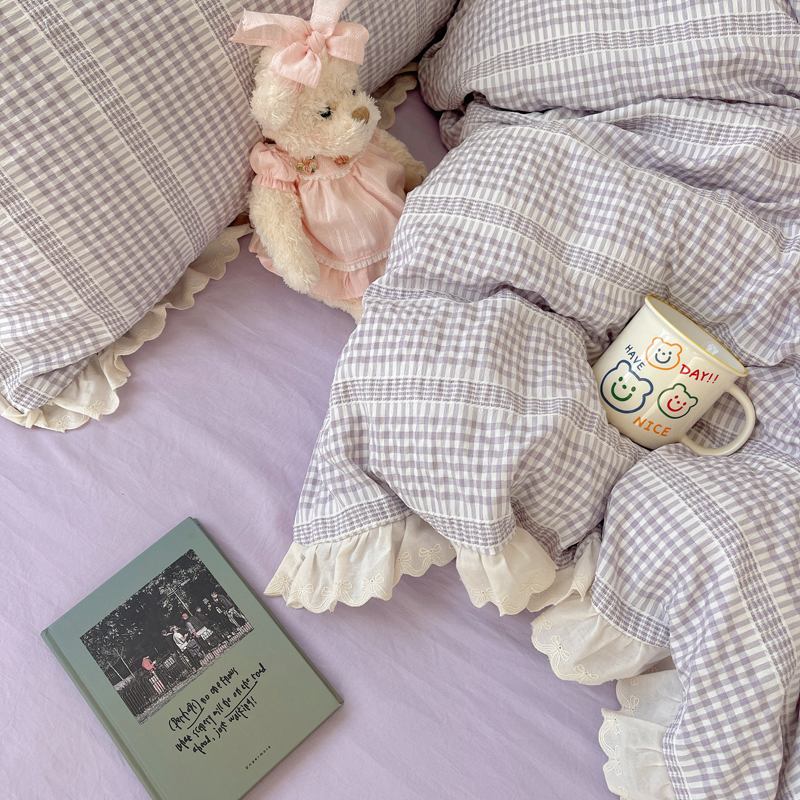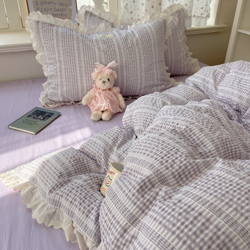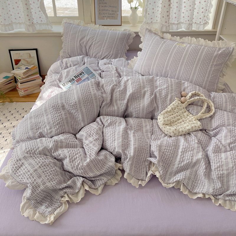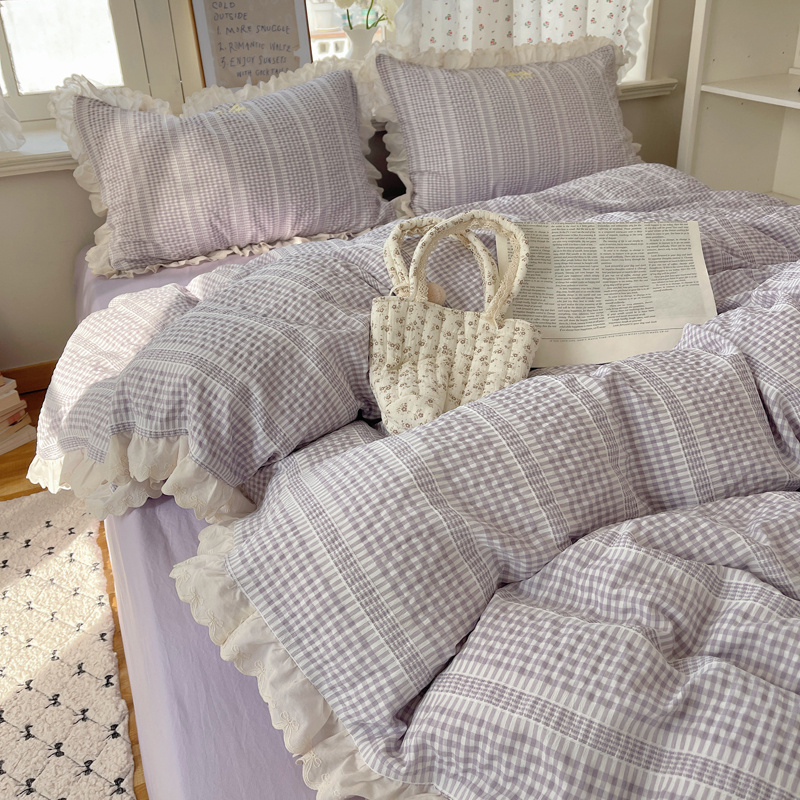 商品名称:轻奢坊 2025新款色织提花格子水洗棉仙仙花边安妮四件套 花边安妮-紫