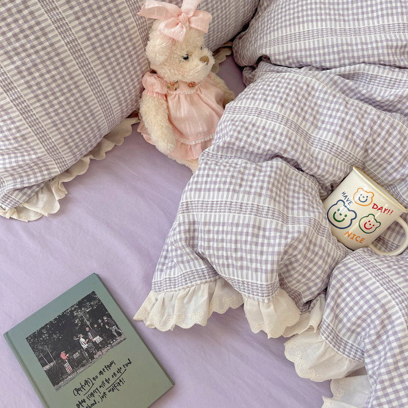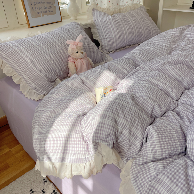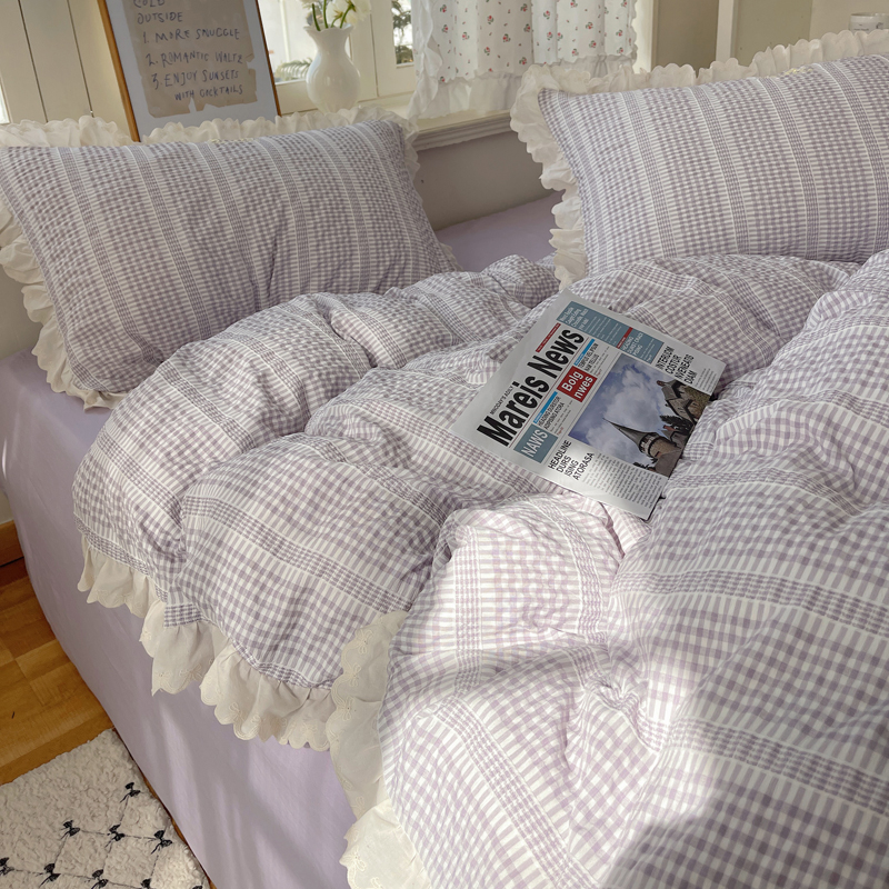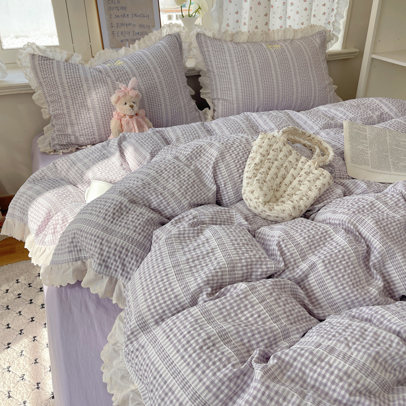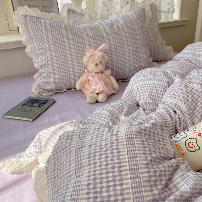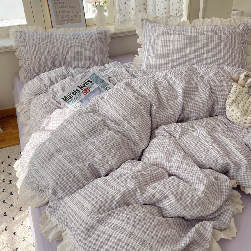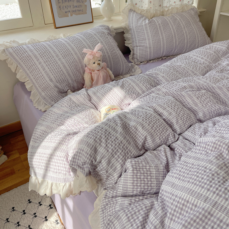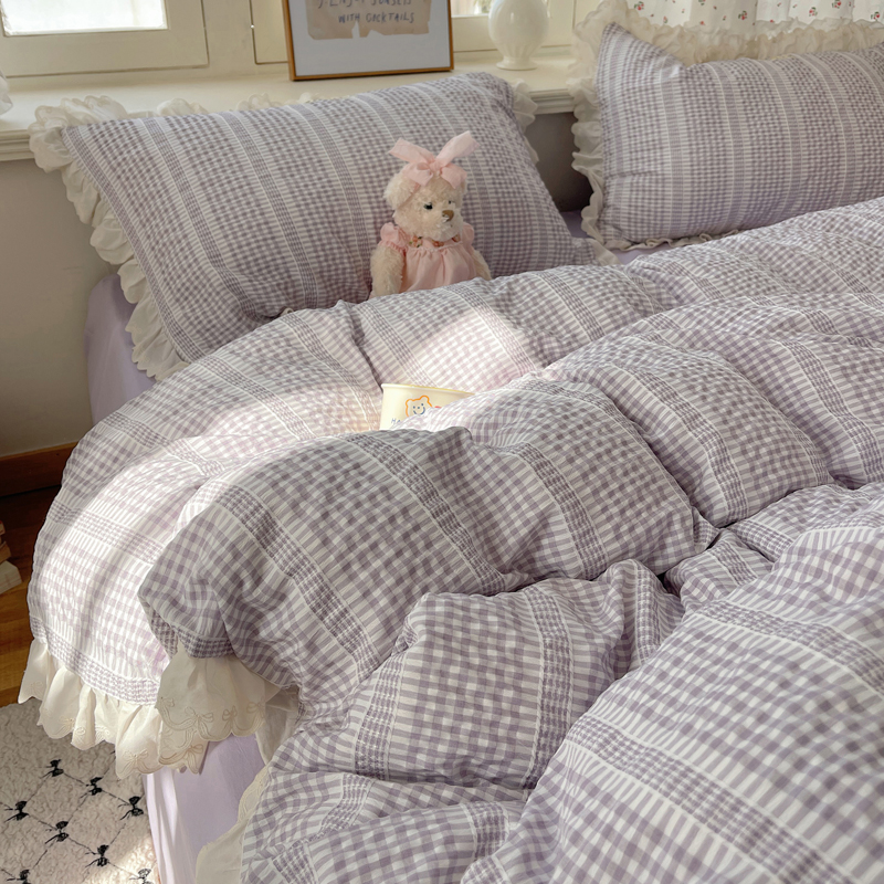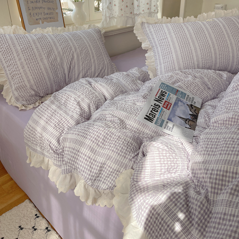 商品名称:轻奢坊 2025新款色织提花格子水洗棉仙仙花边安妮四件套 花边安妮-紫