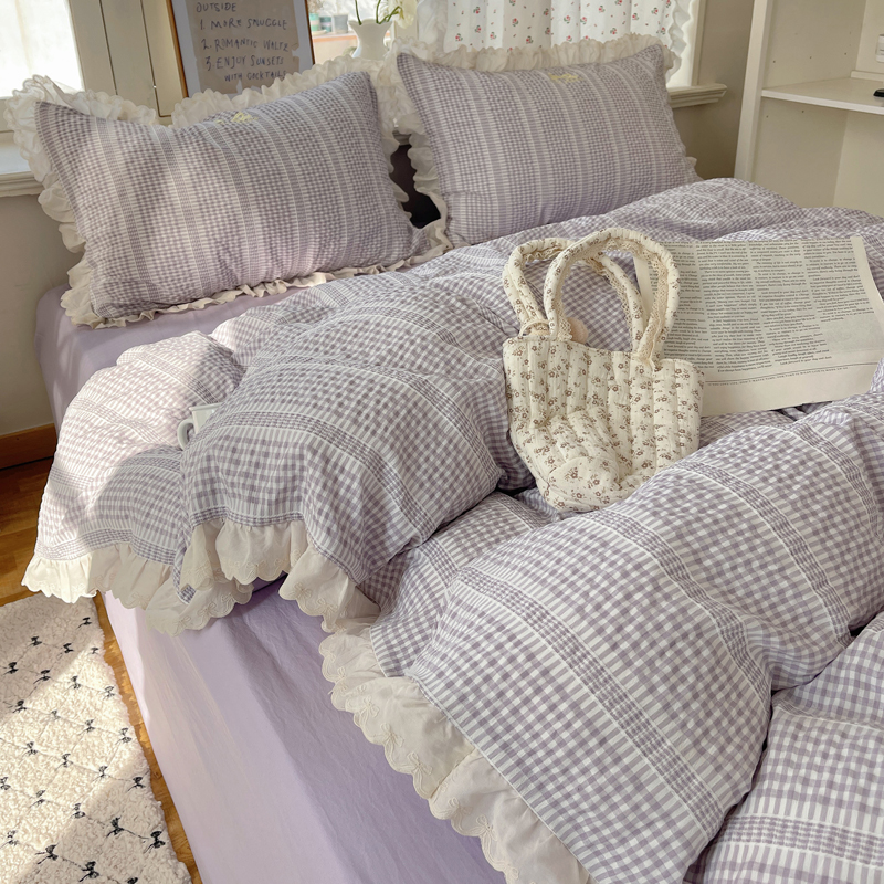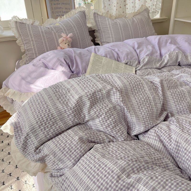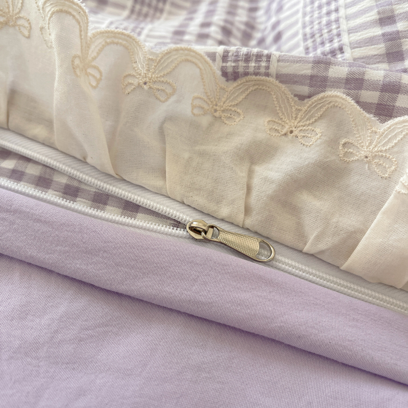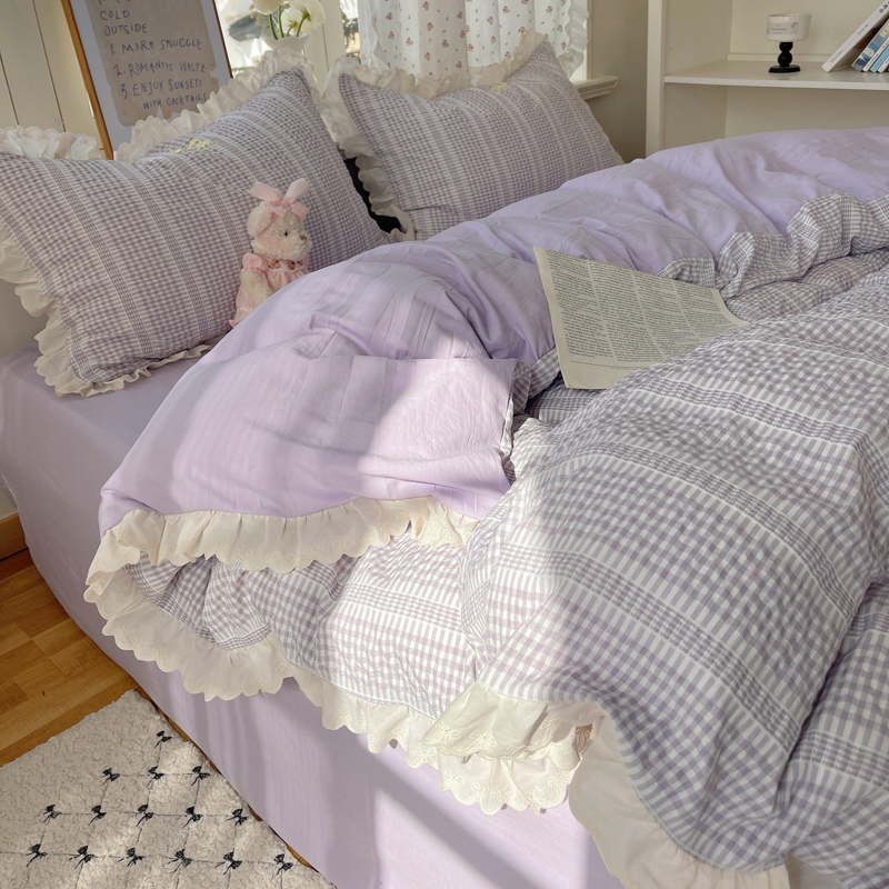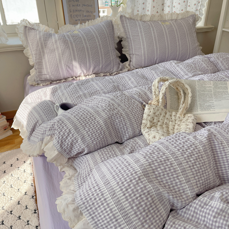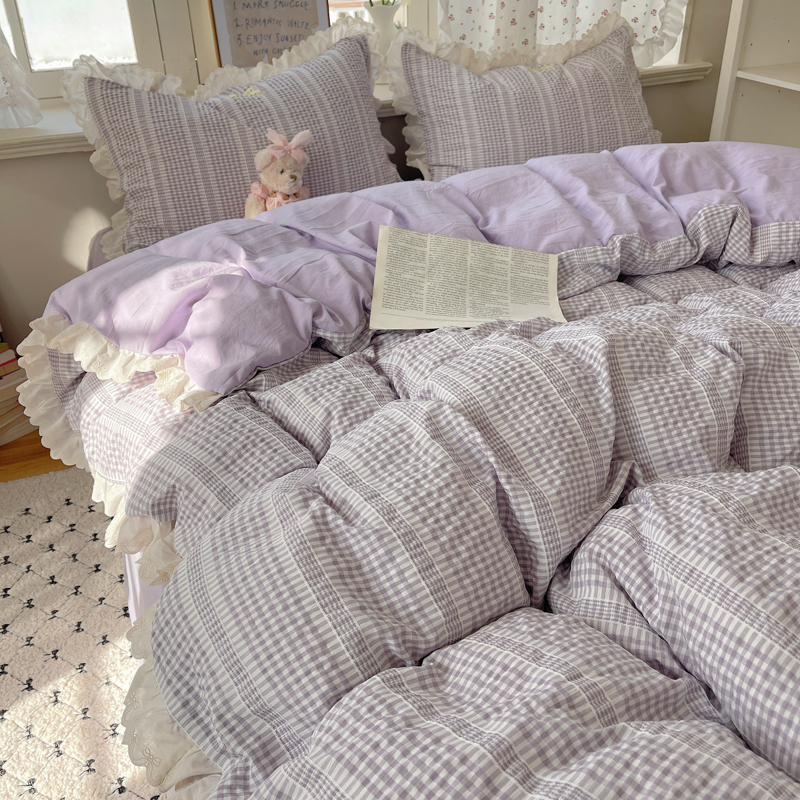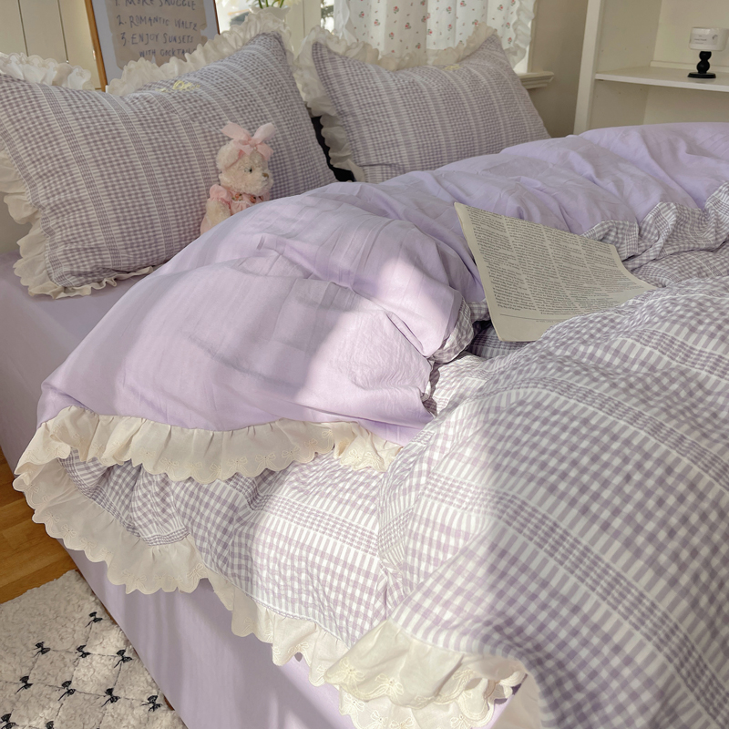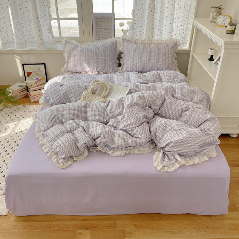商品名称:轻奢坊 2025新款色织提花格子水洗棉仙仙花边安妮四件套 花边安妮-紫