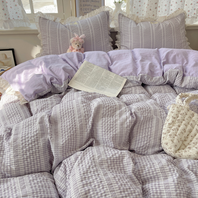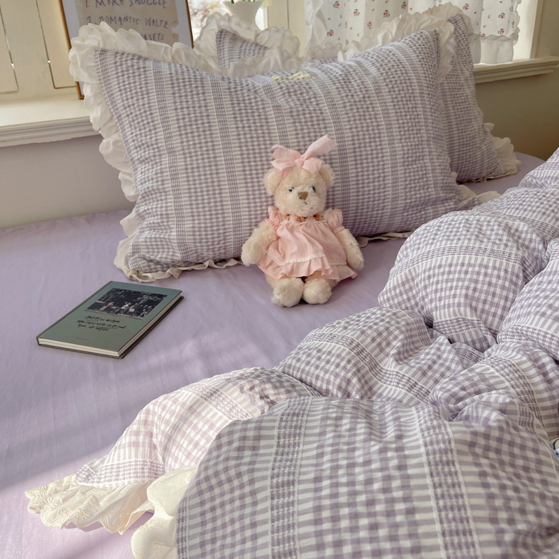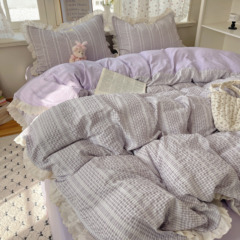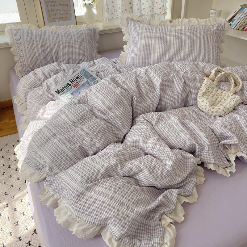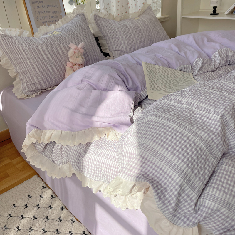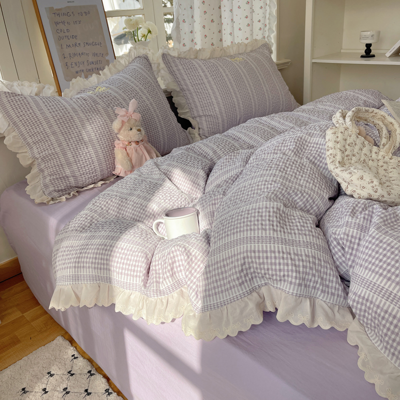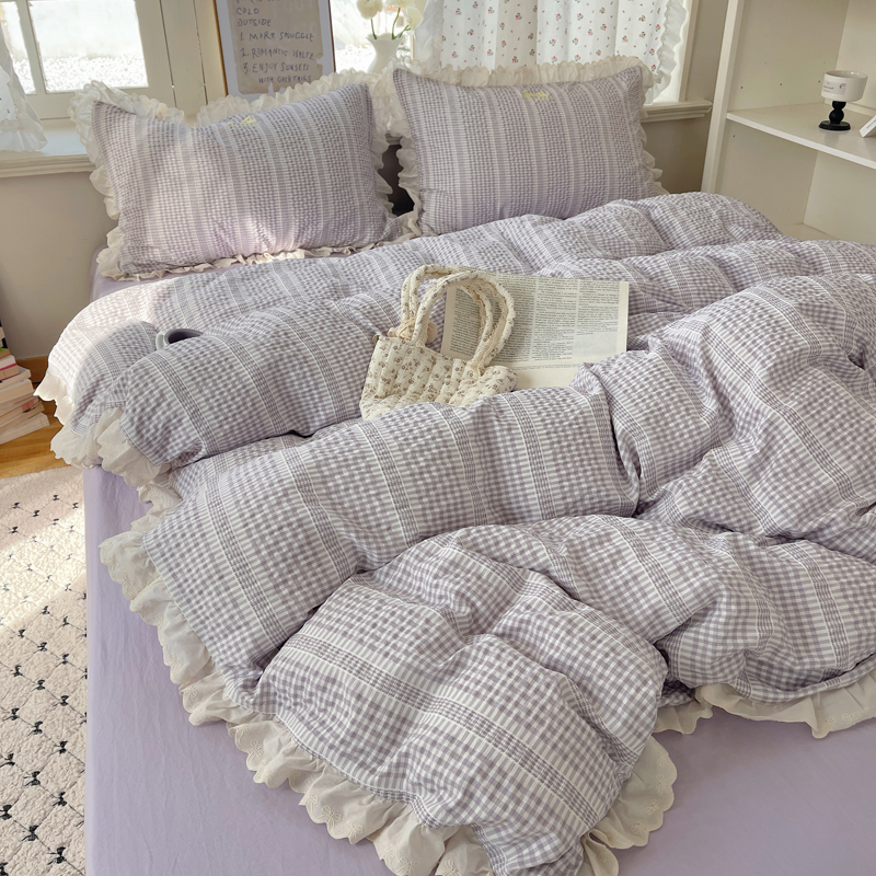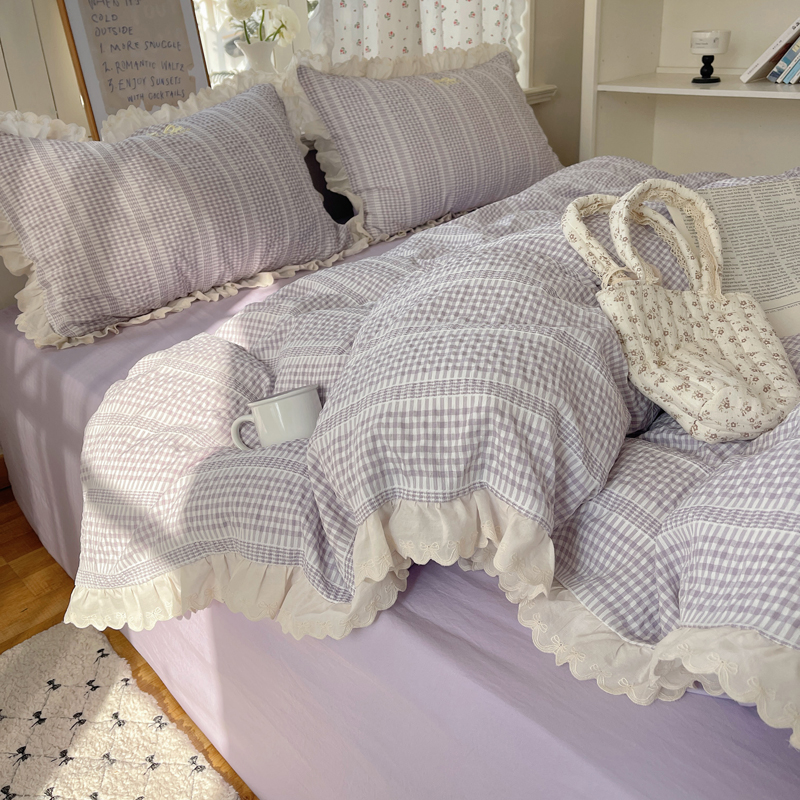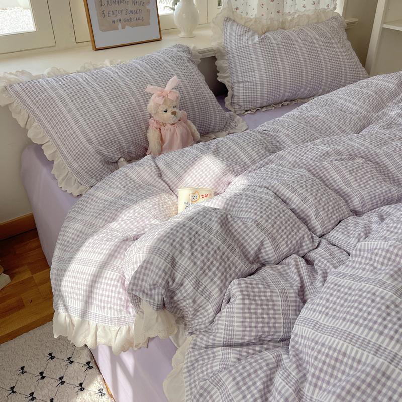 商品名称:轻奢坊 2025新款色织提花格子水洗棉仙仙花边安妮四件套 花边安妮-紫