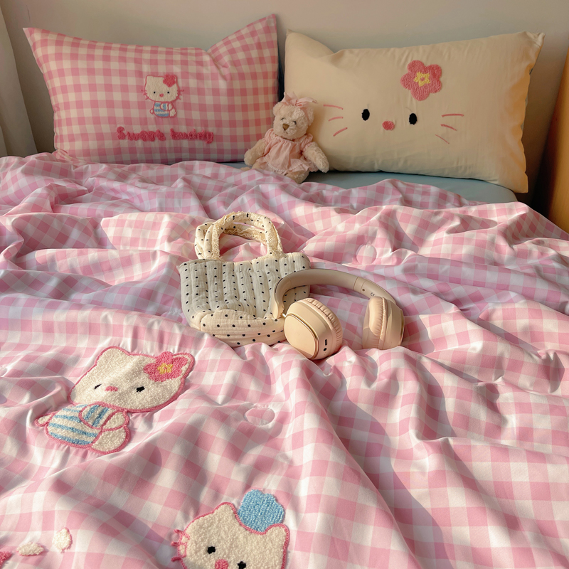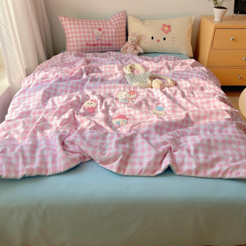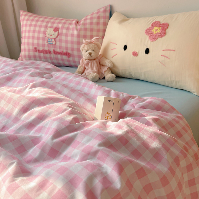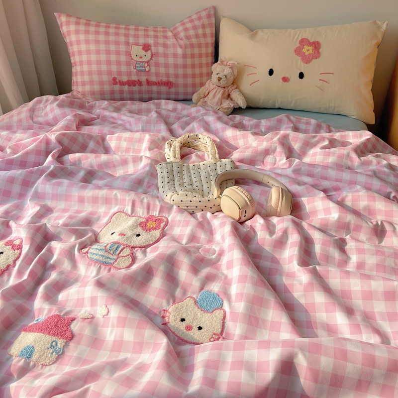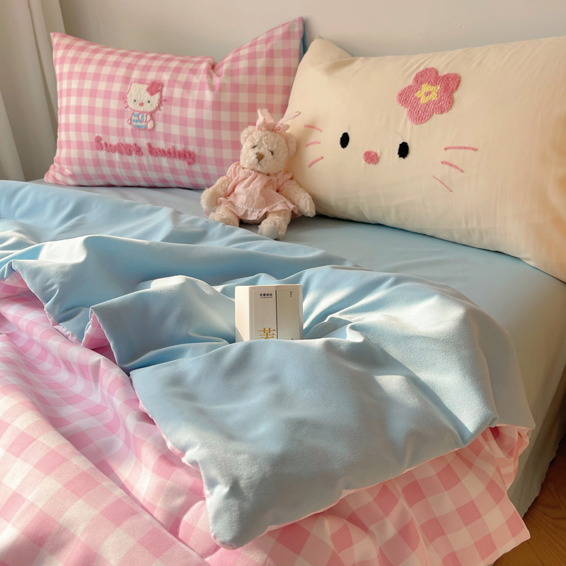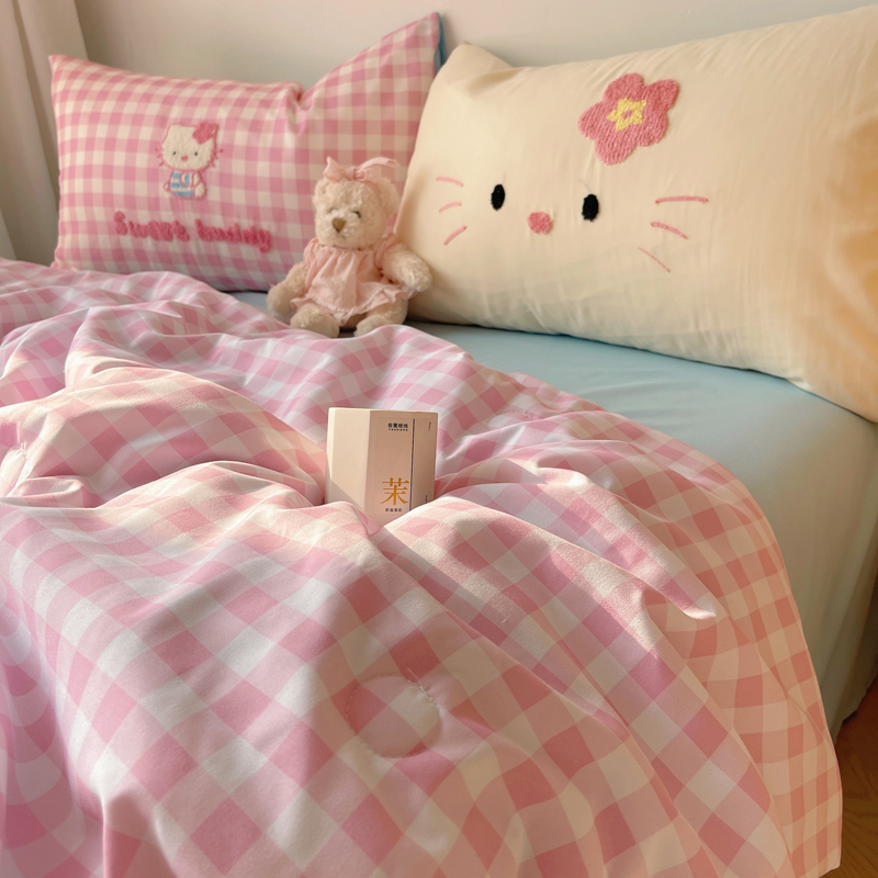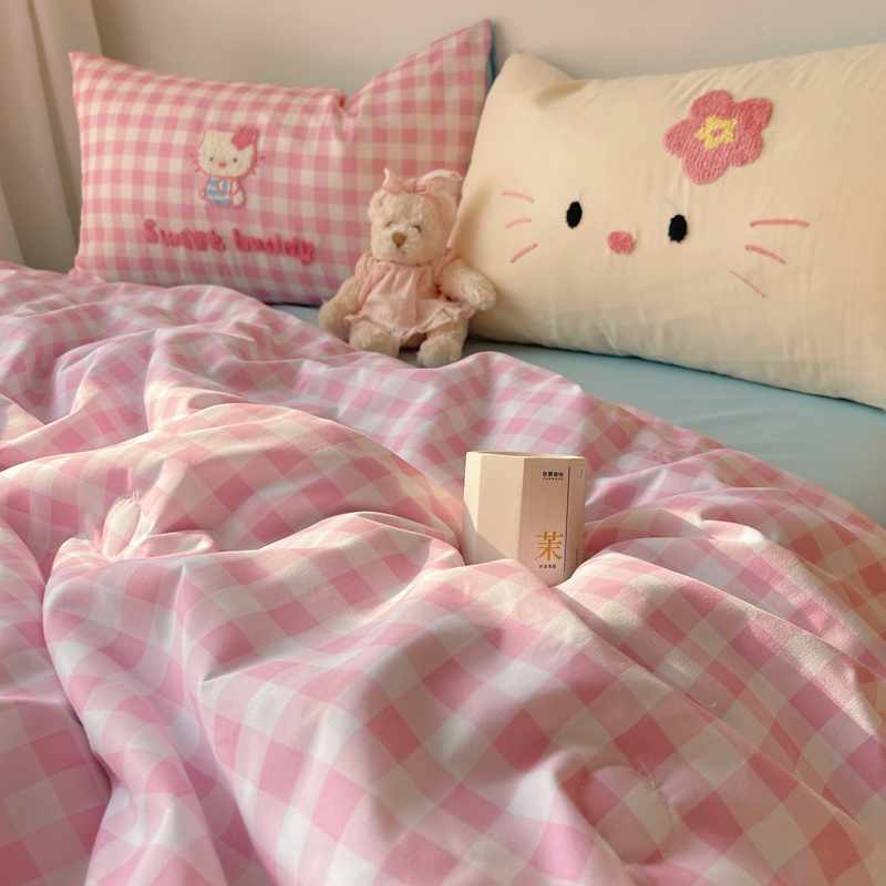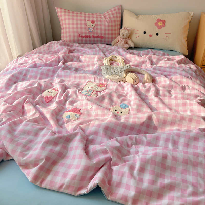 (总)桃喜 2025新款亲肤卡通系列四件套,黄格小熊,拼接甜心猫
