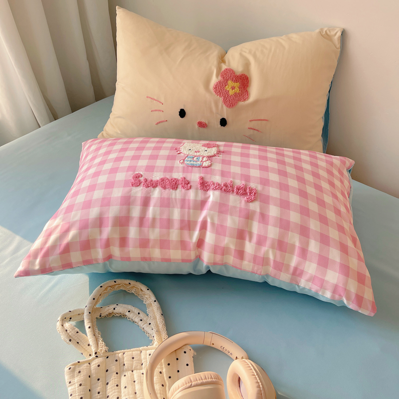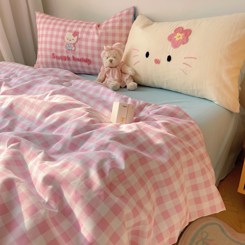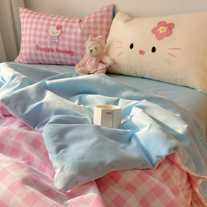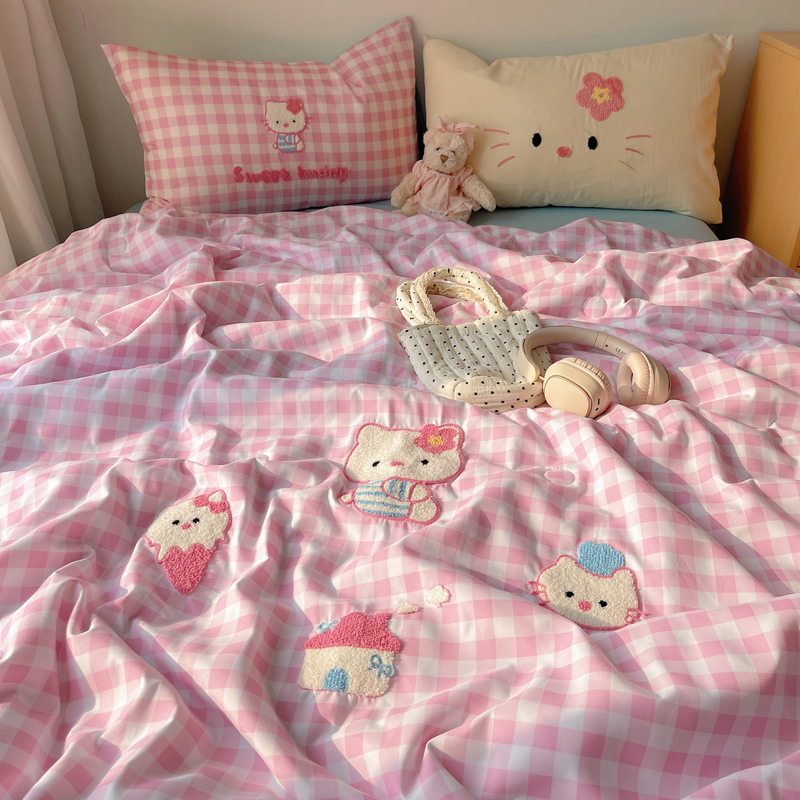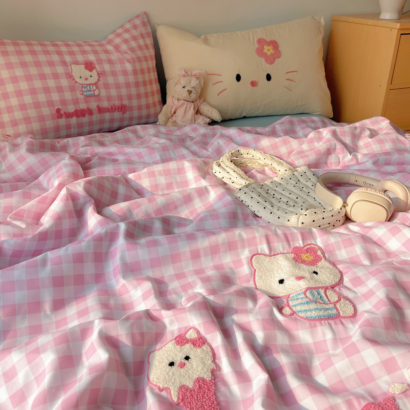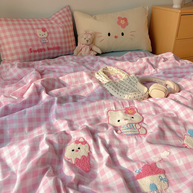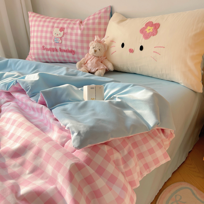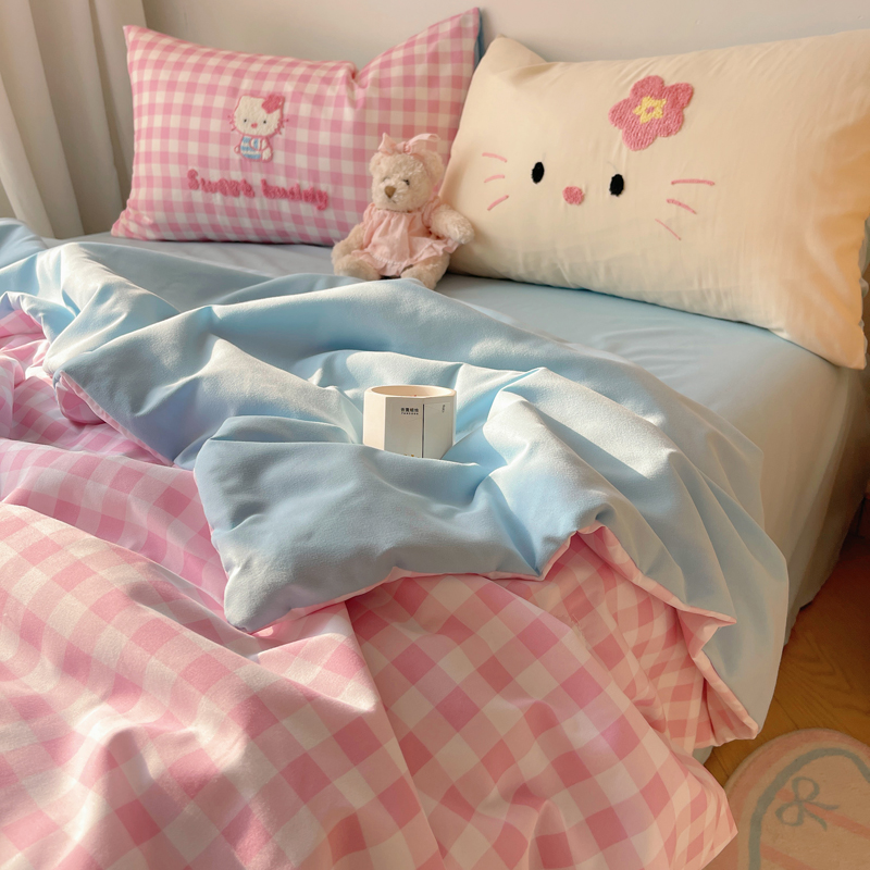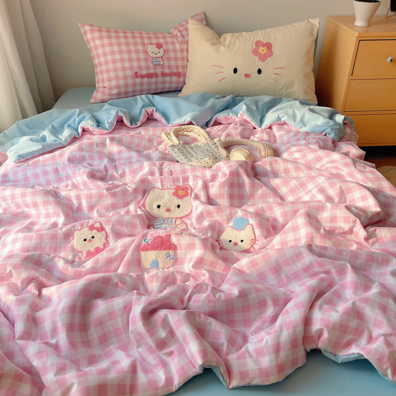 (总)桃喜 2025新款亲肤卡通系列四件套,黄格小熊,拼接甜心猫
