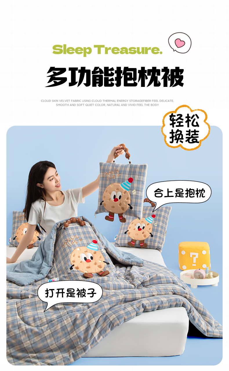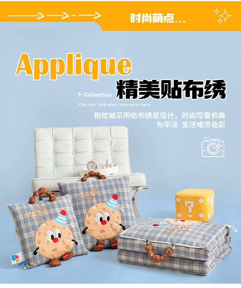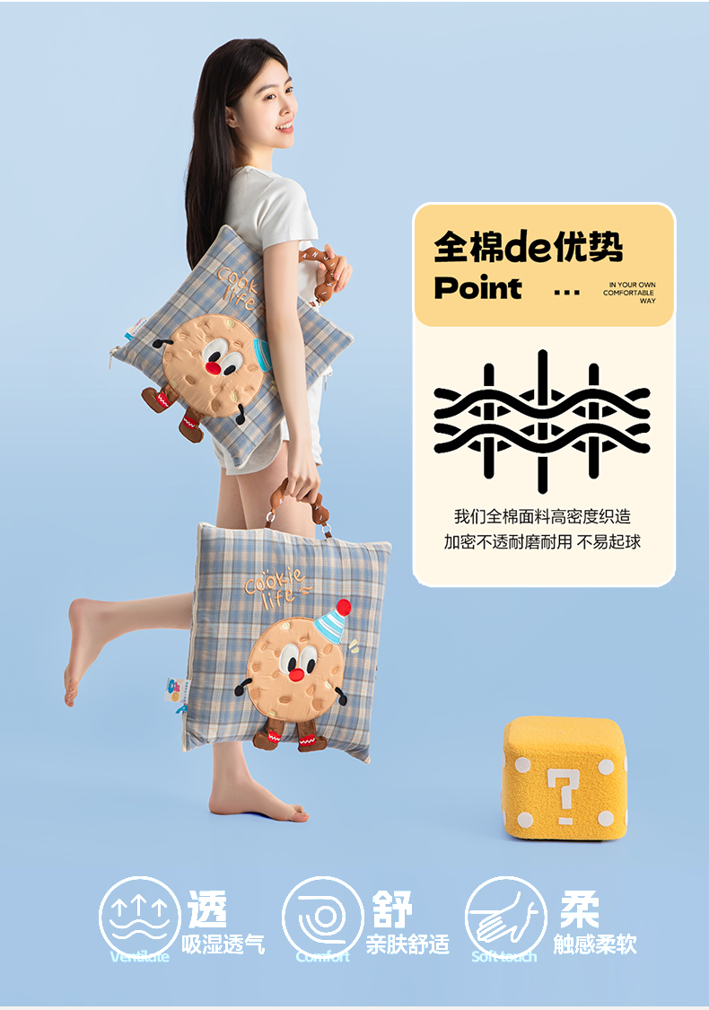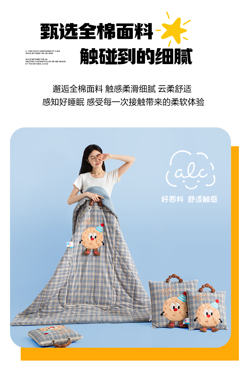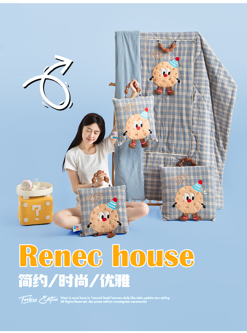 商品名称:雷娜家居 2025新款全棉手提款曲奇系列抱枕被 全棉曲奇蓝