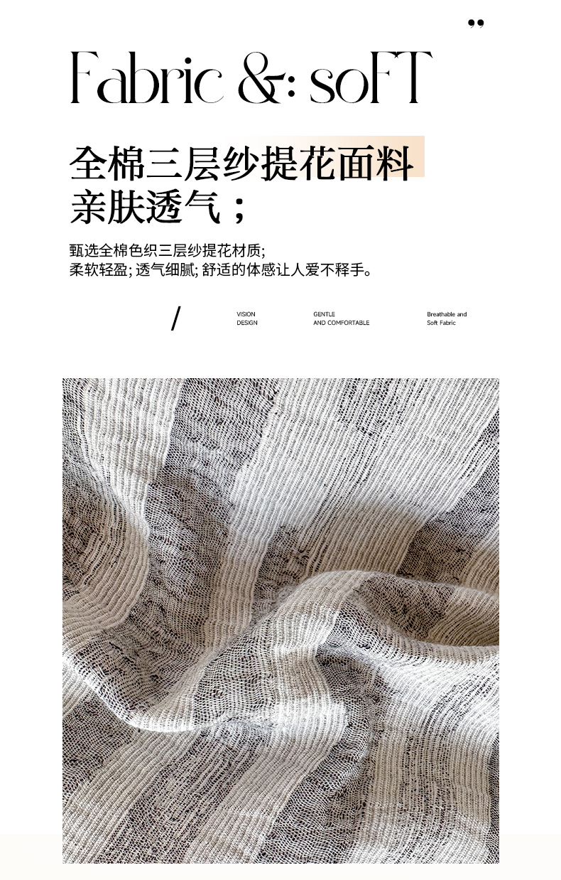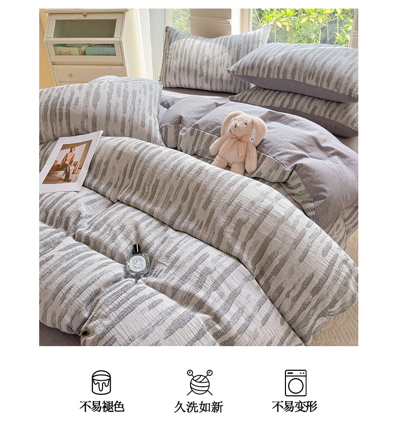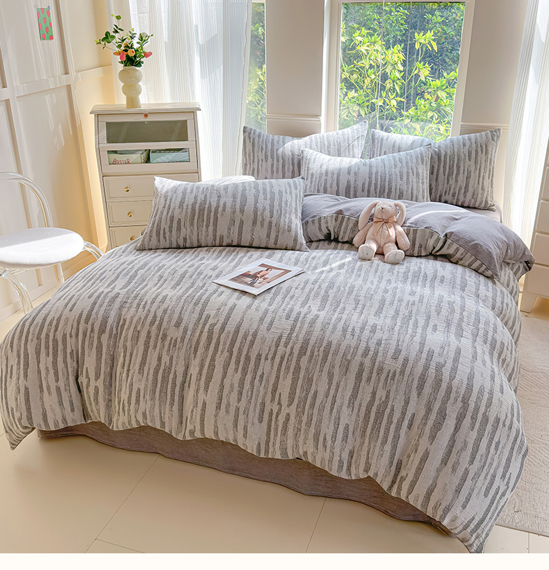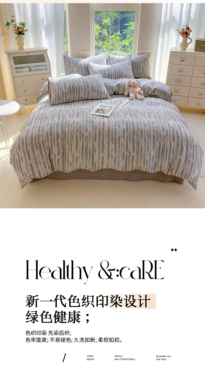 当前位置: 91家纺网 > 商品网购 > 床品套件 > 四件套 > 色织四件套 > 菡宝 2025新款a类母婴级纯棉全棉纯棉色织三层纱提花系列四件套 艾瑞-灰