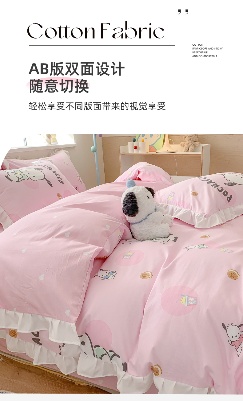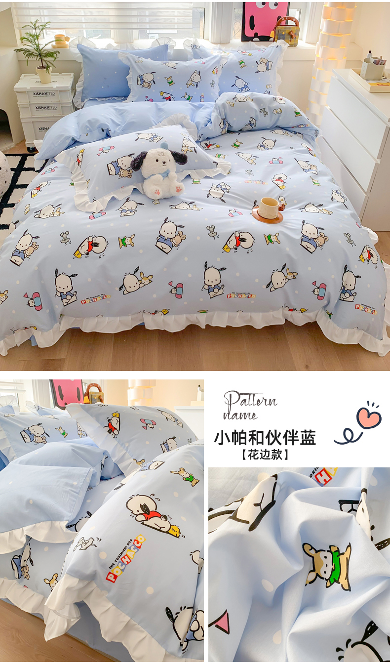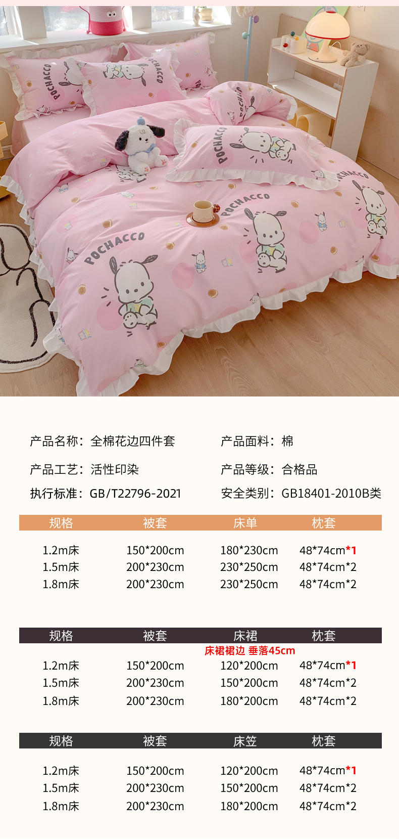 当前位置: 91家纺网 > 商品网购 > 床品套件 > 四件套 > 全棉普通四件套 > 玉元坊 2025年5月新品 三丽鸥花边被套全棉床单纯棉床裙床笠三四件套-帕恰狗系列 开心帕恰狗【花边款式】