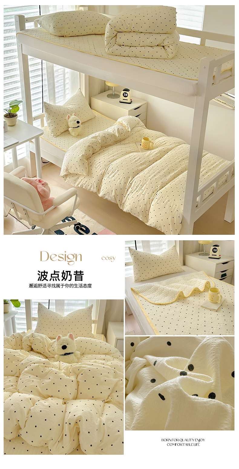 美梦家纺2025新款木棉皱皱纱学生床盖四件套 波点奶昔