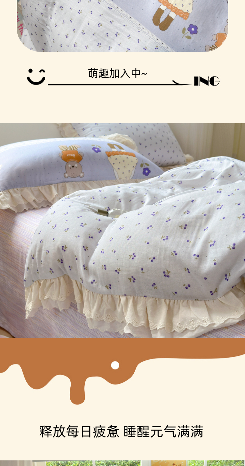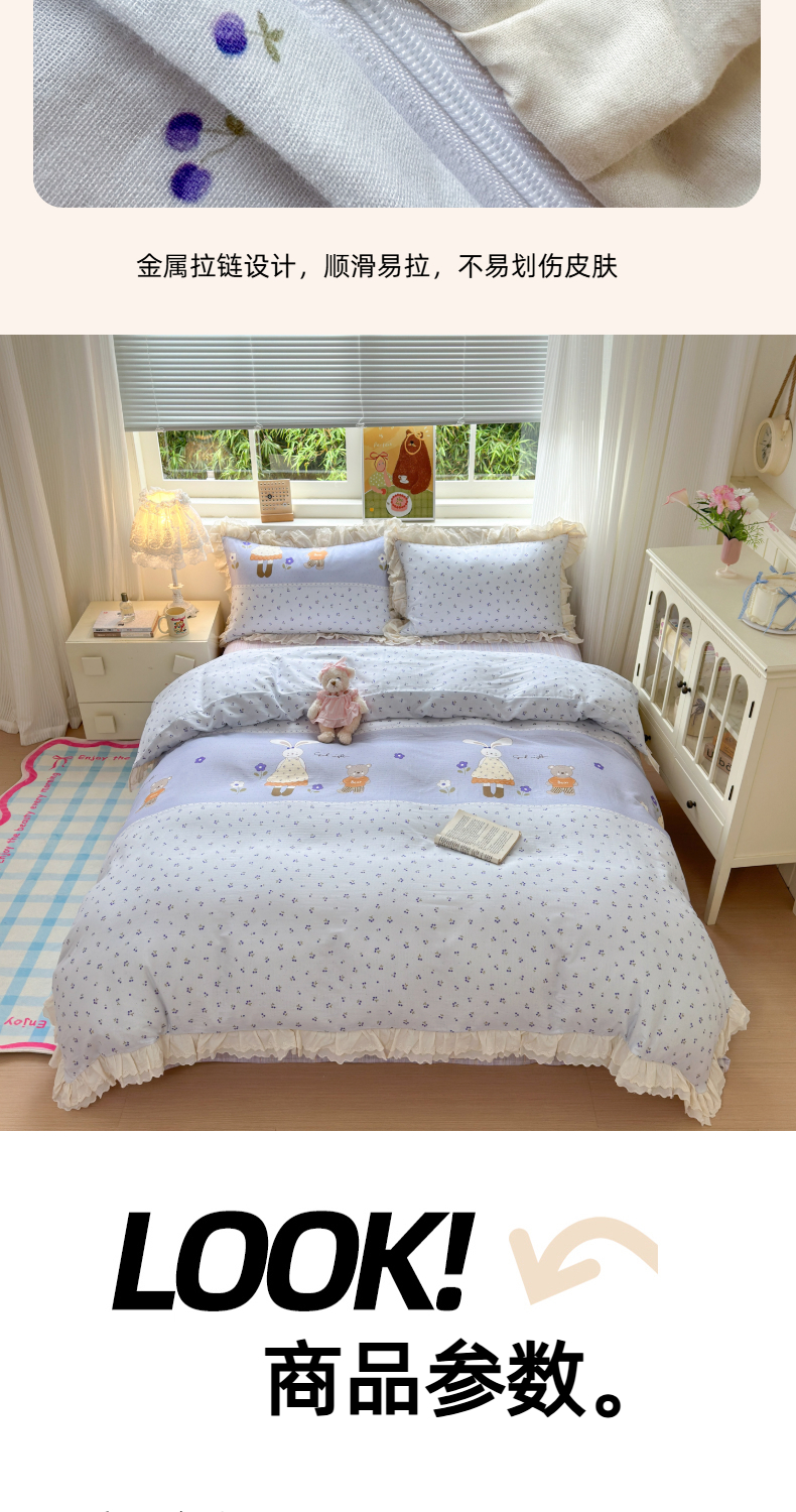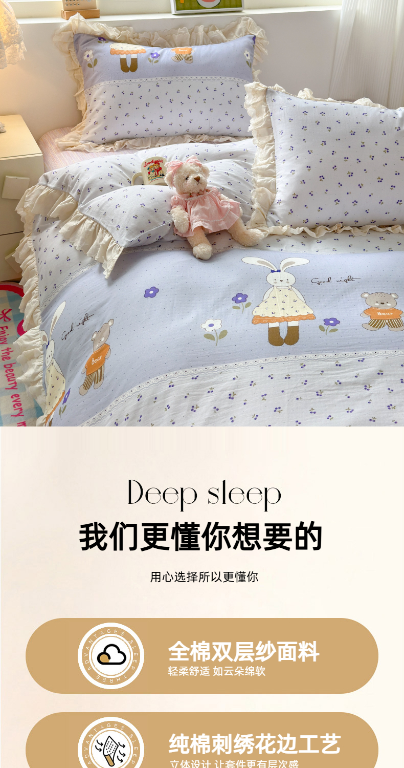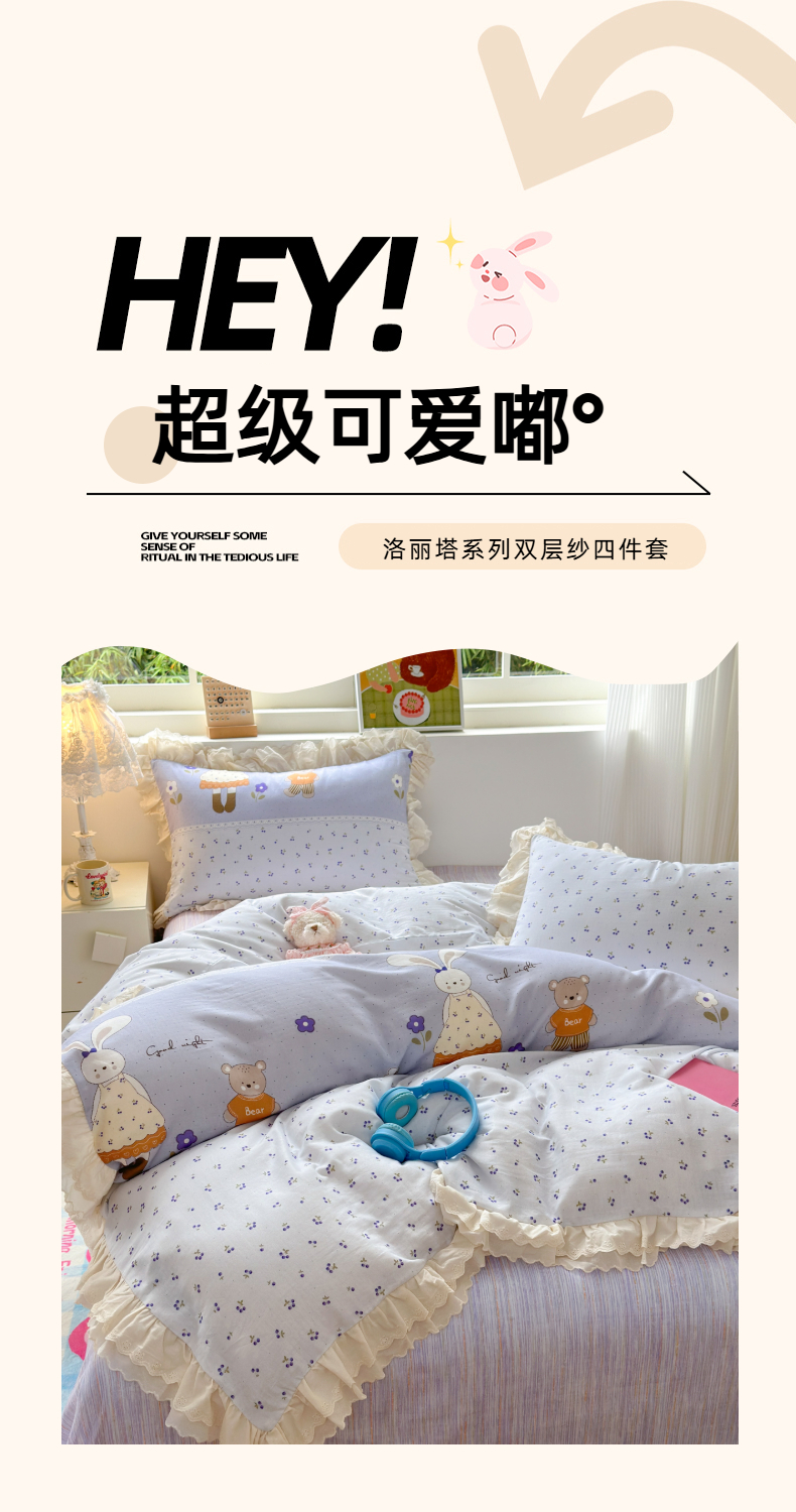 当前位置: 91家纺网 > 商品网购 > 床品套件 > 四件套 > 双层纱四件套 > 淑女公社家纺 2025新款全棉双层纱四季款洛丽塔风格四件套 兔小姐和小熊紫