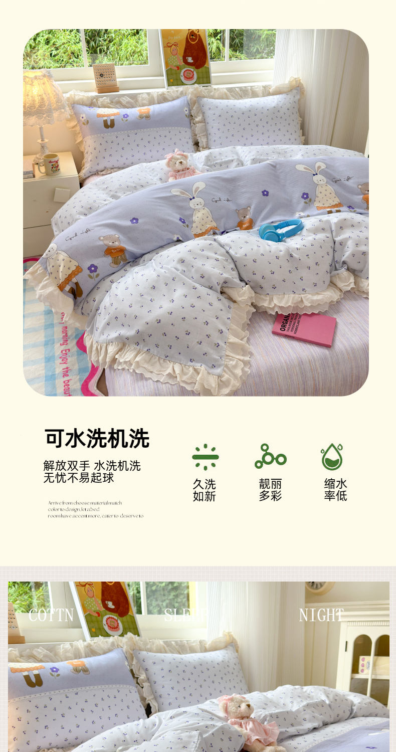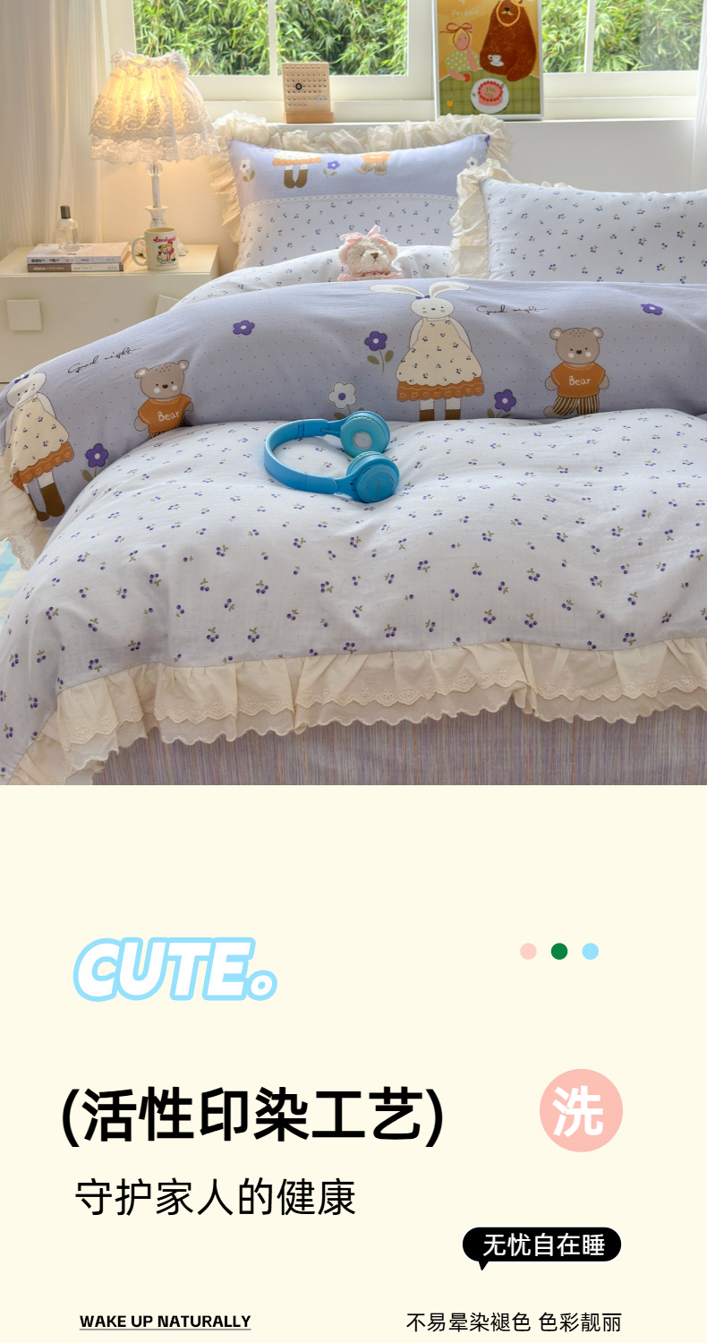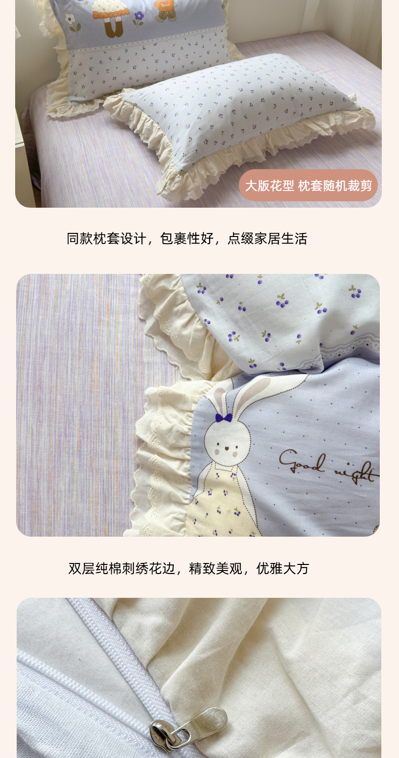 当前位置: 91家纺网 > 商品网购 > 床品套件 > 四件套 > 双层纱四件套 > 淑女公社家纺 2025新款全棉双层纱四季款洛丽塔风格四件套 兔小姐和小熊紫