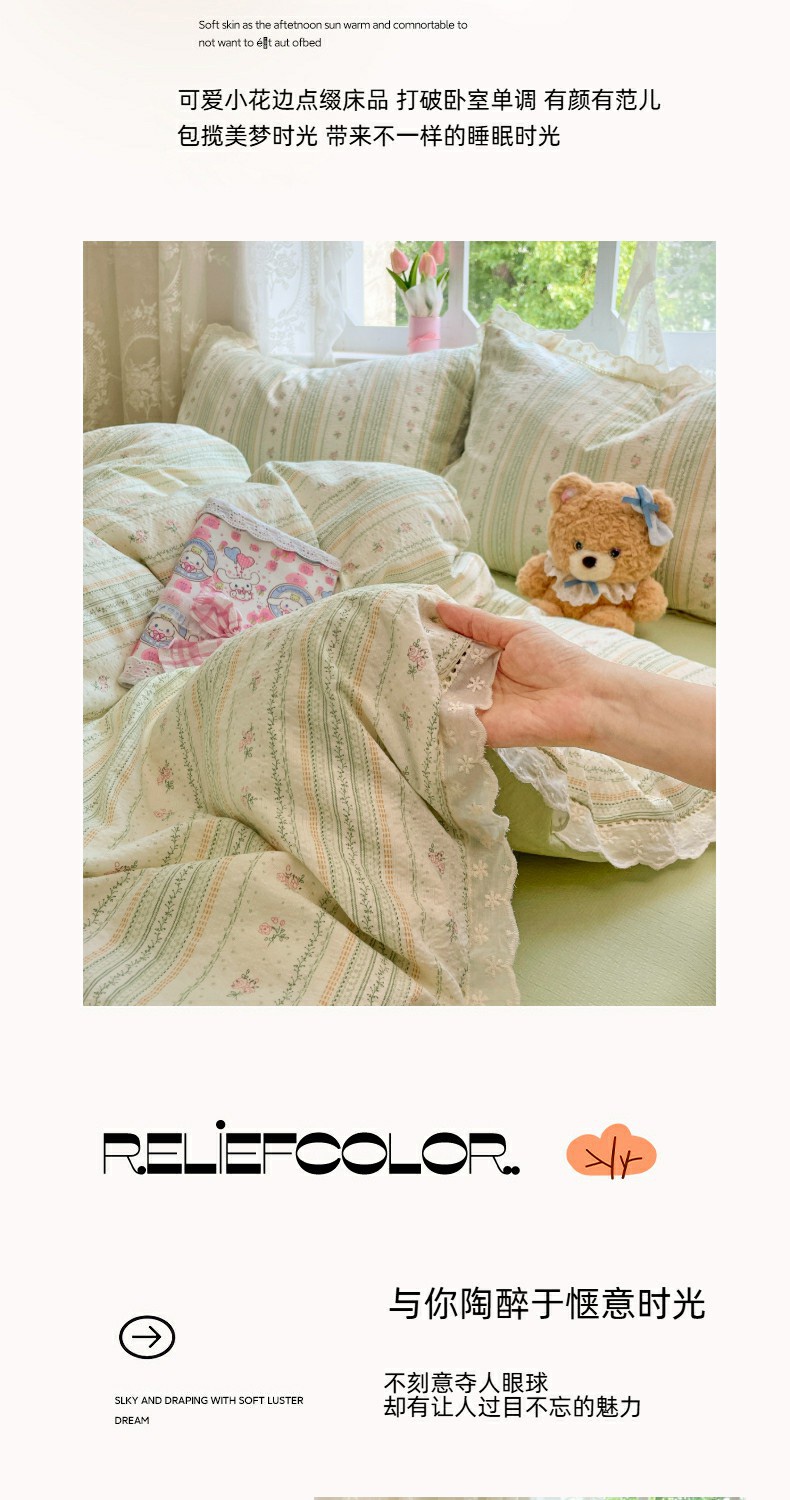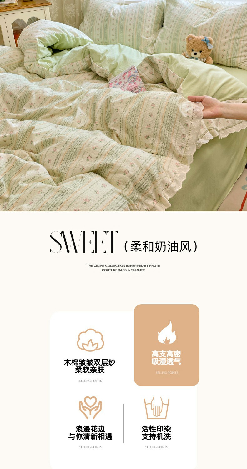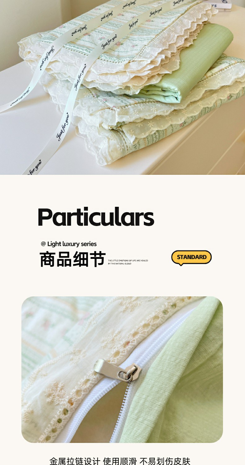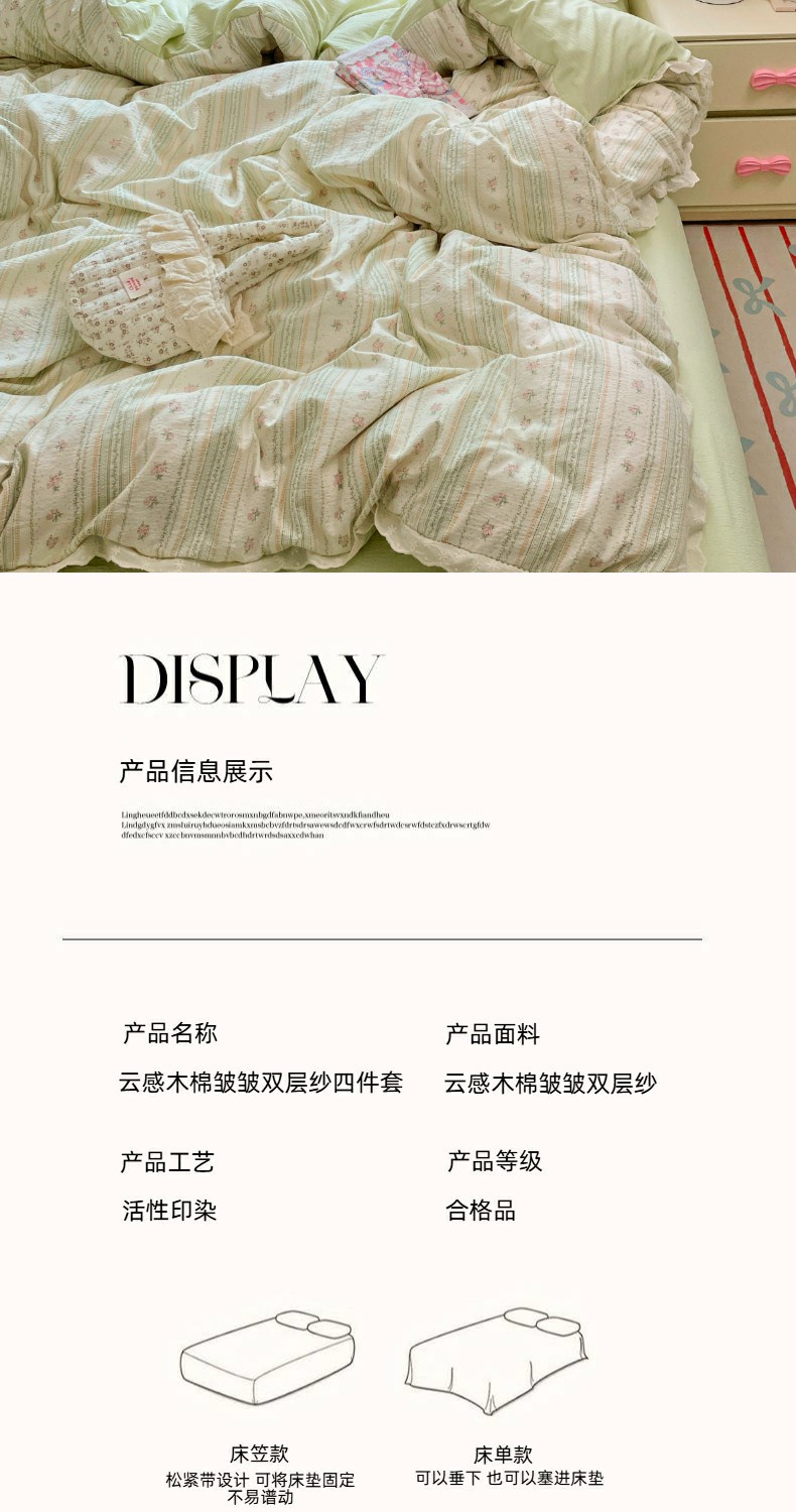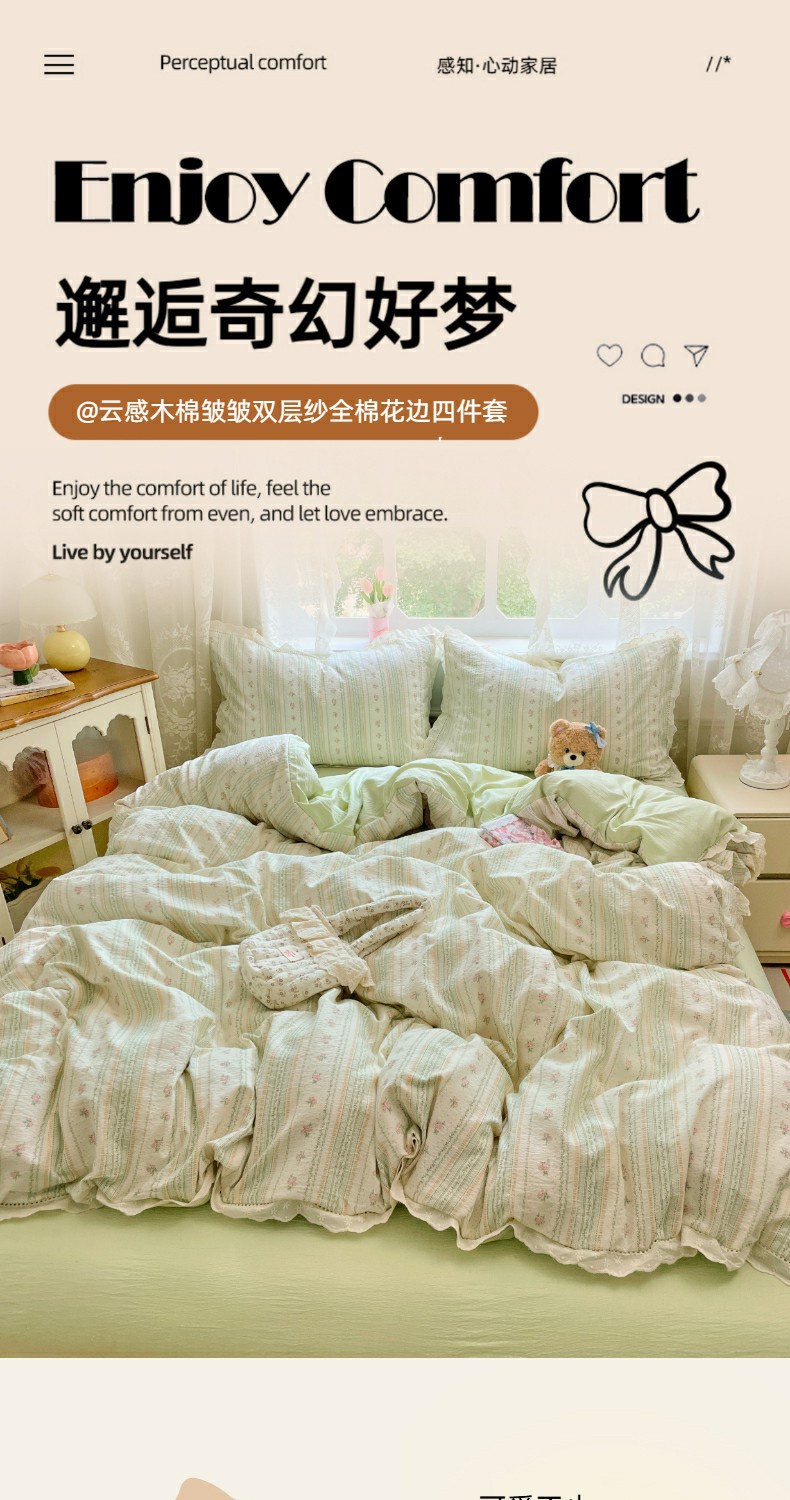 当前位置: 91家纺网 > 商品网购 > 床品套件 > 四件套 > 全棉普通四件套 > 优佳优品 2025新款A类云感木棉皱皱双层纱全棉镂空花边四件套(提供买家秀) 君心莫莉