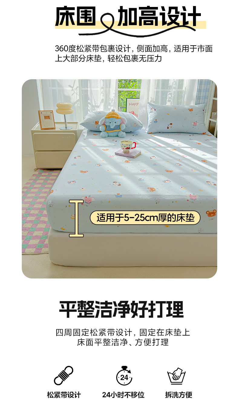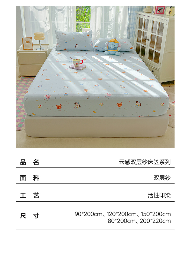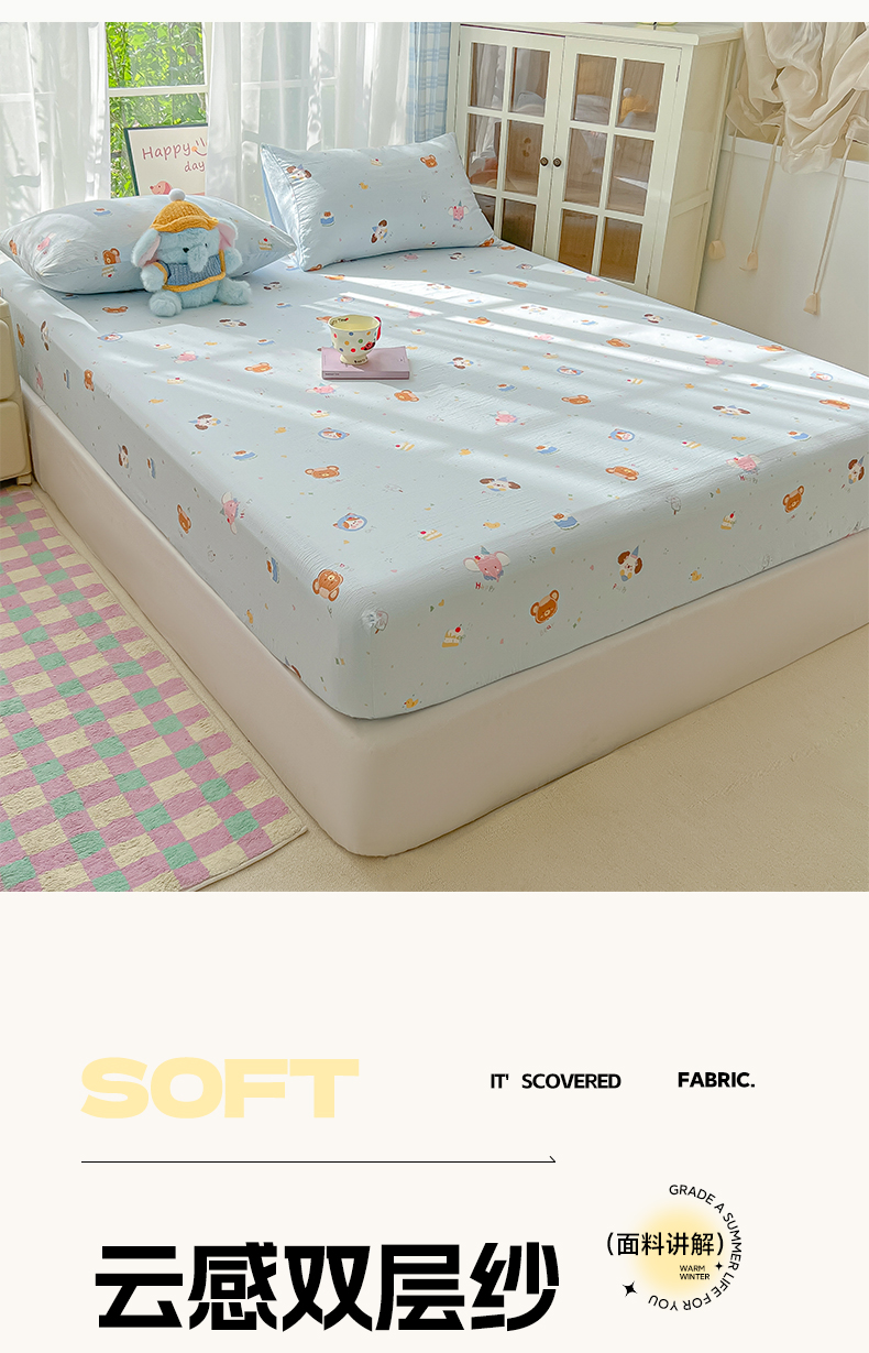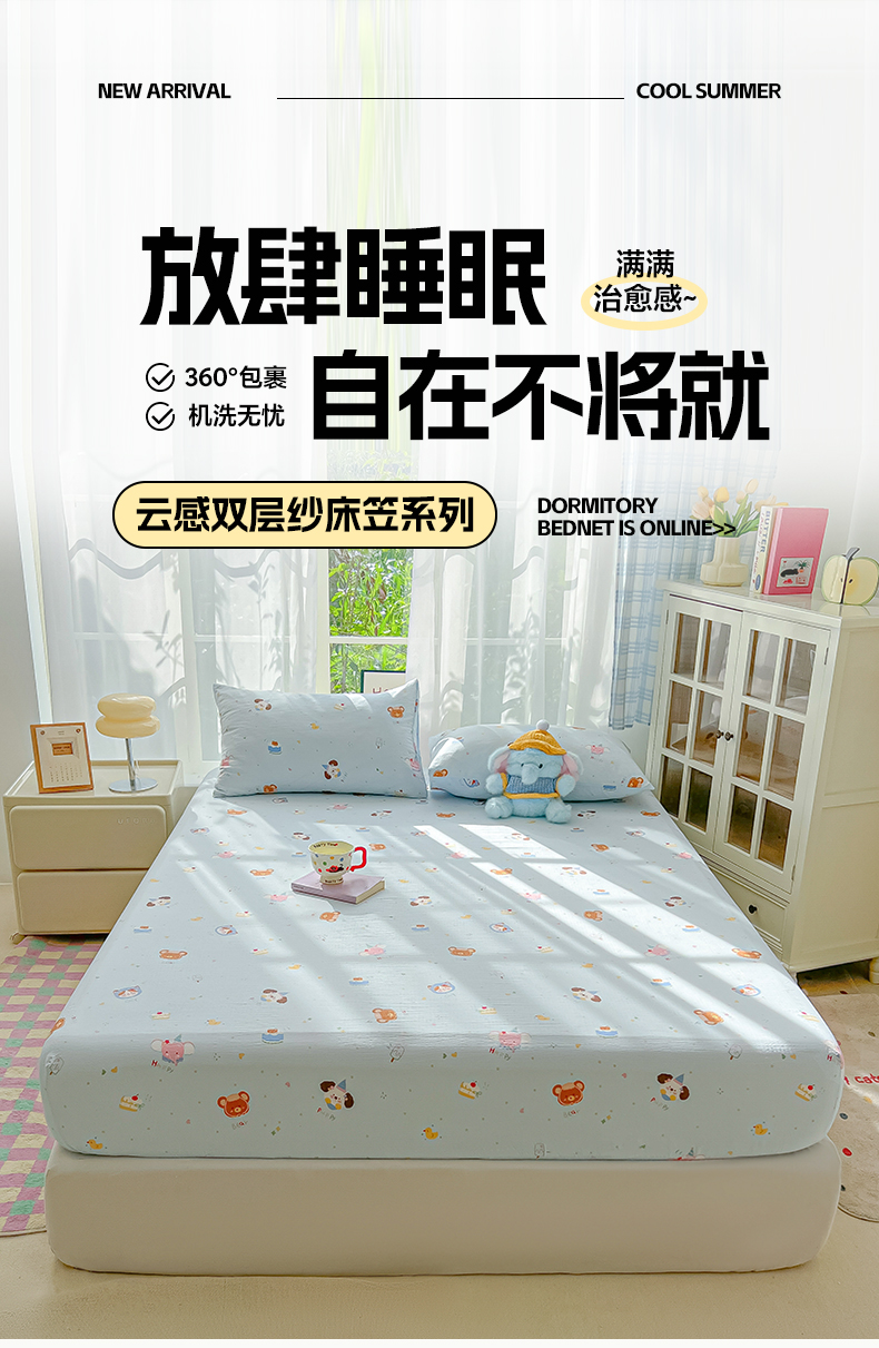 • 91家纺网 家纺一手货源 找家纺 韩巢家纺 2025新款卡通双层纱床笠单品床笠床笠单件热销款防滑床单床套枕套三件套 生日宴会兰