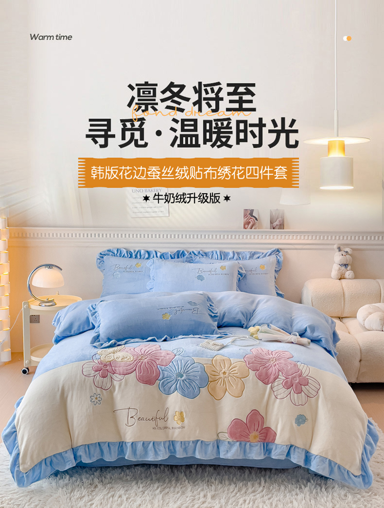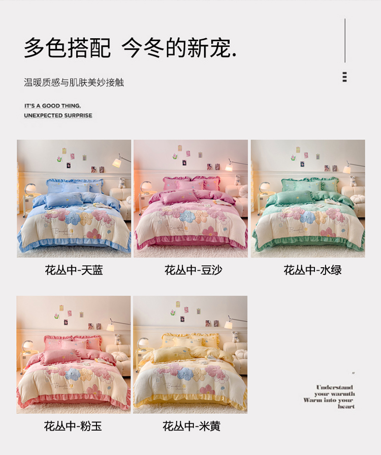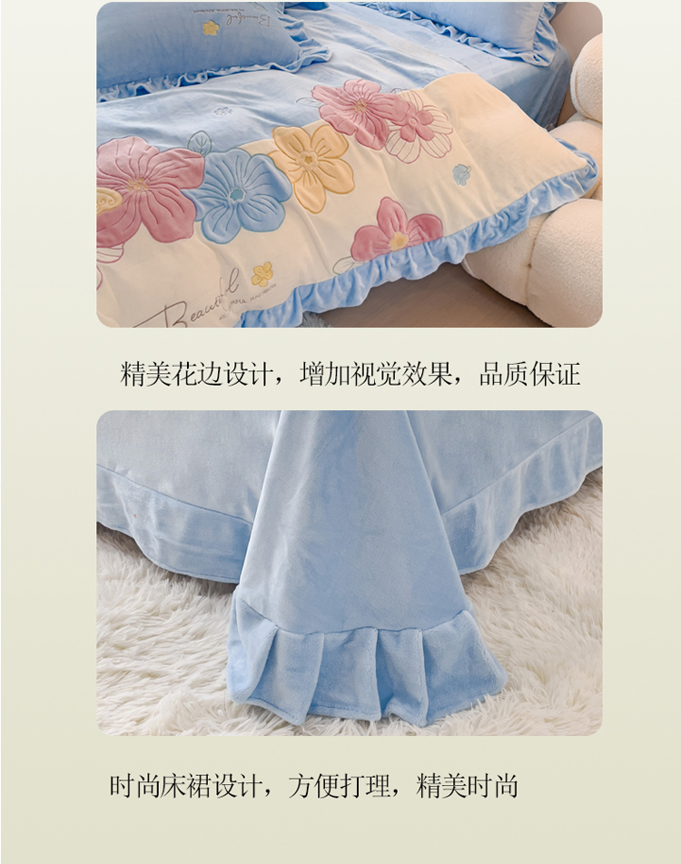 (总) 2025韩版双花边多功能AB面牛奶绒四件套甜美仙女法式花边韩式小碎花印花牛奶绒四件套加绒保暖单被套罩,紫韵花开,富贵花开,简约之家,花语,梦幻花园,春暖花开