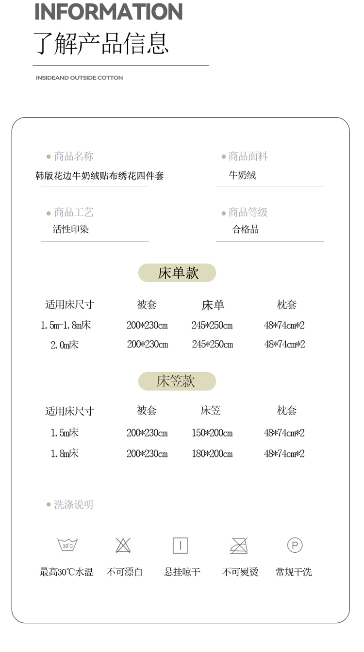 商品名称:(总)【苏东来】高端韩版少女心法式花边公主风纯色牛奶绒贴布绣刺绣四件套小清新兔毛绒法莱绒绣花床盖被套四件套