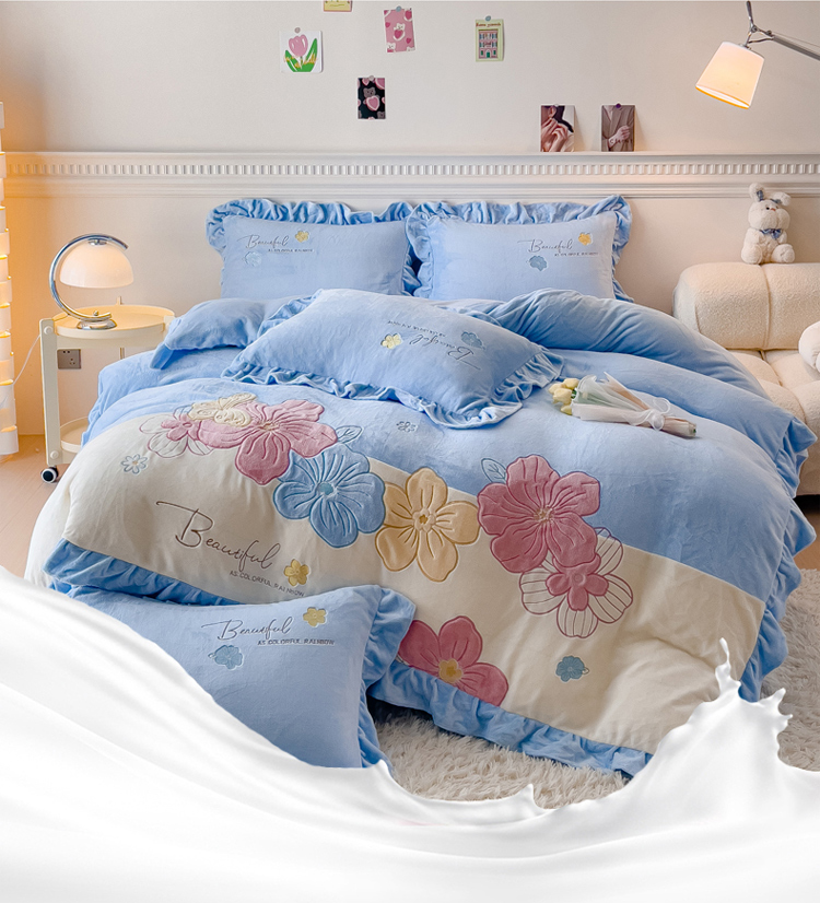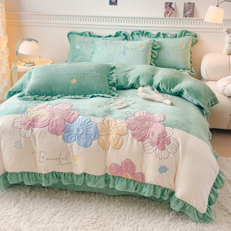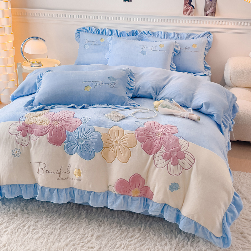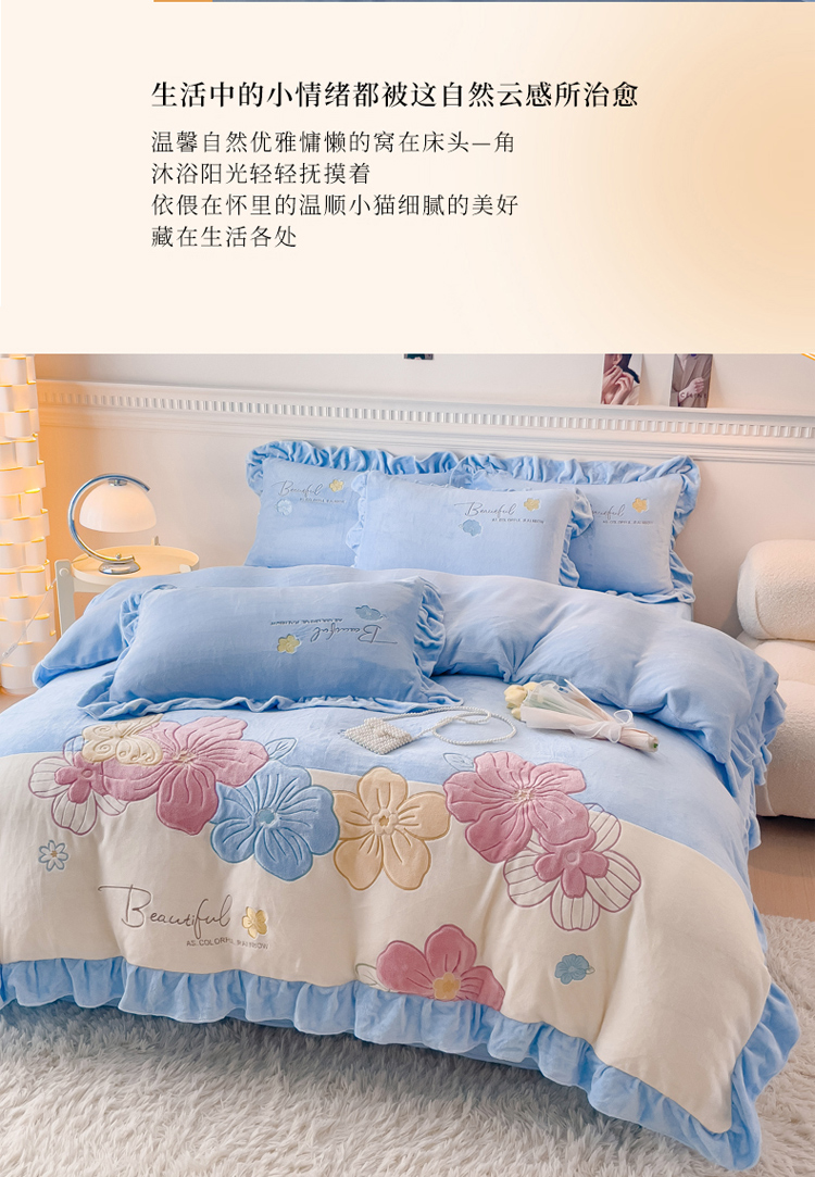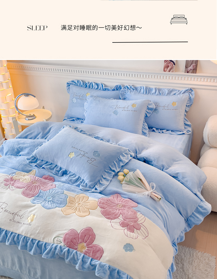 (总)【苏东来】2025高端韩版花边纯色甜美公主赫本风立体盘花牛奶绒刺绣花四件套清新少女婴儿法莱兔绒四件套,花开浪漫粉色,花开浪漫天蓝,花开浪漫水绿,花开浪漫米黄,花开浪漫豆沙
