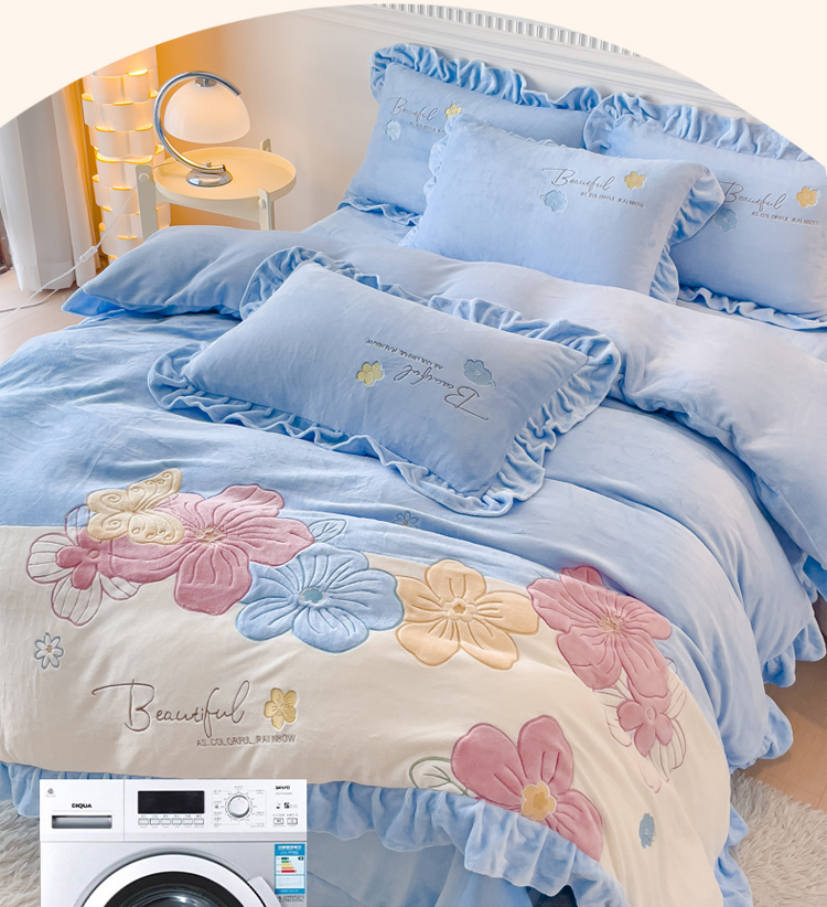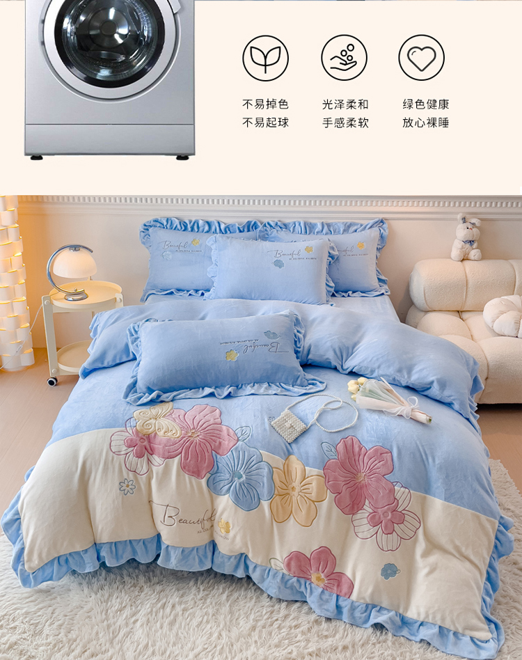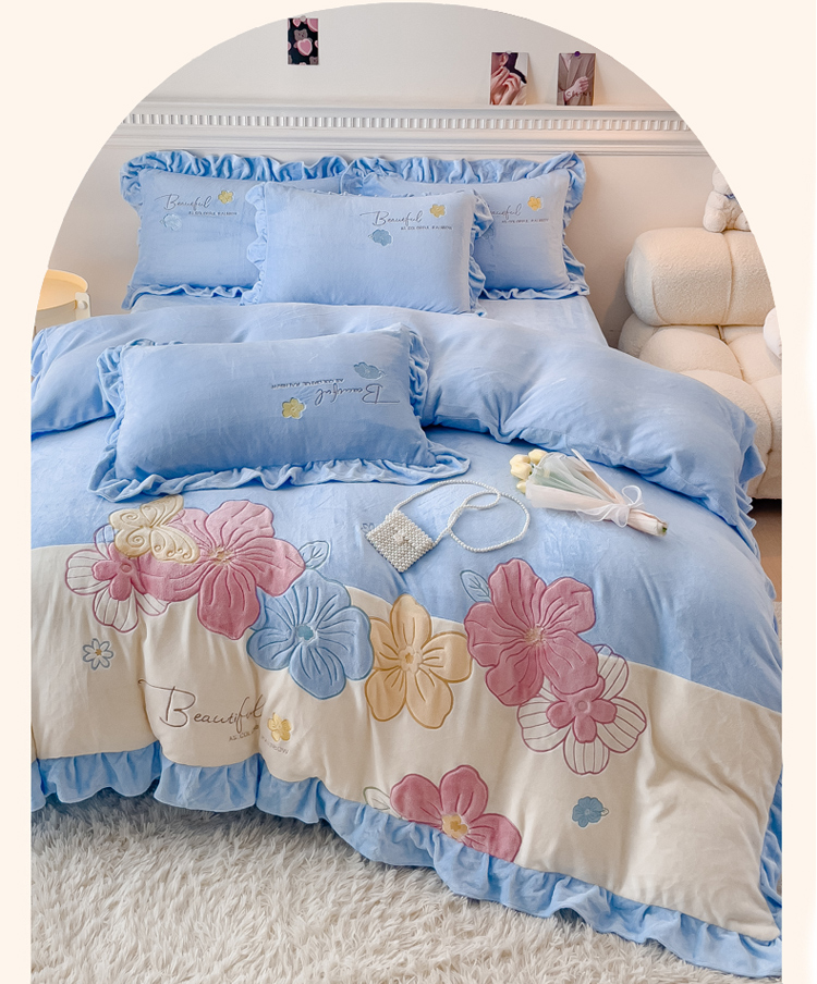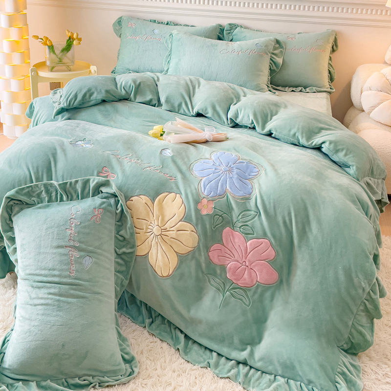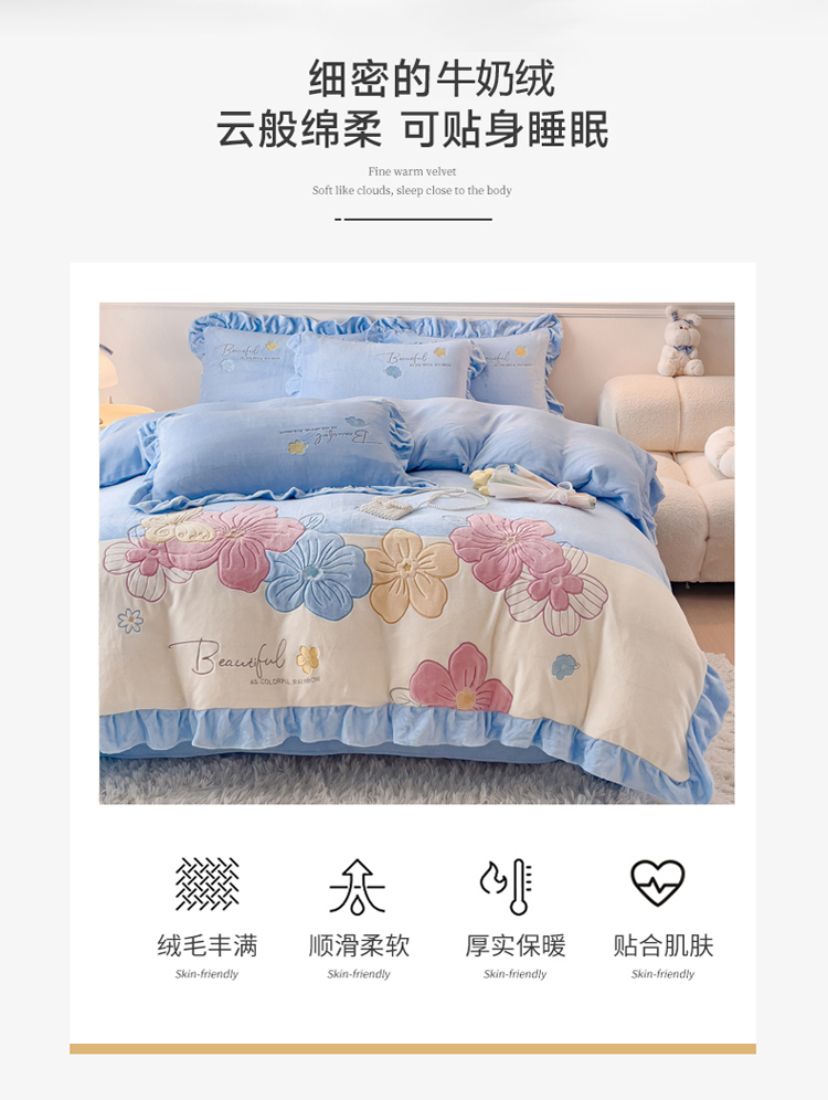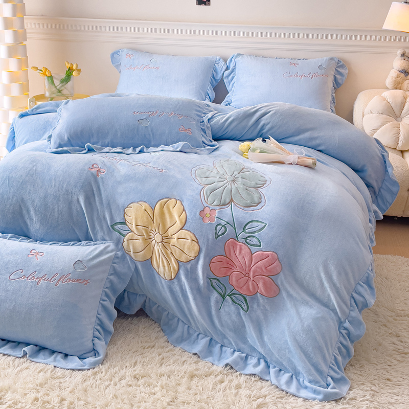 (总)【苏东来】2025高端韩版花边纯色甜美公主赫本风立体盘花牛奶绒刺绣花四件套清新少女婴儿法莱兔绒四件套,花开浪漫粉色,花开浪漫天蓝,花开浪漫水绿,花开浪漫米黄,花开浪漫豆沙