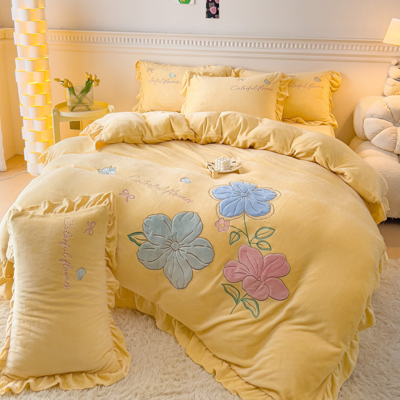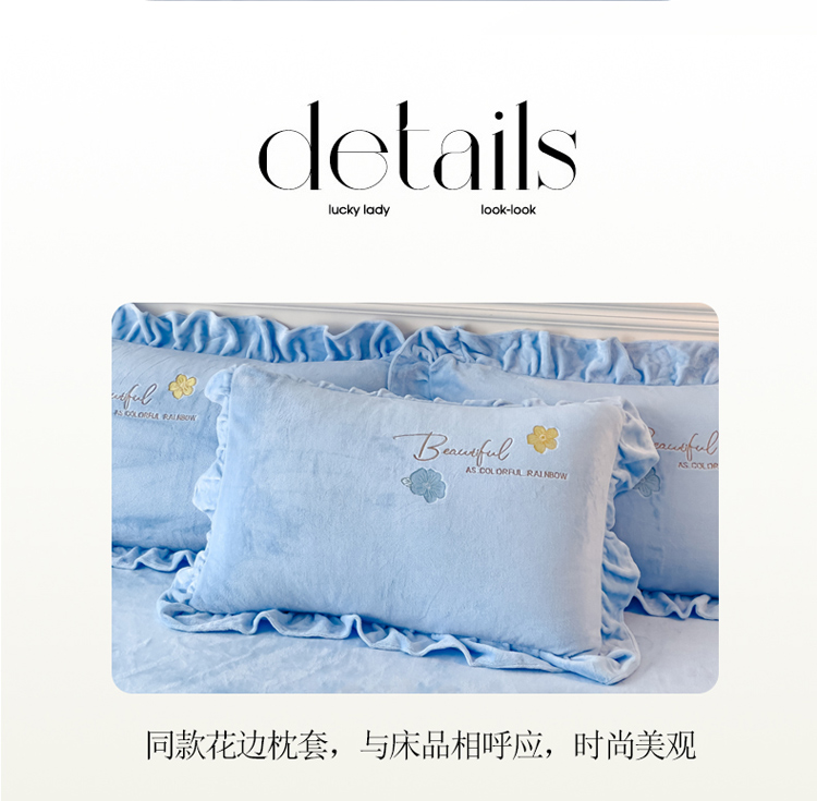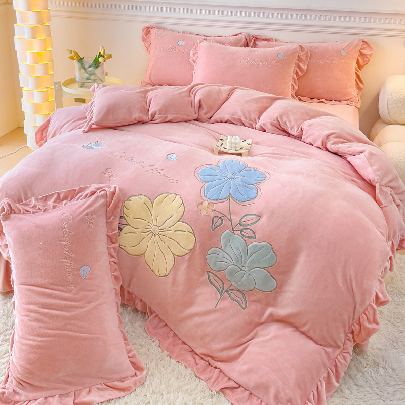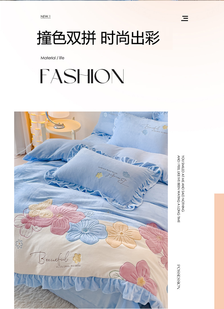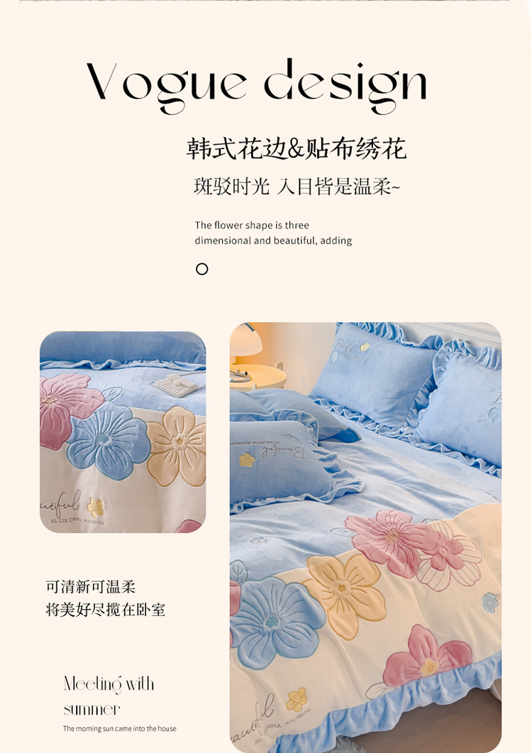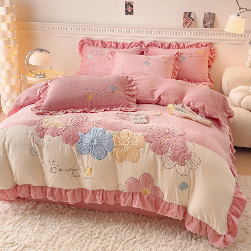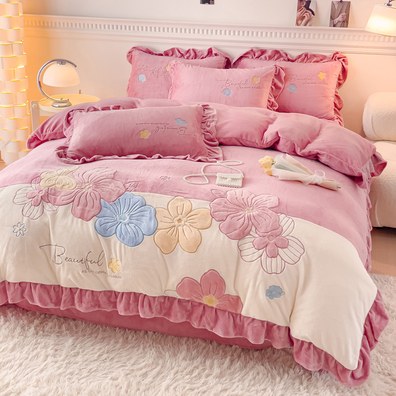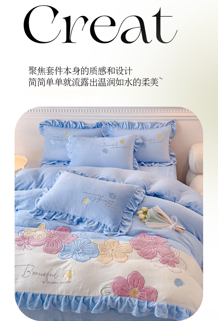 (总)2025外贸跑量款加厚清新公主法式风花卉纯色牛奶绒贴布绣刺绣花四件套单品床单被套婴儿绒法兰绒兔毛绒四件套,赫本粉,赫本紫,赫本玉色,赫本天蓝,赫本灰,心动粉,心动紫,心动玉色,心动灰,心动天蓝