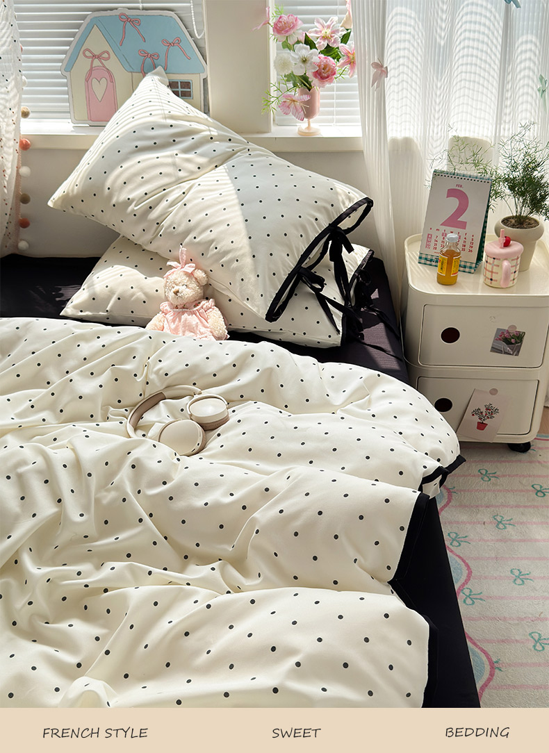 当前位置: 91家纺网 > 商品网购 > 床品套件 > 四件套 > 水洗棉四件套 > 尤米 2025新款水洗棉撞色绑带款四件套 绑带款-白波点