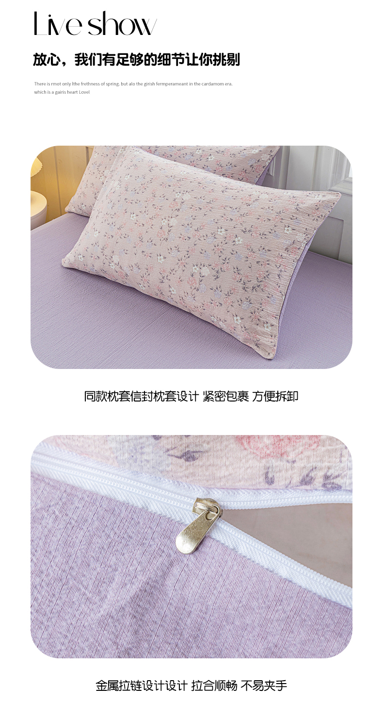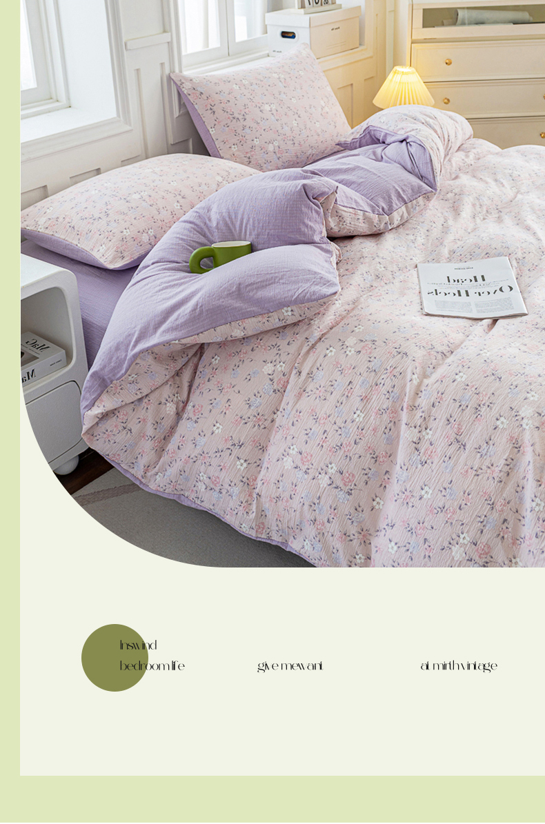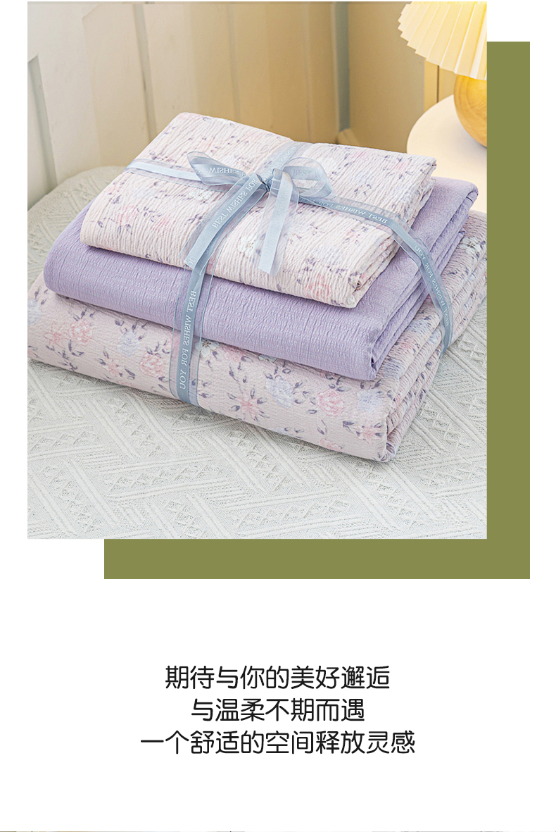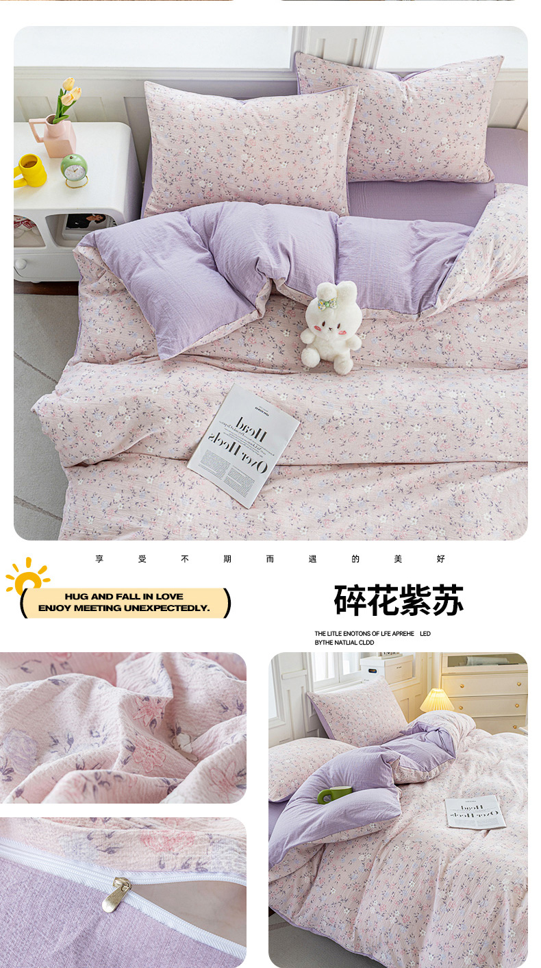 • 91家纺网 家纺一手货源 找家纺 奇丝雅 2025新款A类有氧超柔云感双层纱皱皱纱学生宿舍三件套家用四件套单被套 碎花紫苏