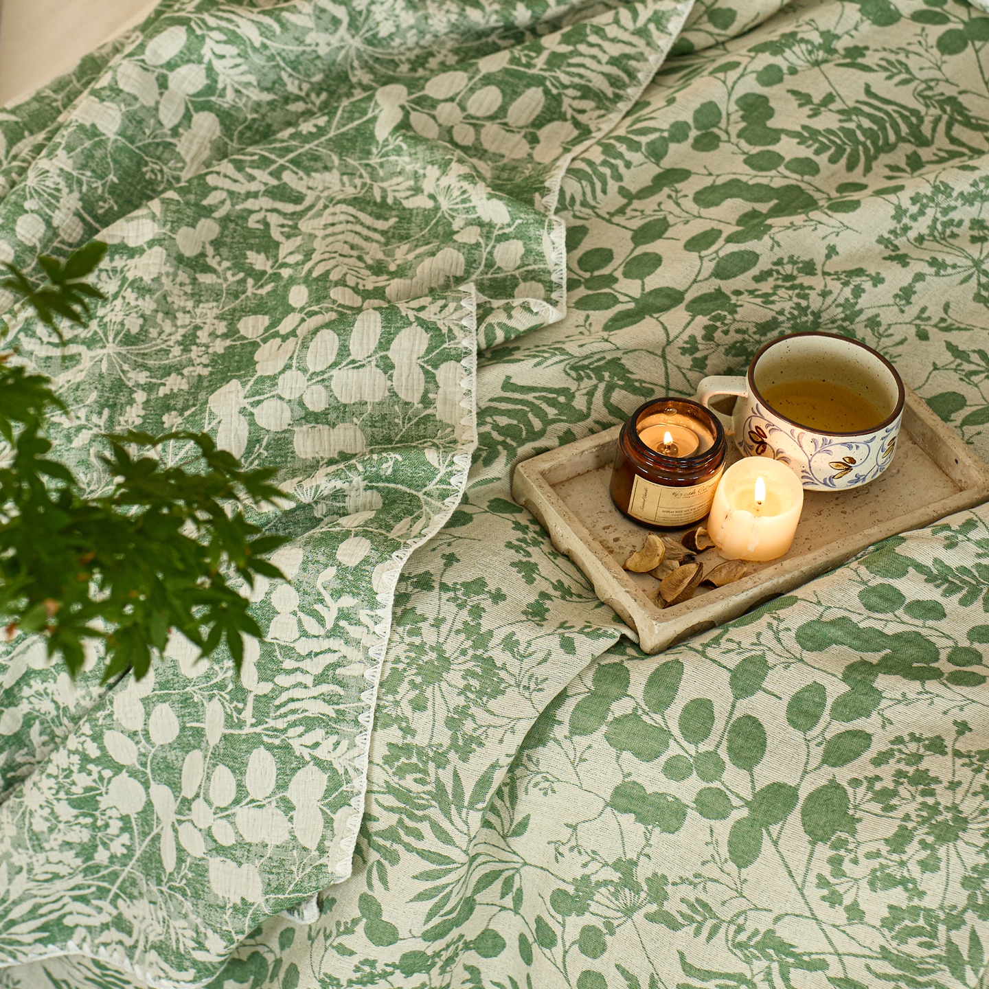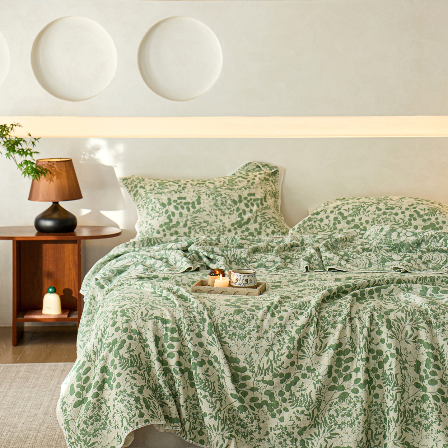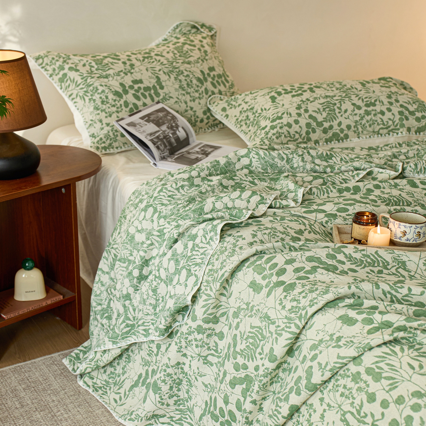 安莱生活2025新款双层纱多功能盖毯床盖三件套 新栀子花-绿