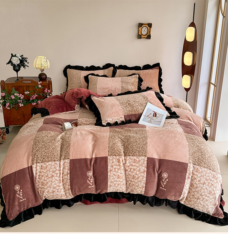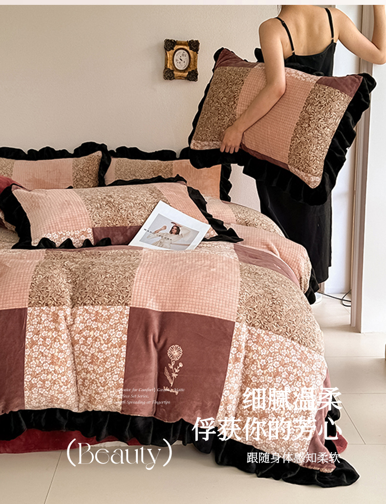 亿品2025新款直播爆款韩版赫本风高克重牛奶绒四件套床裙款 8.5斤(有买家秀加v) 花边紫韵,花边紫韵