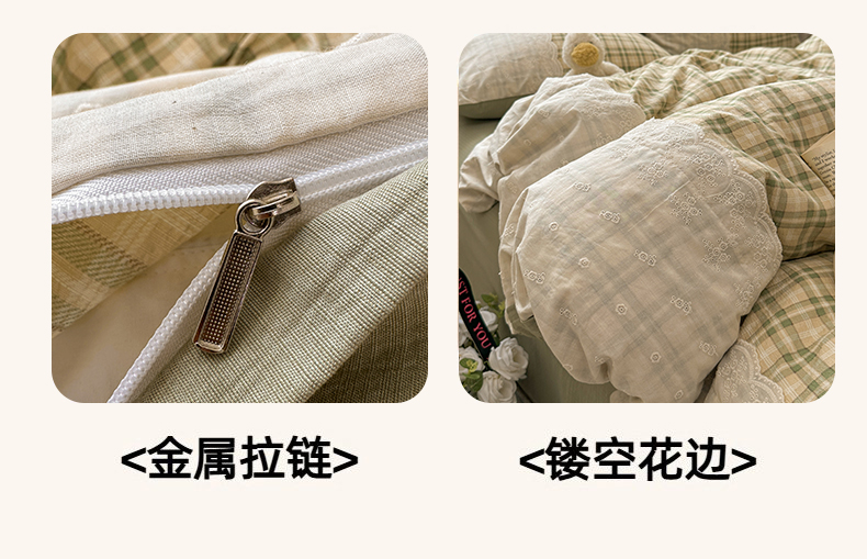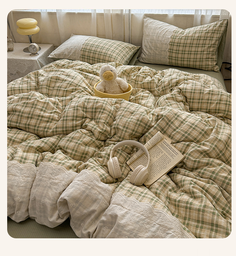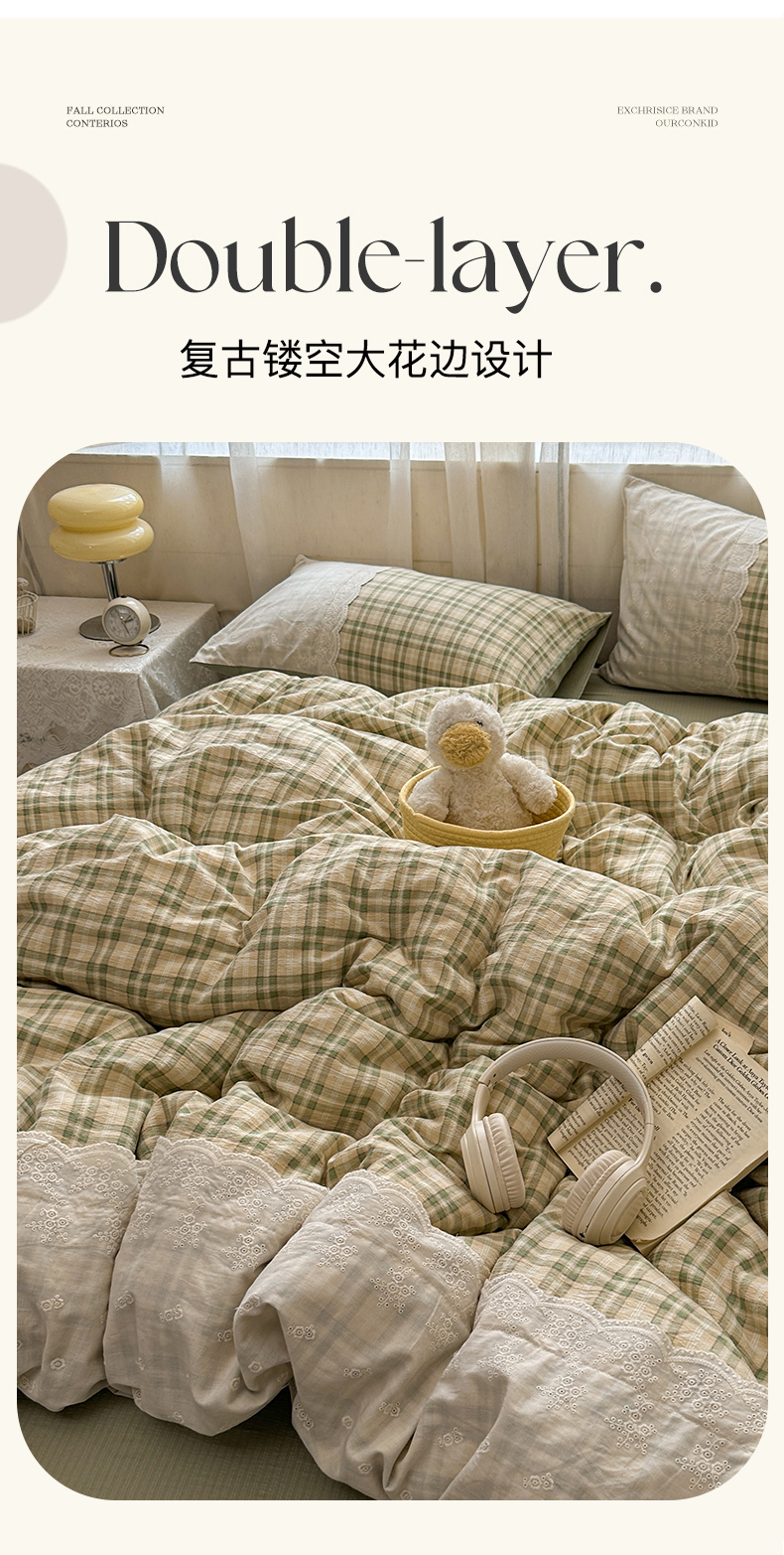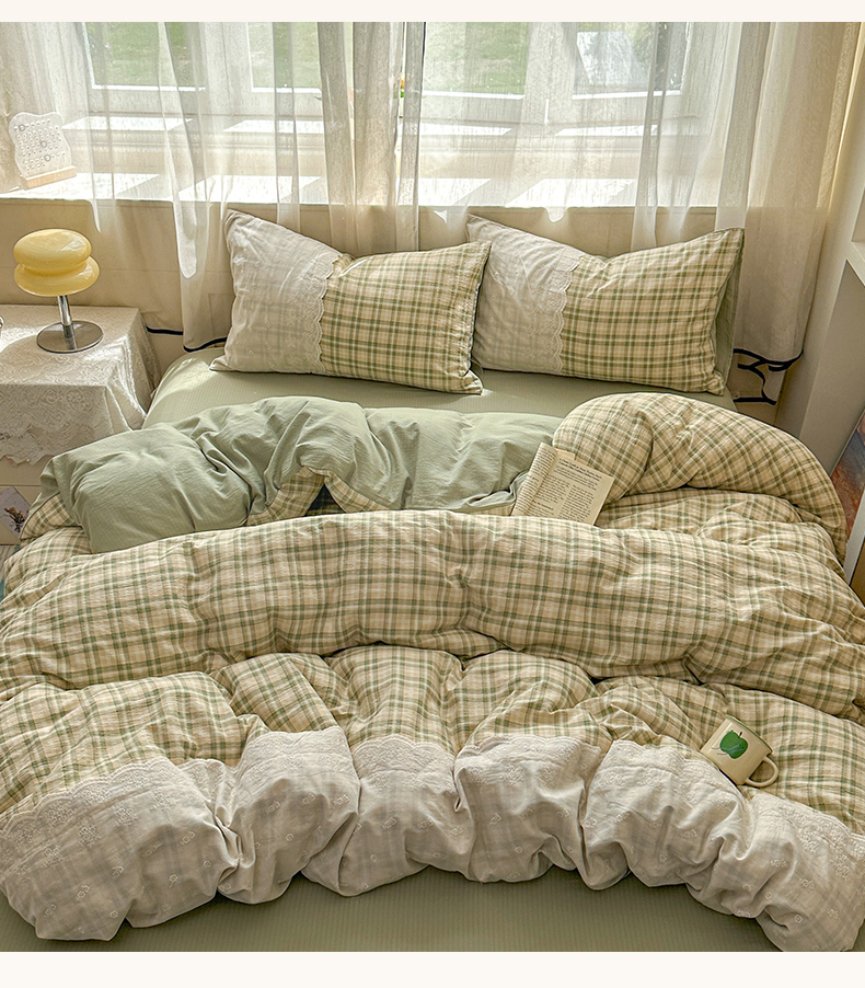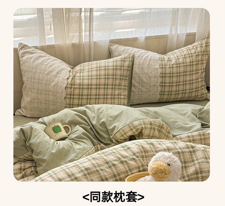 当前位置: 91家纺网 > 商品网购 > 床品套件 > 四件套 > 其它四件套 > 晚爱家纺(原晚安家居) 2025新款韩系少女风蕾丝花边四件套云感木棉双层纱-苏菲 苏菲·浅绿格
