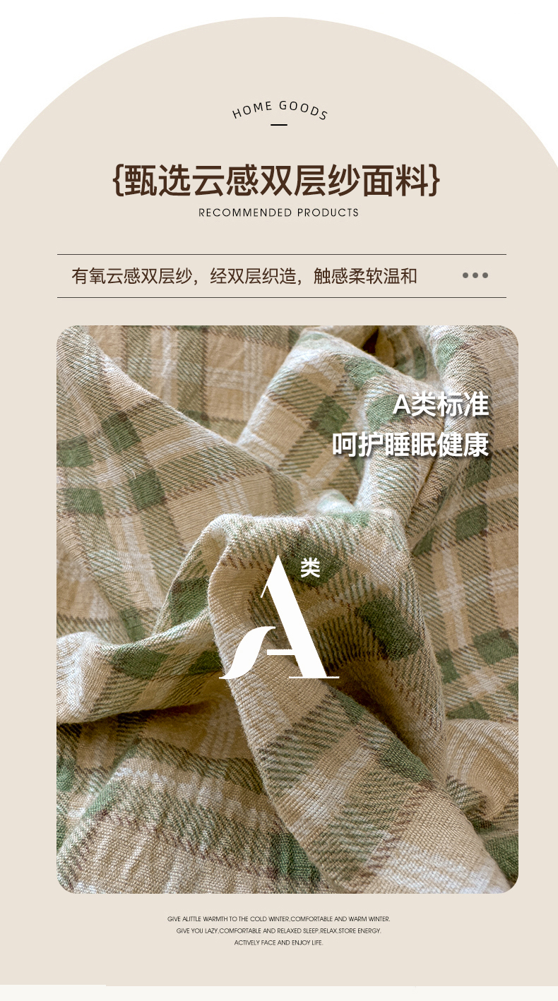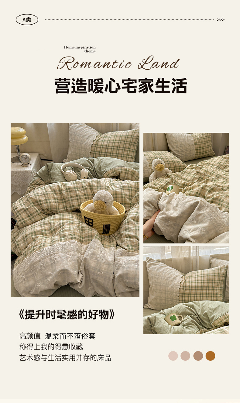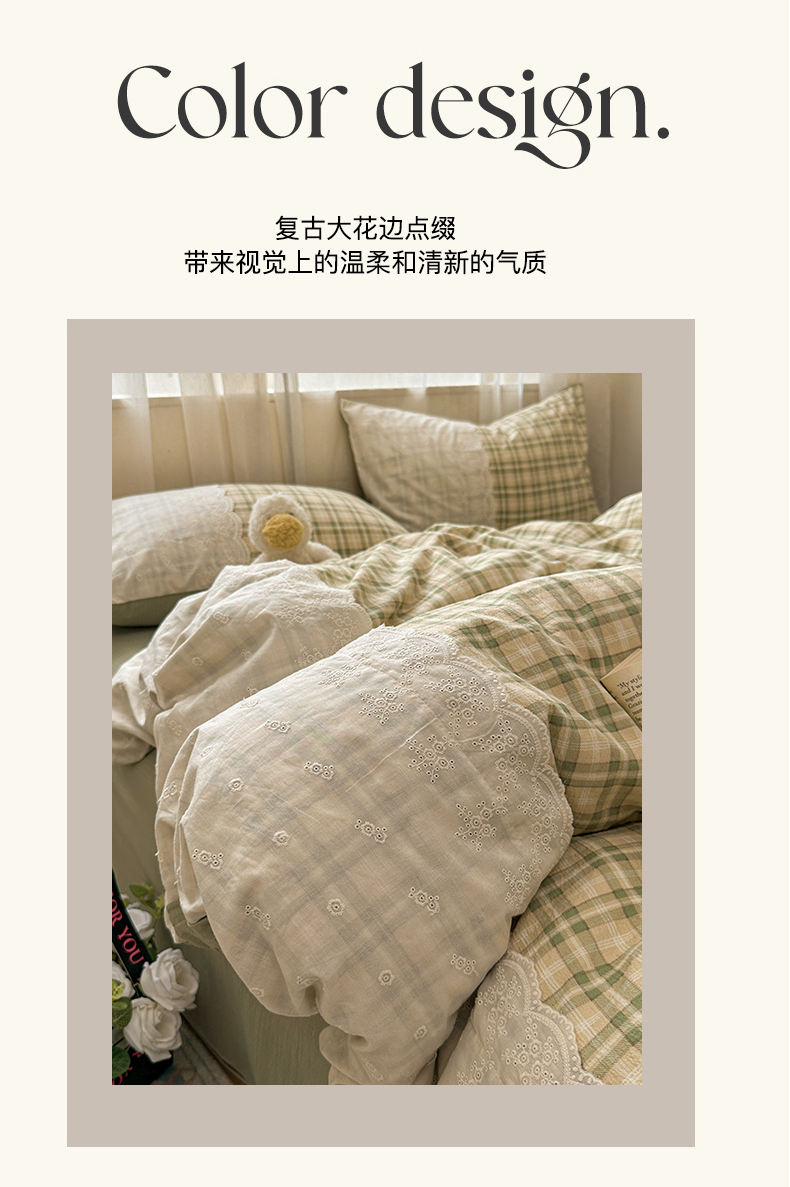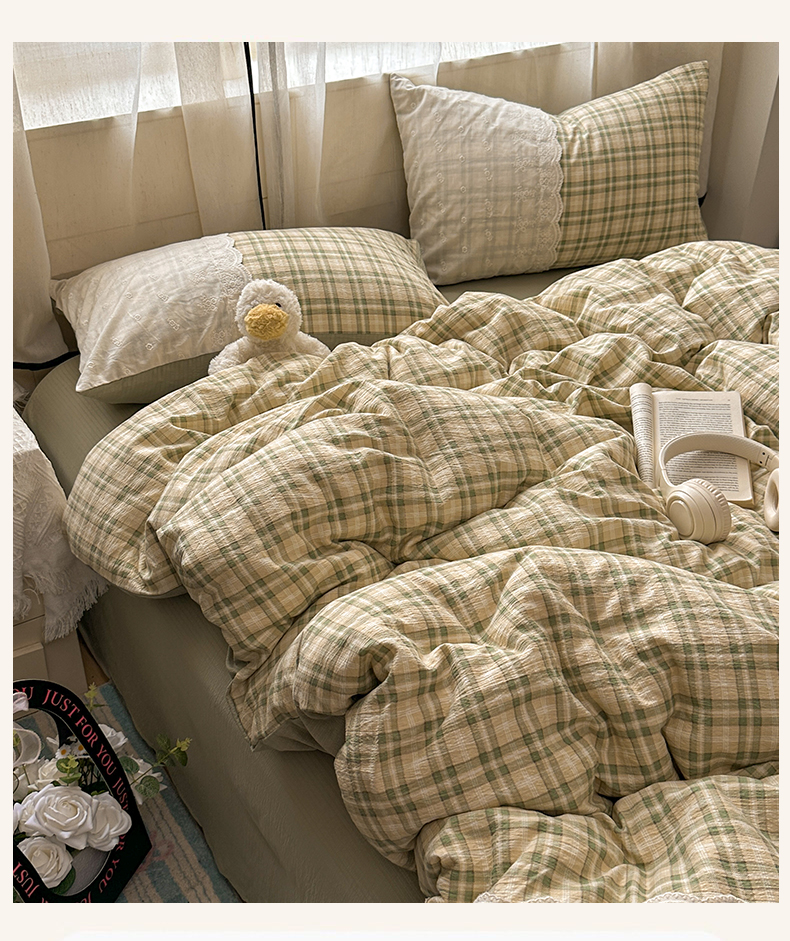当前位置: 91家纺网 > 商品网购 > 床品套件 > 四件套 > 其它四件套 > 晚爱家纺(原晚安家居) 2025新款韩系少女风蕾丝花边四件套云感木棉双层纱-苏菲 苏菲·浅绿格