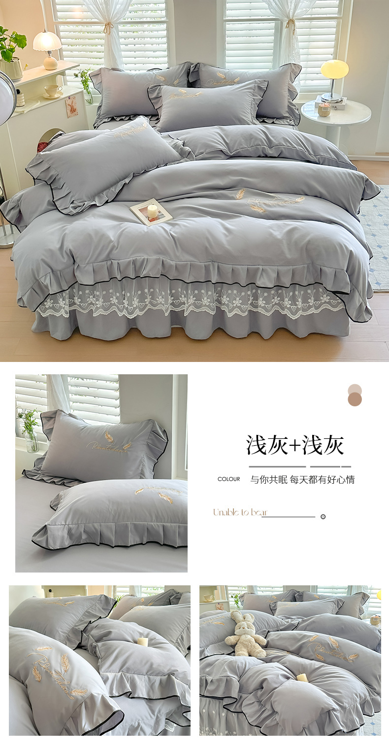 商品名称:柔享家 2025新款法式双层花边蕾丝花边床裙-恩格斯(有同款四件套) 浅灰