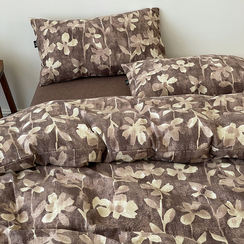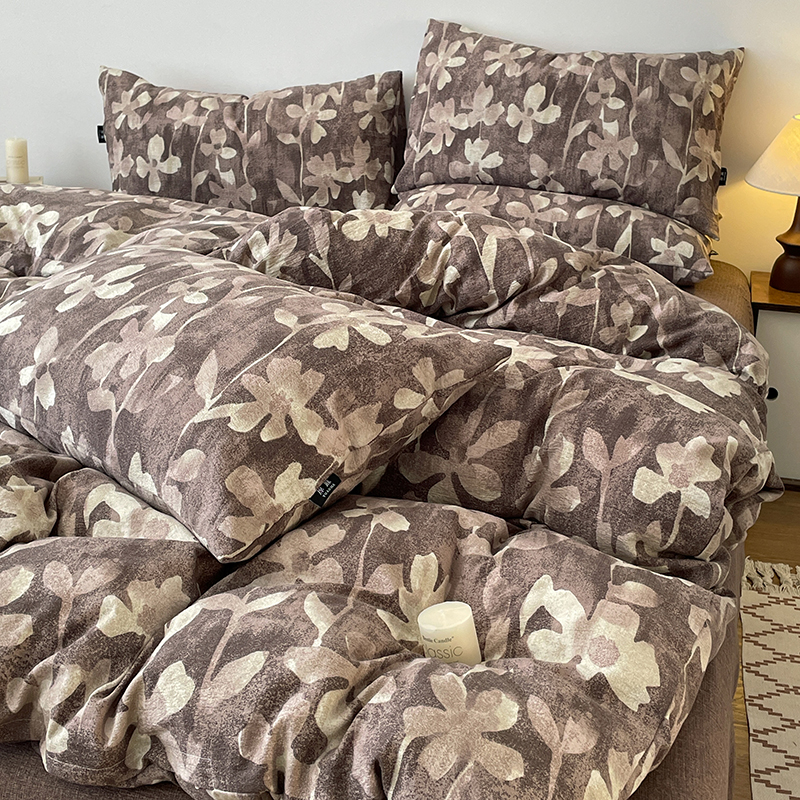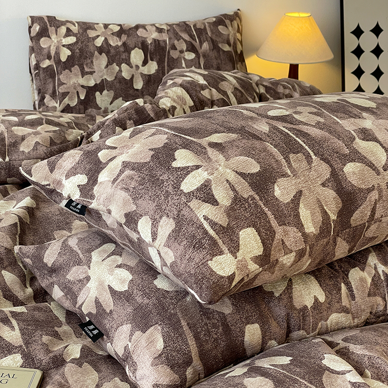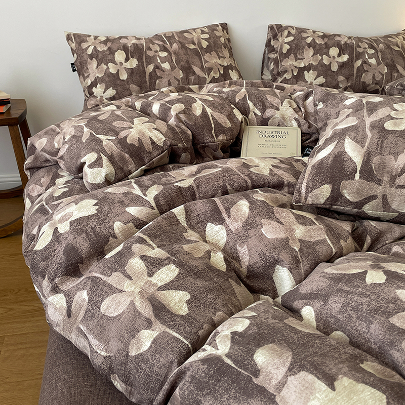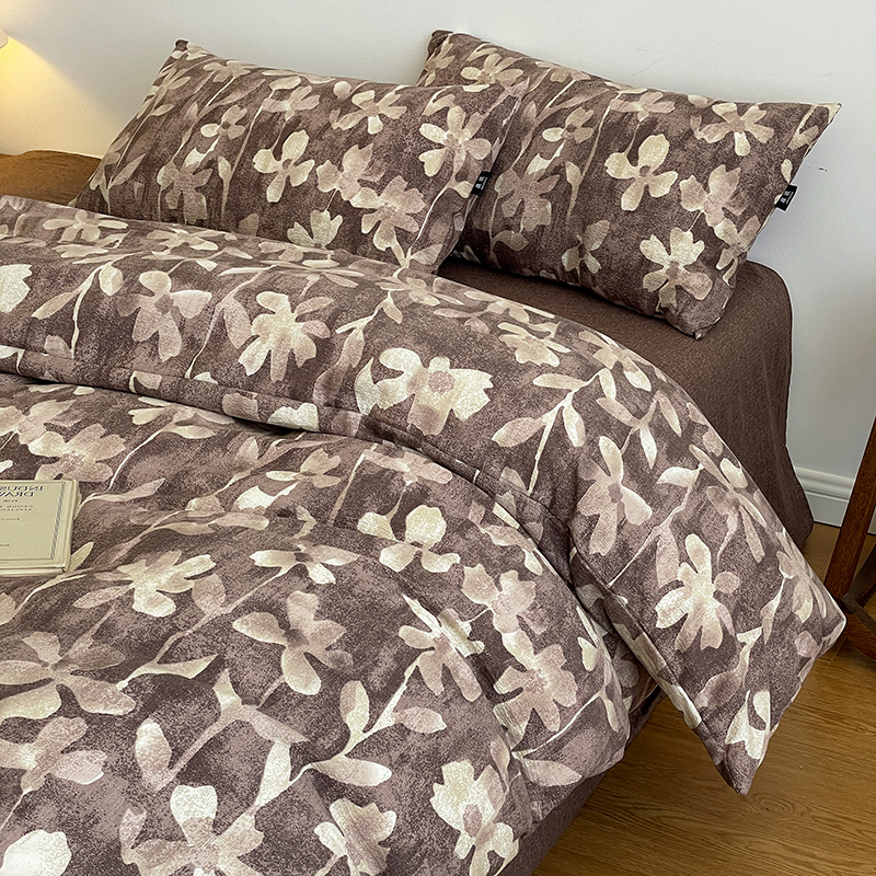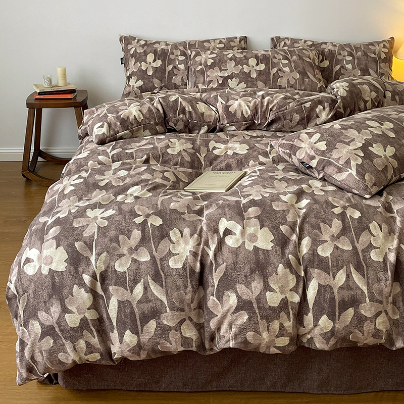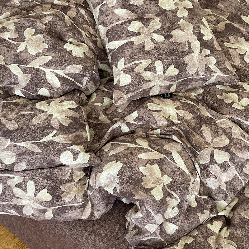 一比一家纺 2025秋冬新款高克重棉麻原麻复古诧季风原麻四件套-简单款 花影棕
