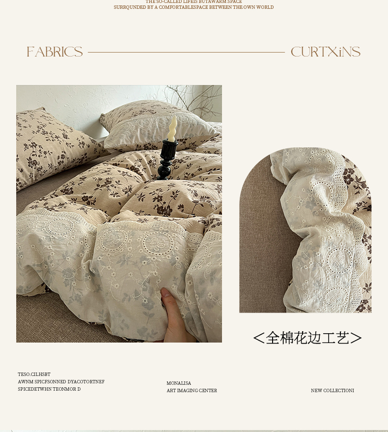 商品名称:梦纤绒 2025秋冬新品A类高克重亚麻复古全棉花边侘寂风原麻系列 欧若拉