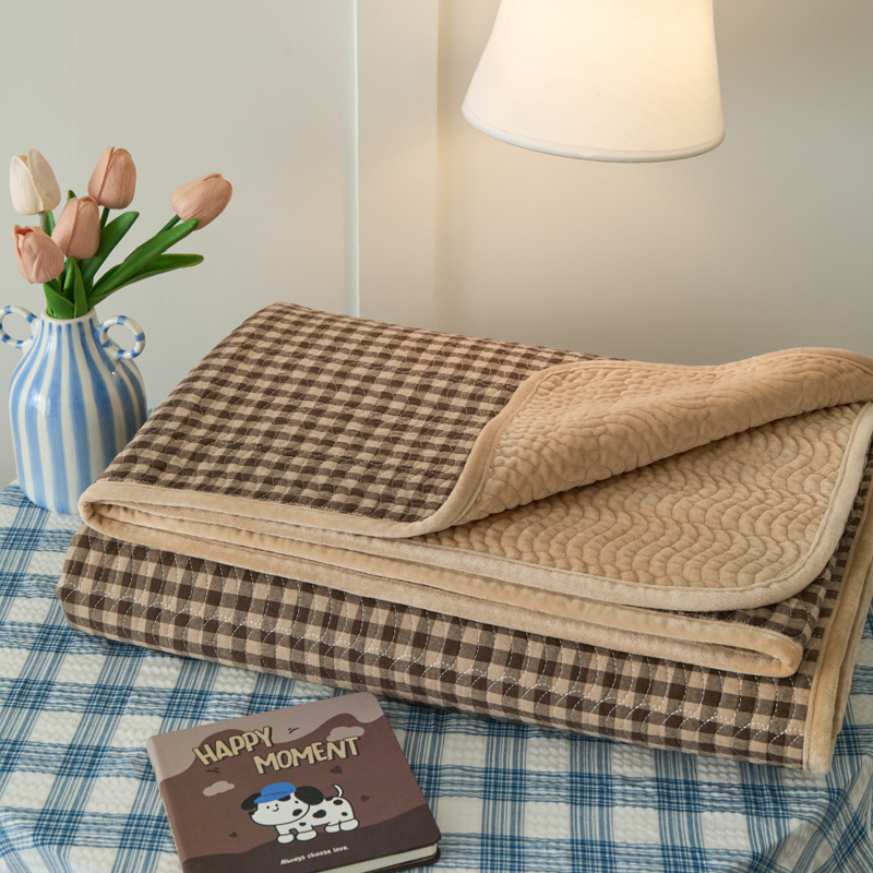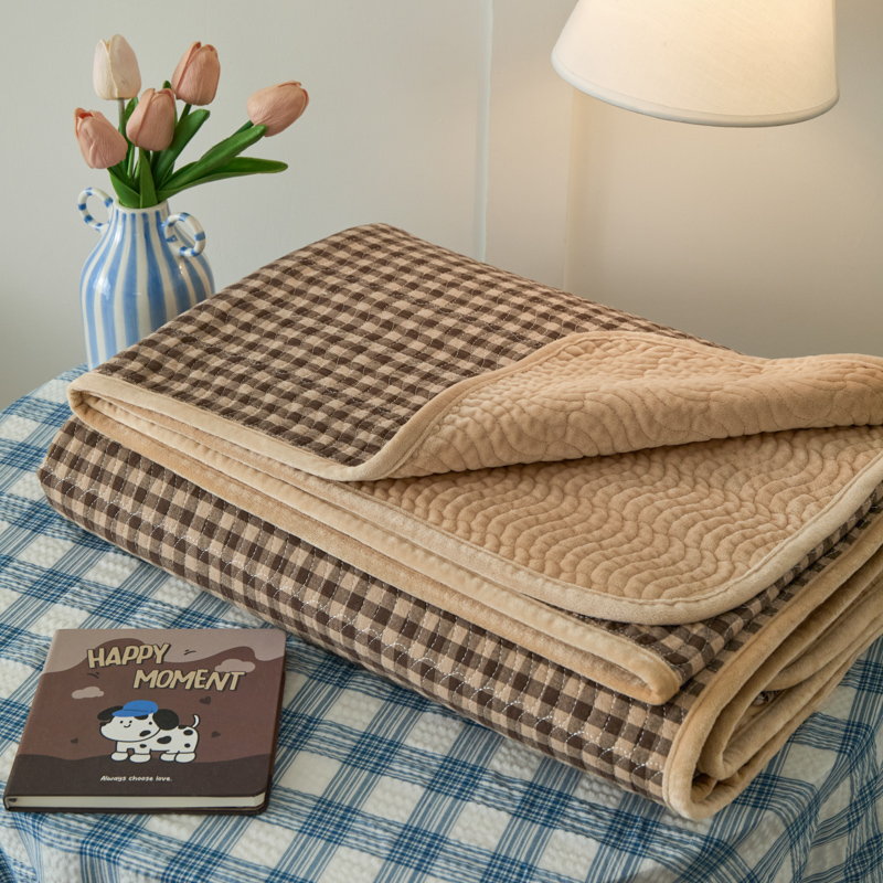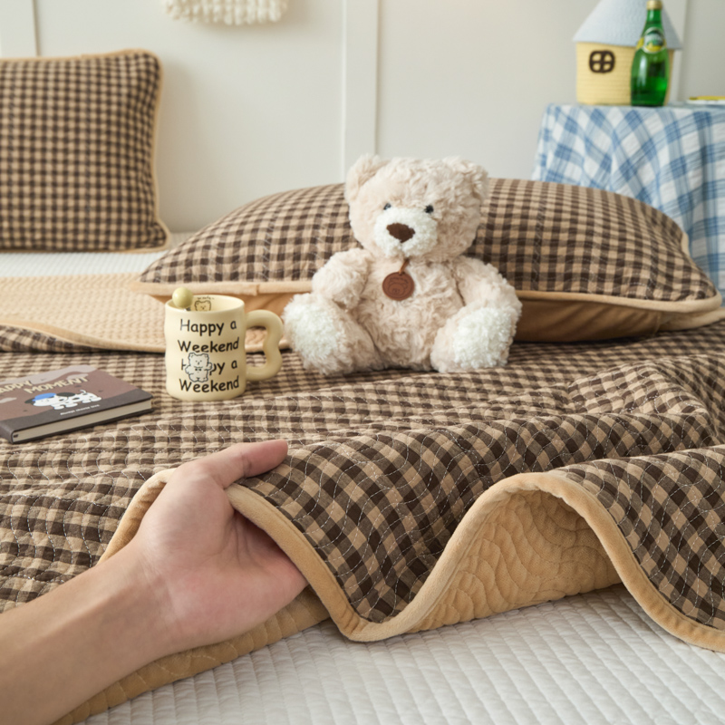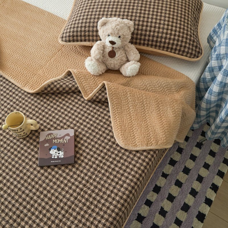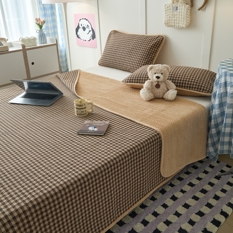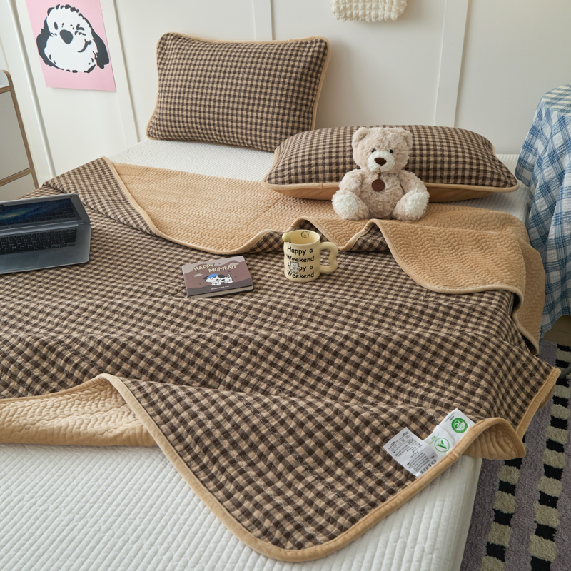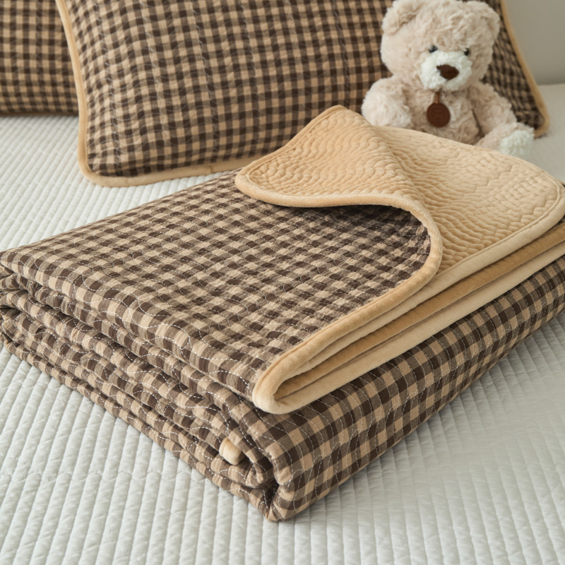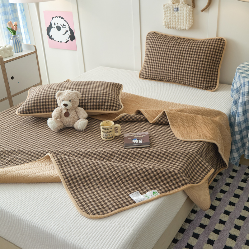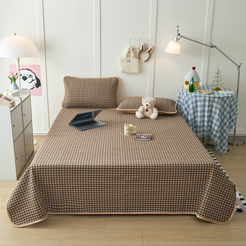• 91家纺网 家纺一手货源 找家纺 沐纯家居 2025新款色织水洗棉棉绒(大豆纤维填充)床盖三件套 豆丁-咖格