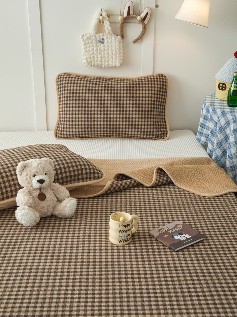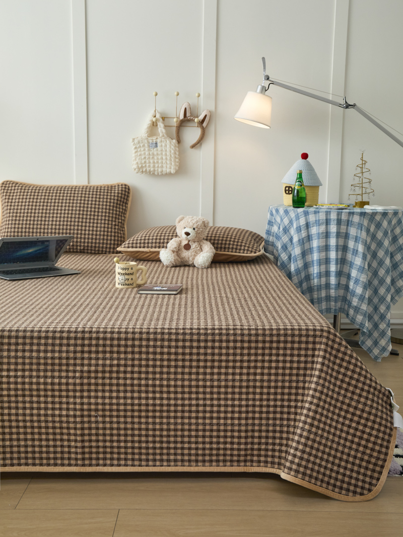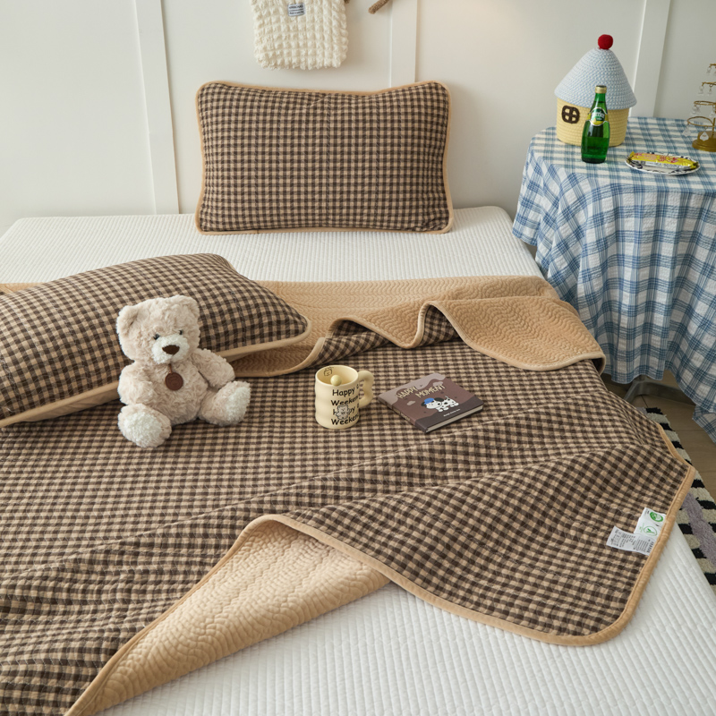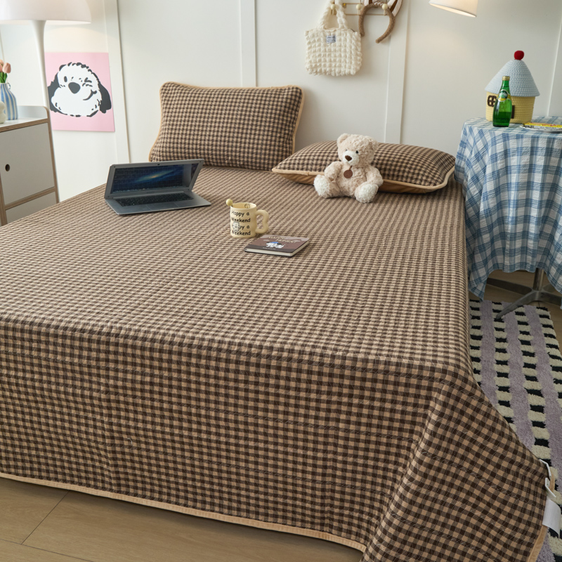 沐纯家居 2025新款色织水洗棉棉绒(大豆纤维填充)床盖三件套 豆丁-咖格