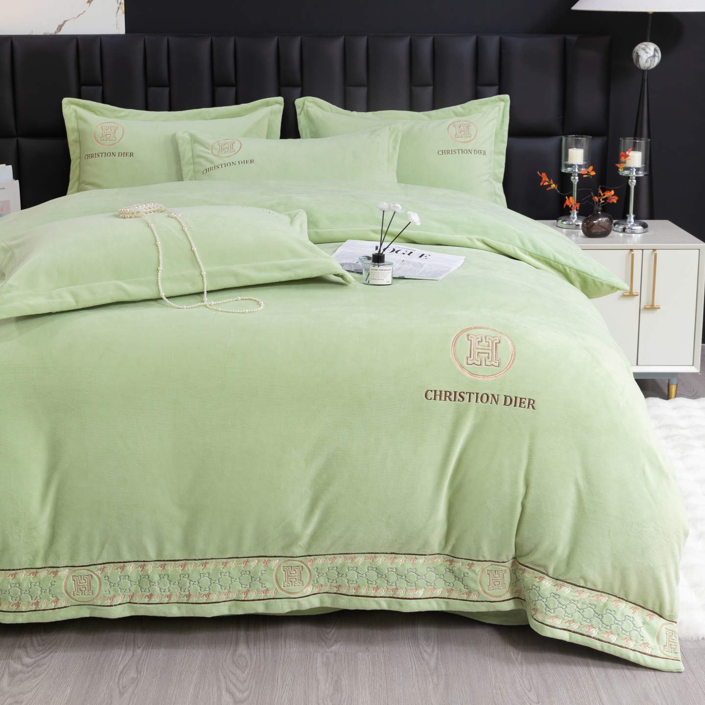 商品名称:优姿家纺 2025新款75D全光慕丝绒保暖四件套-摩登时代 摩登时代-抹茶绿