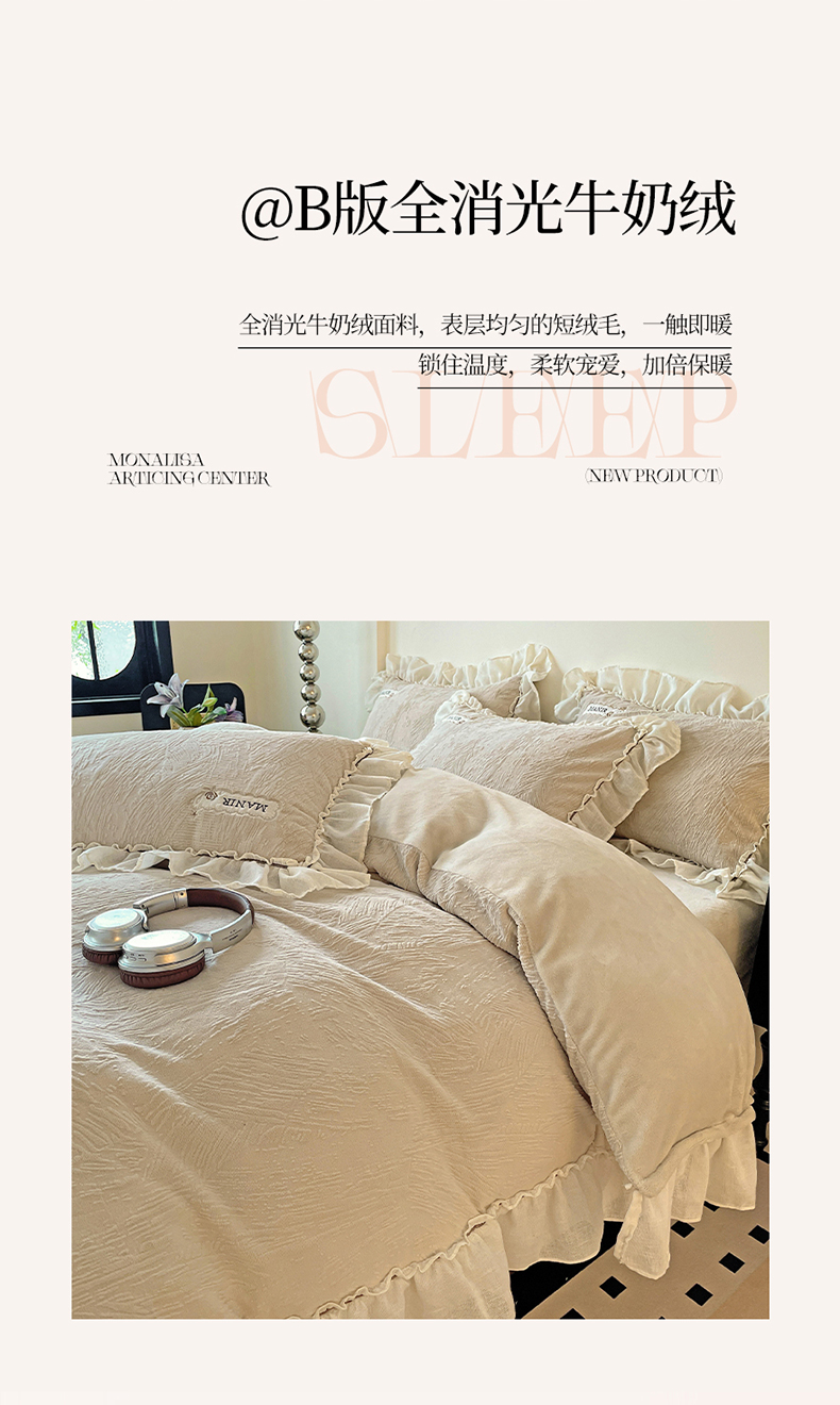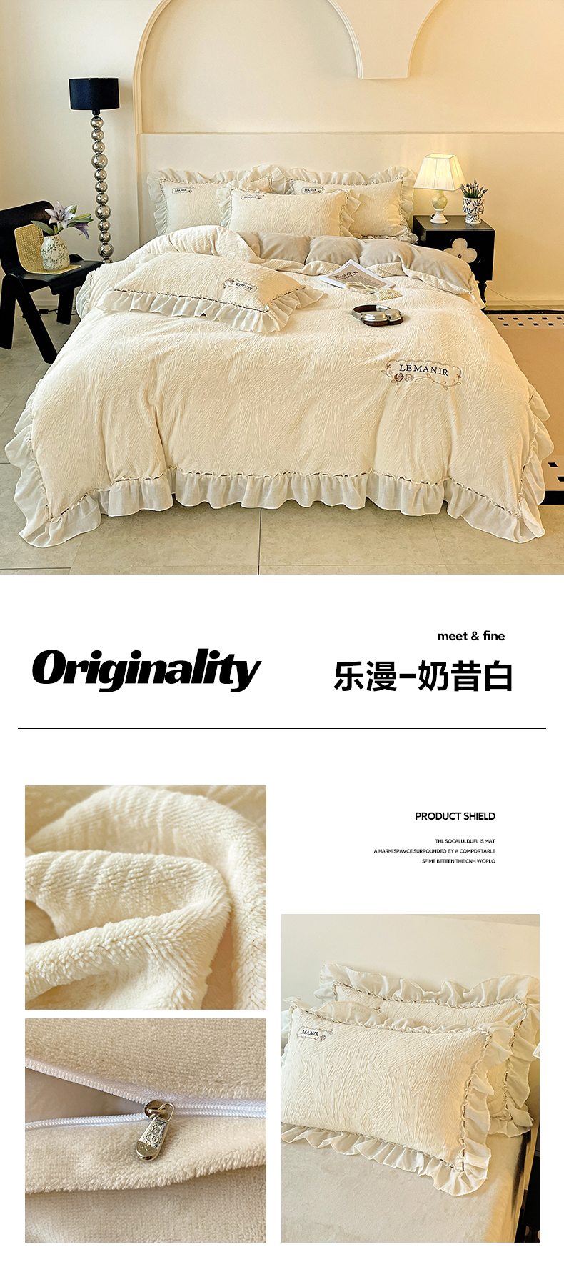 十方家居 2025新款9斤加厚雕花绒全棉纱布韩版双层花边贴布绣高克重全消光牛奶绒四件套 乐漫-奶昔白,乐漫-奶昔白