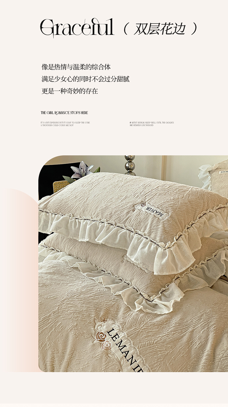 商品名称:(总)十方家居 2025新款9斤加厚雕花绒全棉纱布韩版双层花边贴布绣高克重全消光牛奶绒四件套