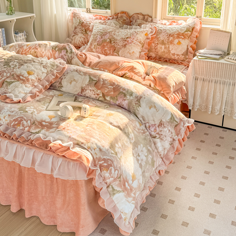 (总)禧缘家纺(原梦想家) 2025新款夹棉双层花边床笠牛奶绒系列四件套,布布乐园,步步生花,狗狗岛屿,蓝铃风语,浪漫花开,落日云舒,猫咪心事,摩卡小镇,雾都茶花,杏花微雨
