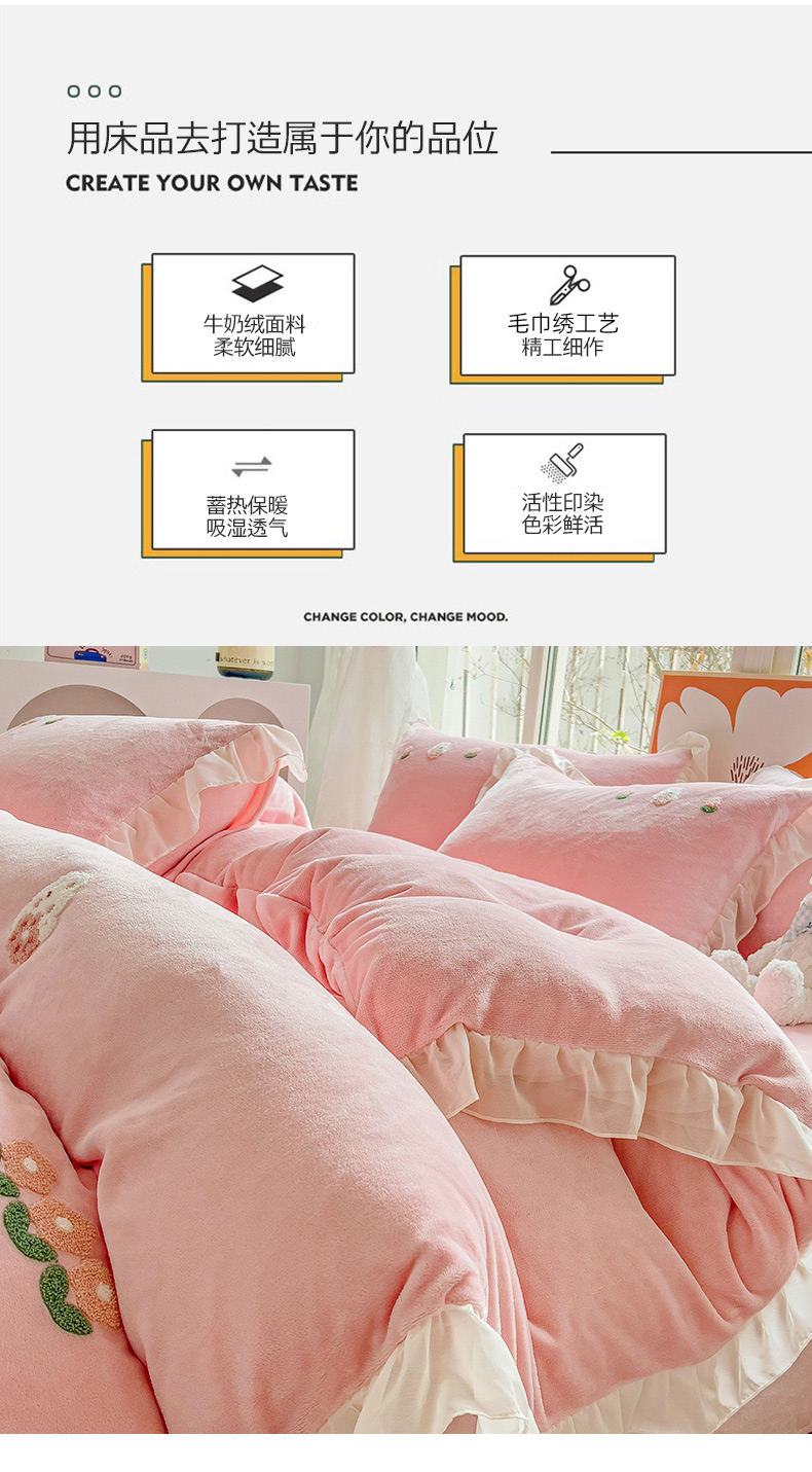 眷恋家纺 2025新款韩版毛巾绣小蕾丝荷叶边牛奶绒四件套迷你兔+樱桃兔系列 樱桃兔-浅粉