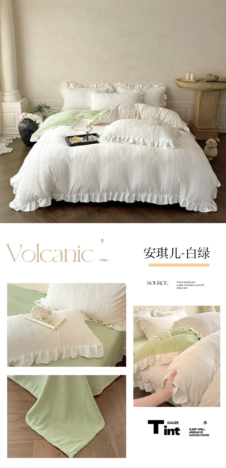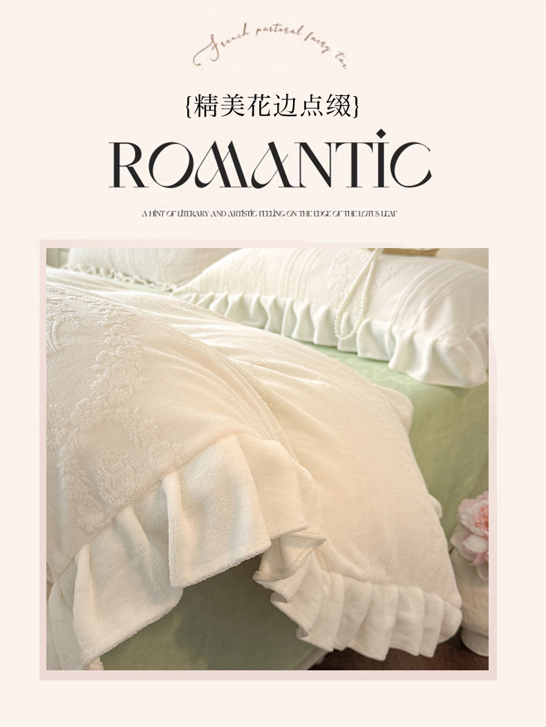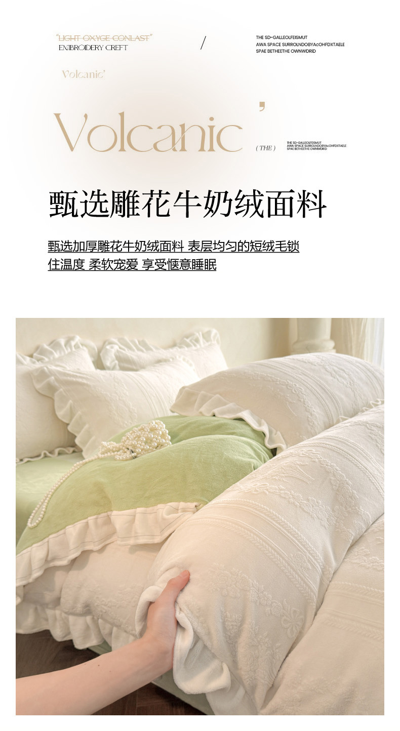 慕澄家纺 2025新款高克重牛奶绒花边款雕花四件套 安琪儿-白绿