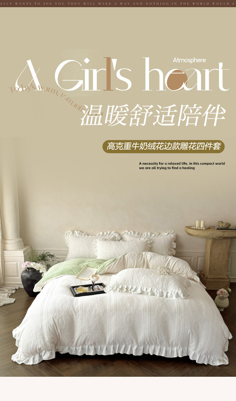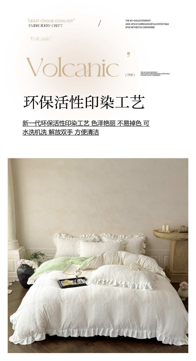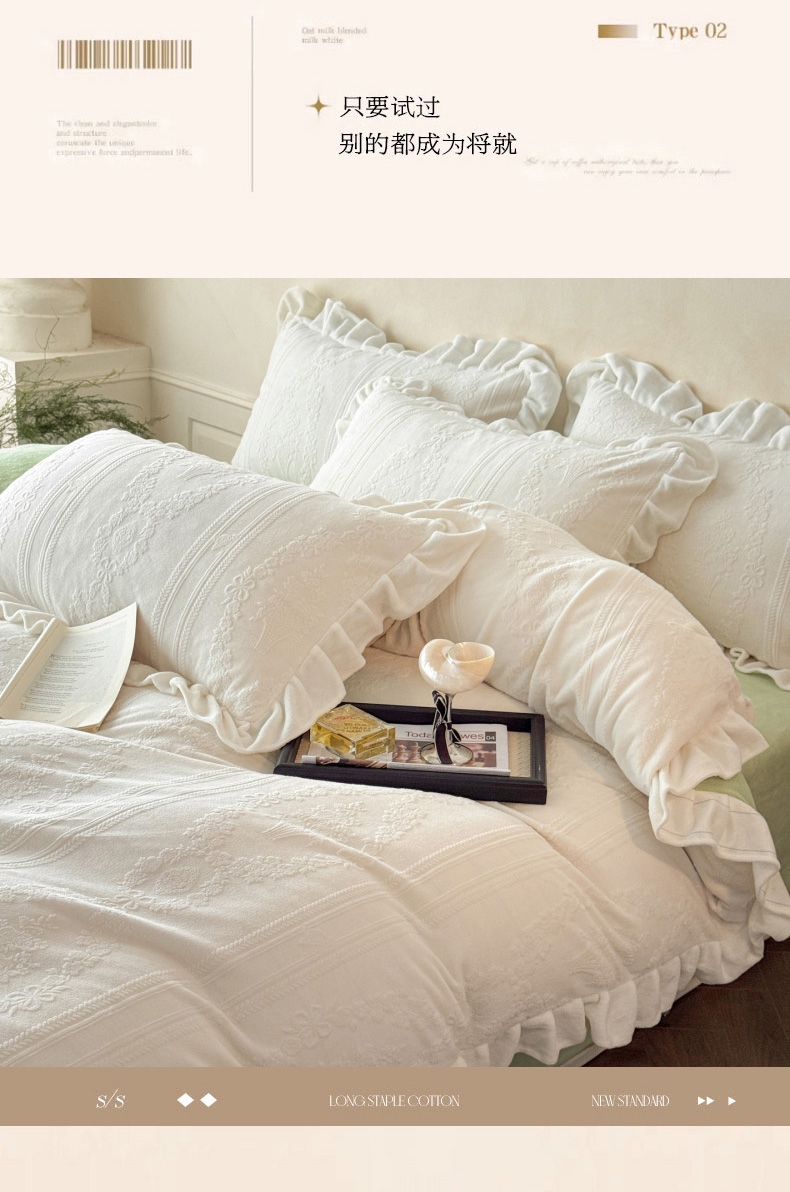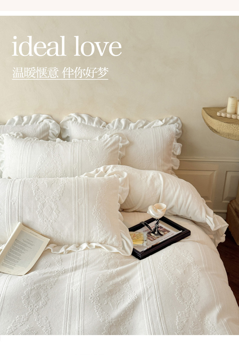 慕澄家纺 2025新款高克重牛奶绒花边款雕花四件套 安琪儿-白绿