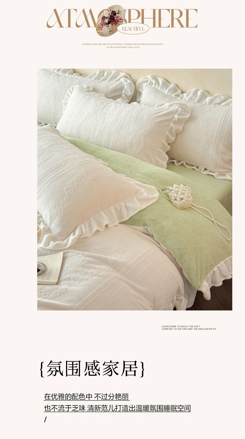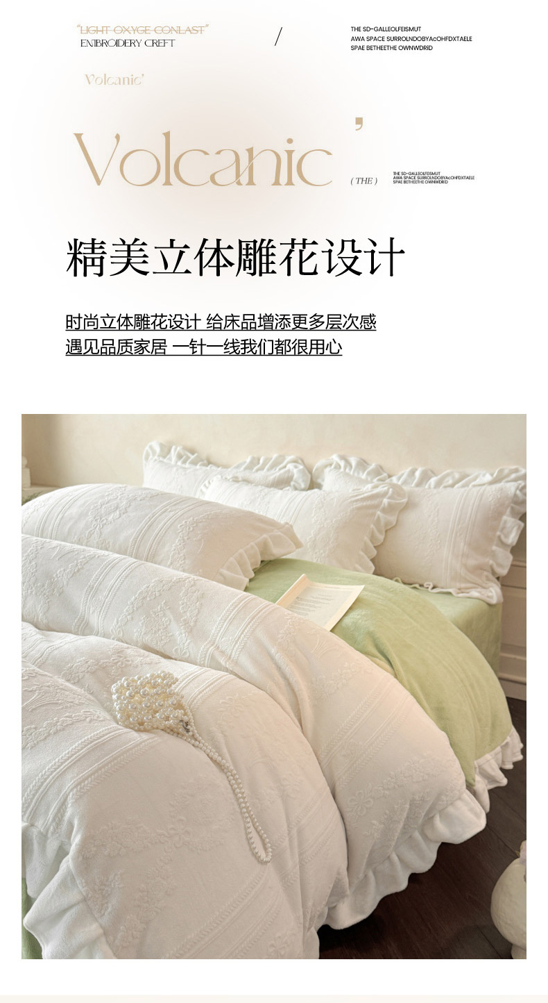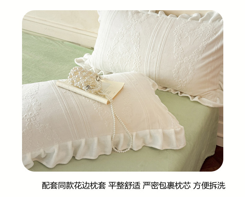 商品名称:慕澄家纺 2025新款高克重牛奶绒花边款雕花四件套 安琪儿-白绿