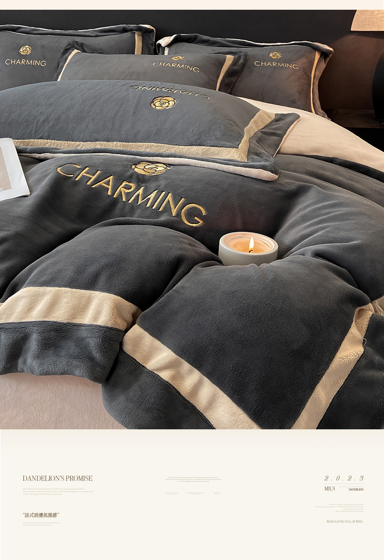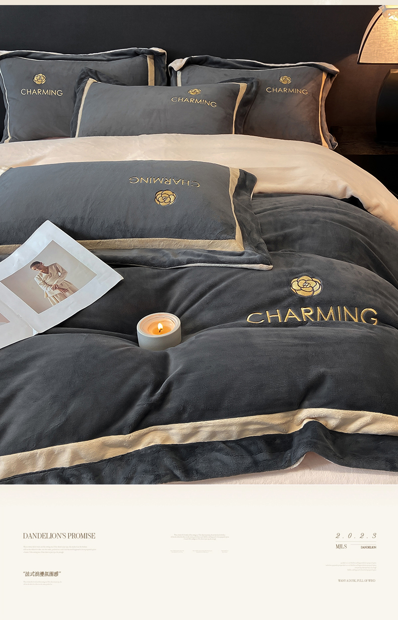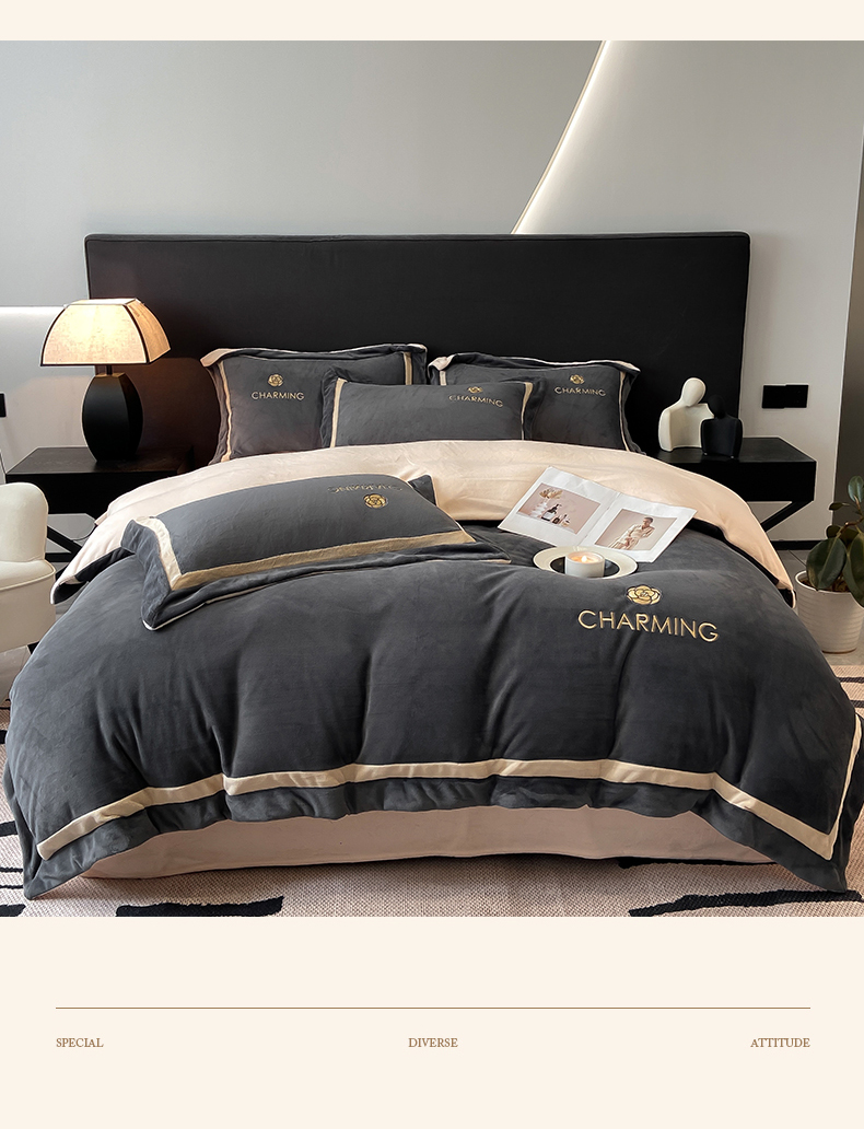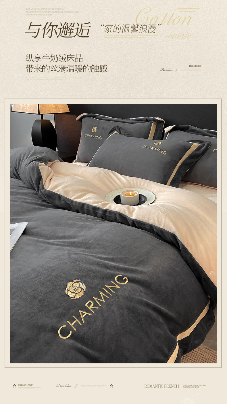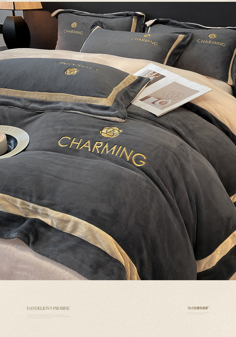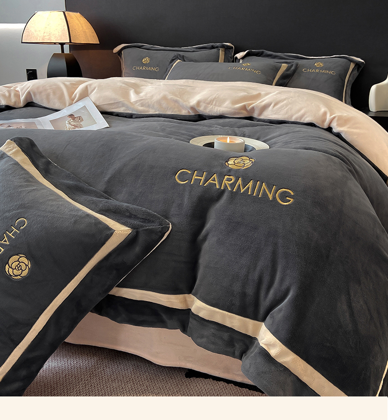 商品名称:盛秋家纺 2025新款高克重绣花双拼牛奶绒系列山茶花四件套-查伦绅士灰+香槟色