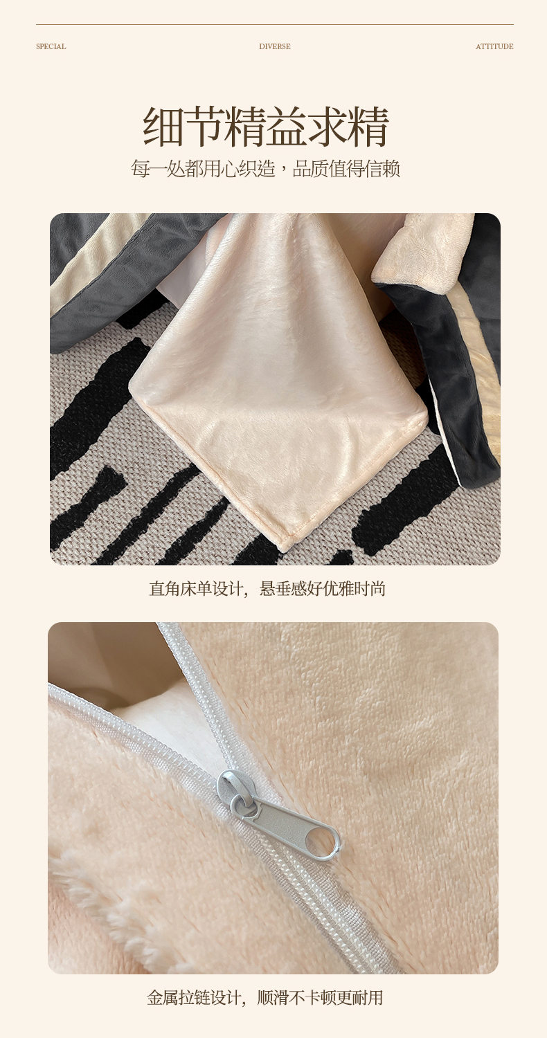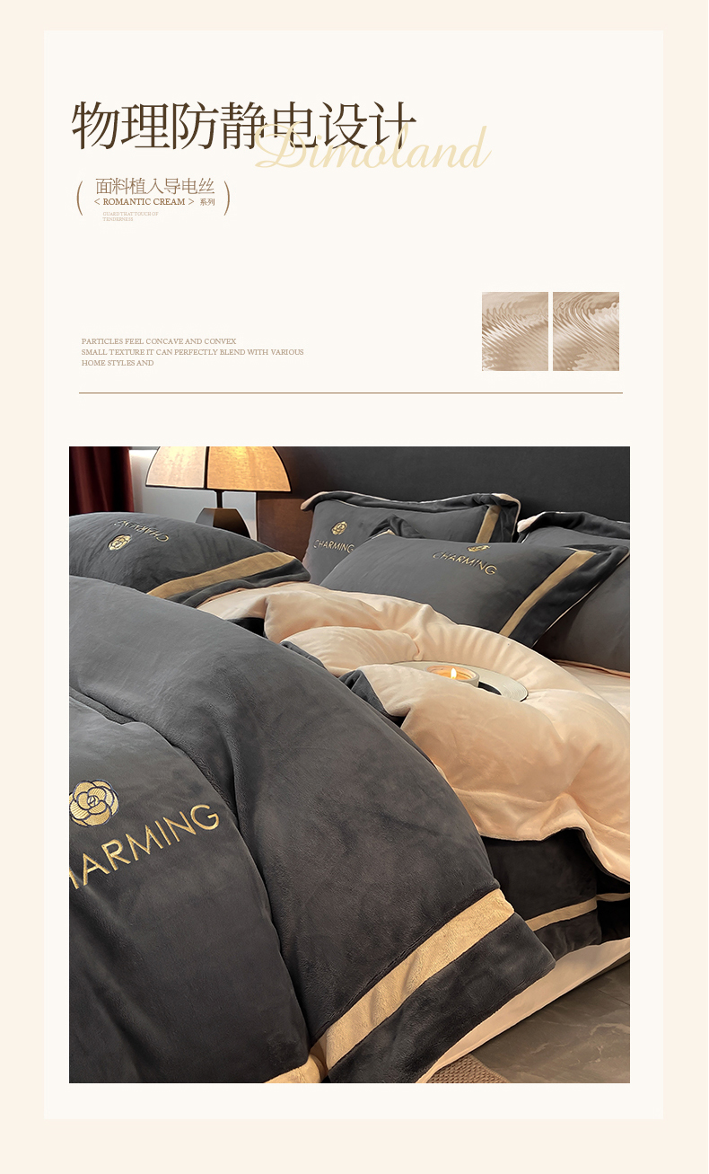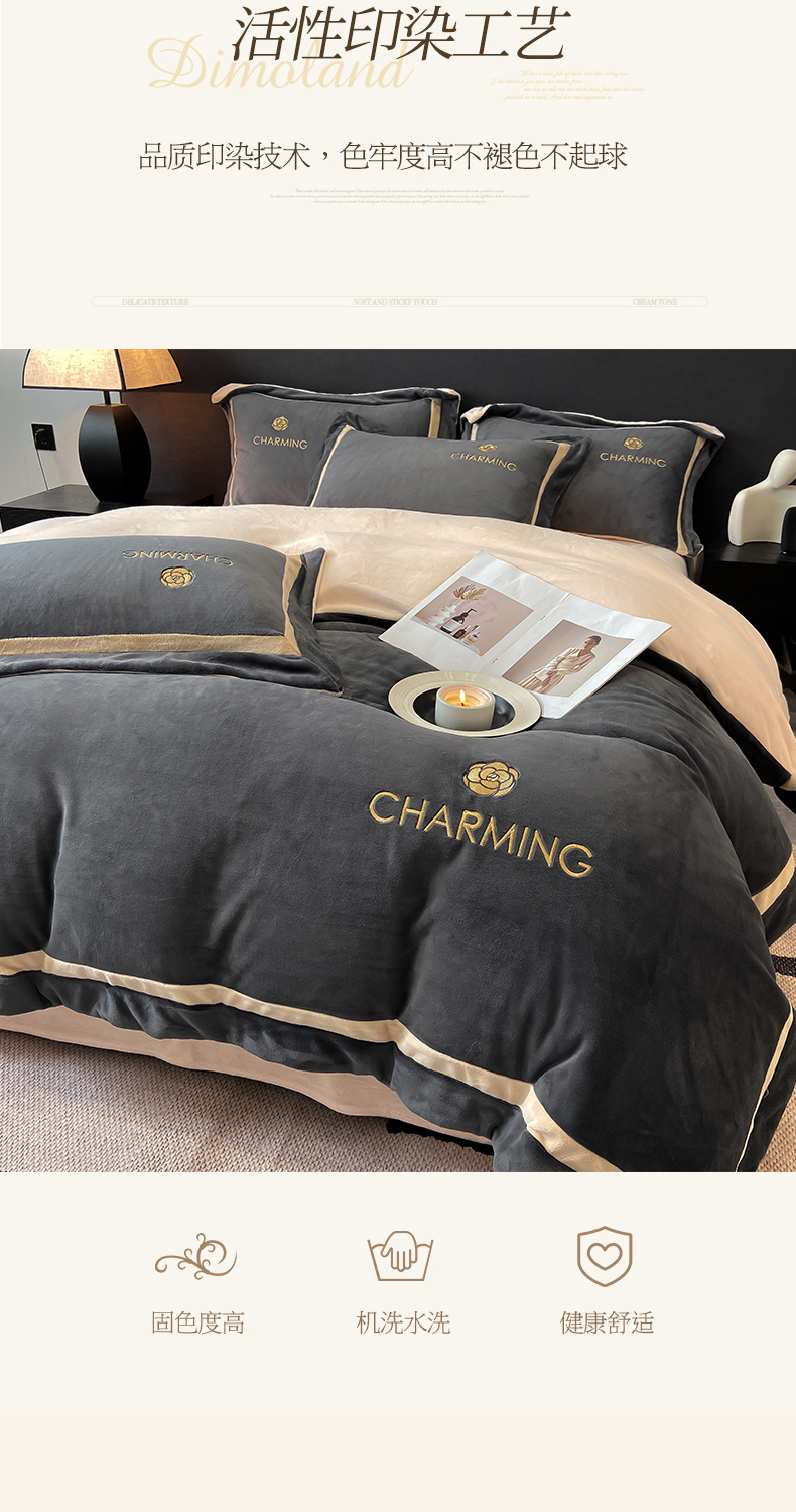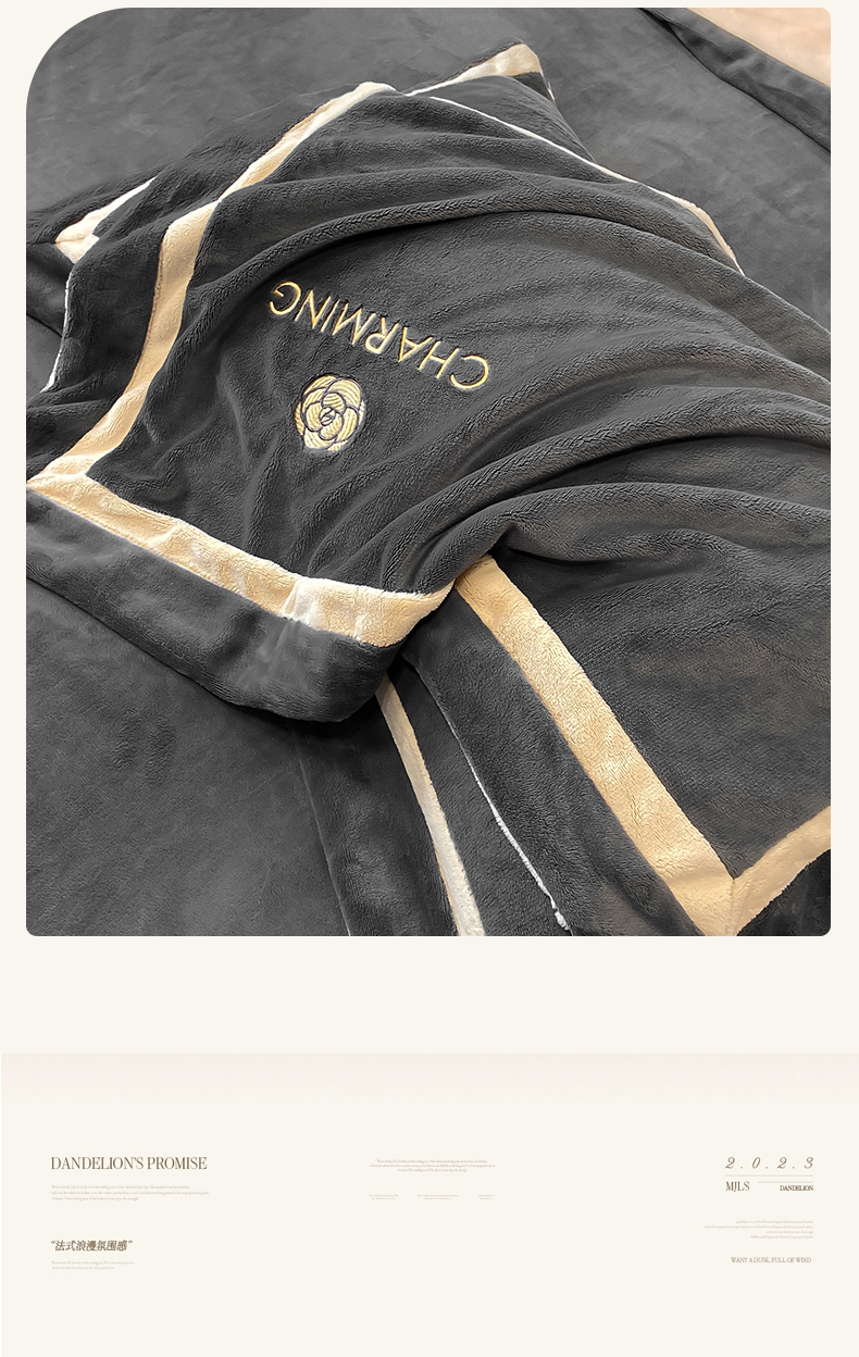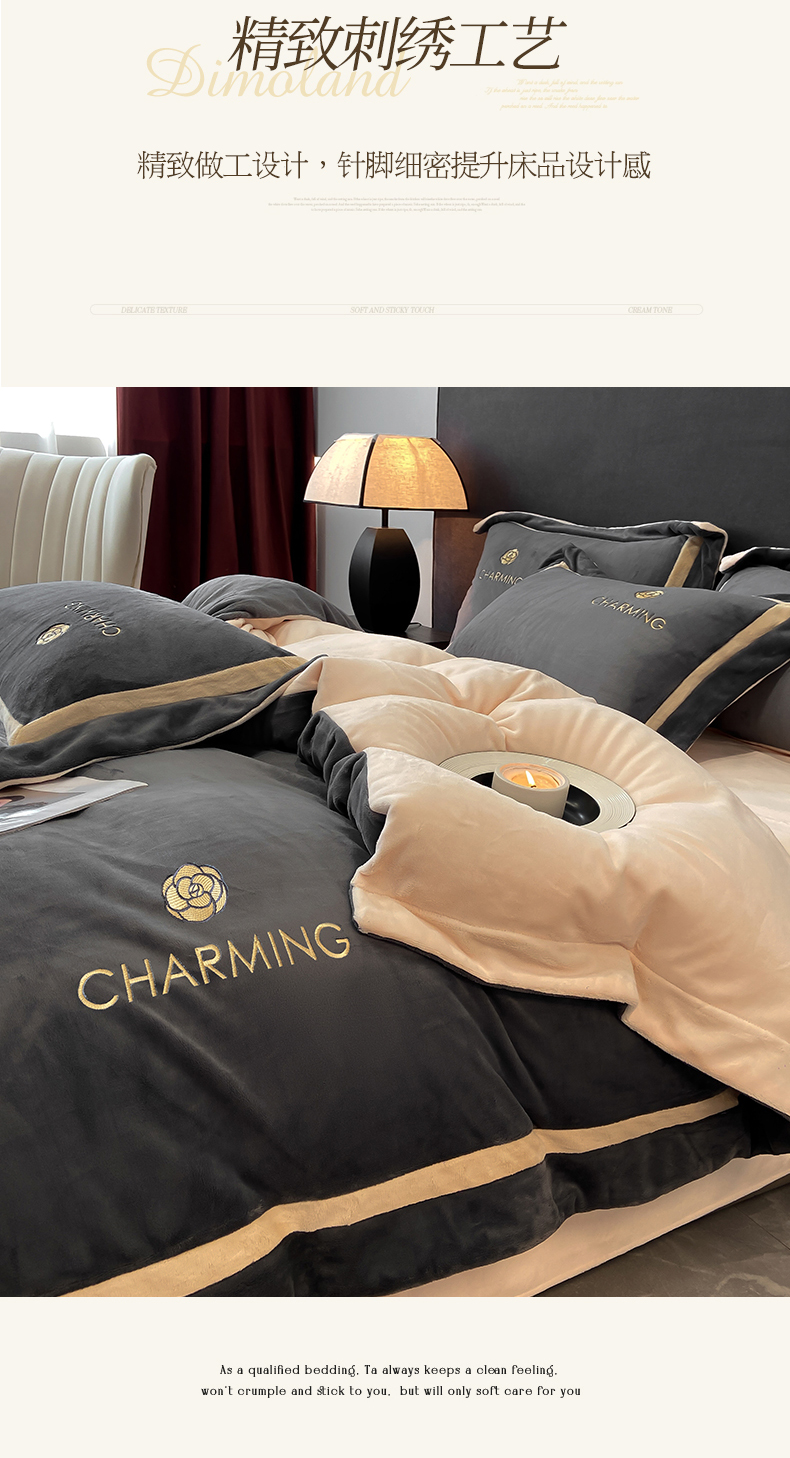 商品名称:盛秋家纺 2025新款高克重绣花双拼牛奶绒系列山茶花四件套-查伦绅士灰+香槟色