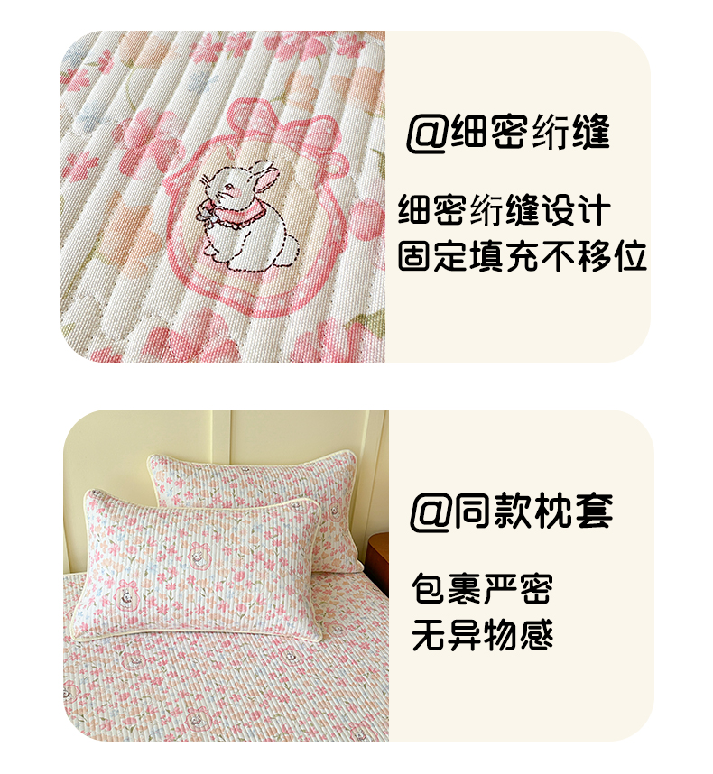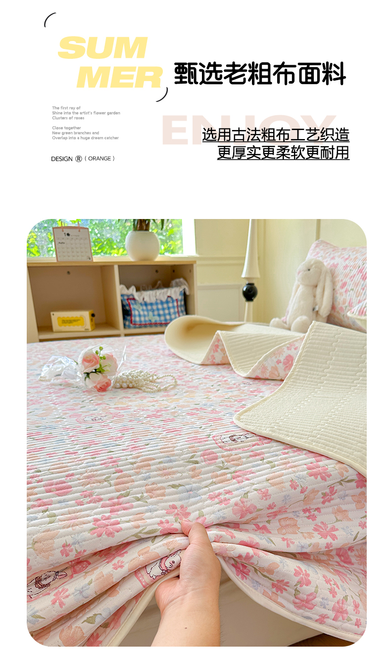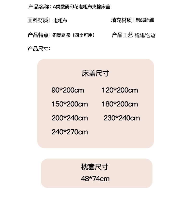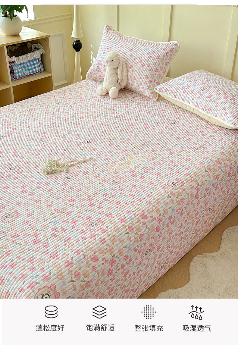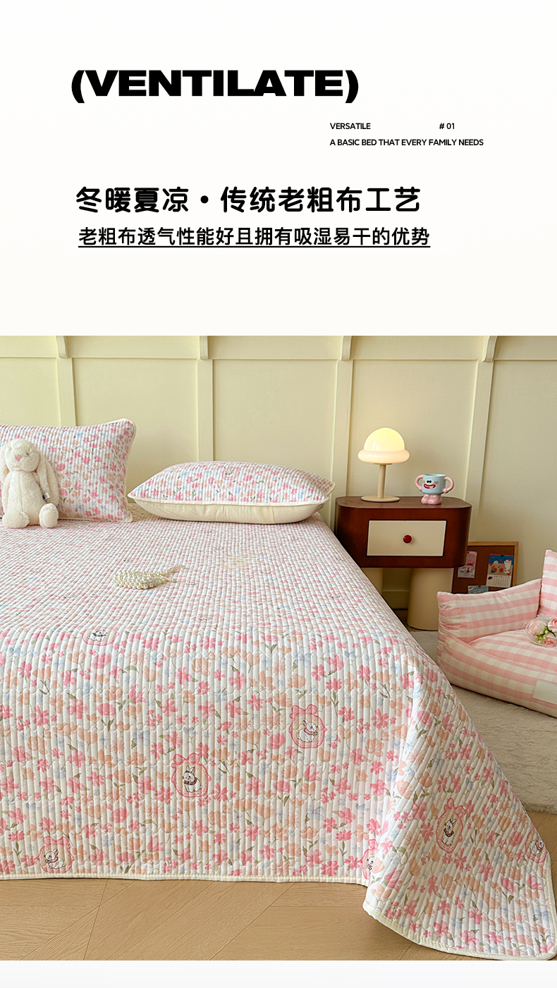• 91家纺网 家纺一手货源 找家纺 寐居家纺 2025新款A类数码印花老粗布夹棉床盖 桃枝粉粉