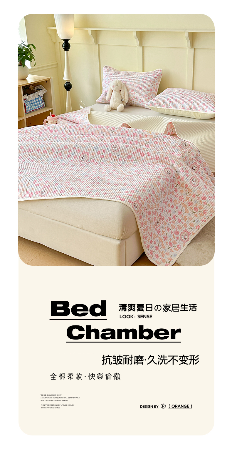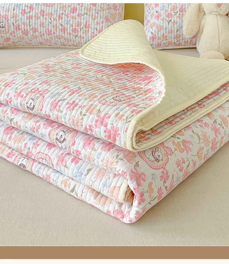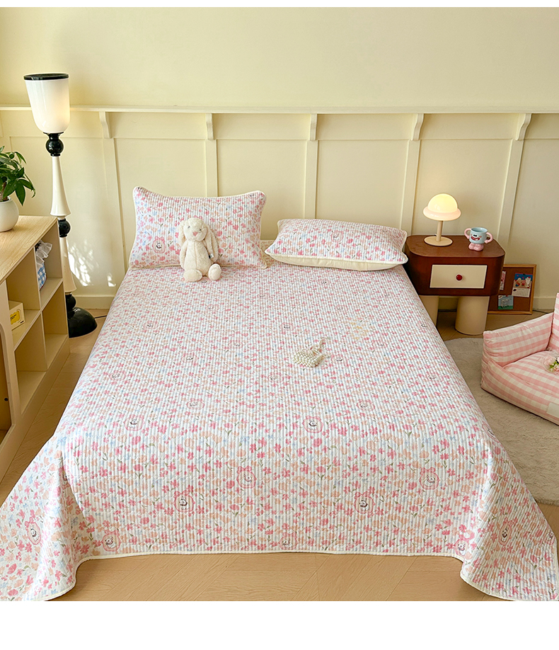 寐居家纺 2025新款A类数码印花老粗布夹棉床盖 桃枝粉粉