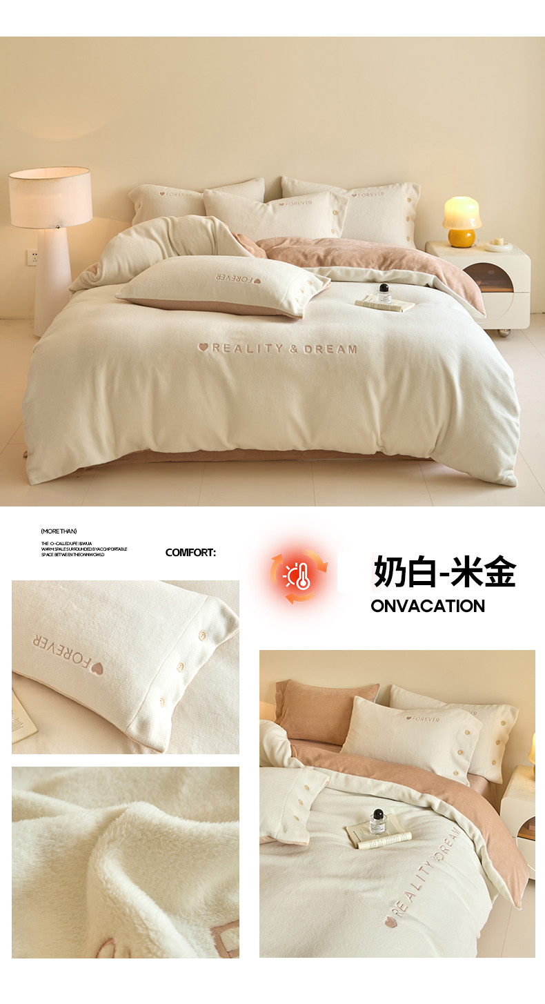 吾诺家居 2025新款刺绣款羊驼绒云朵系列四件套 奶白-米金