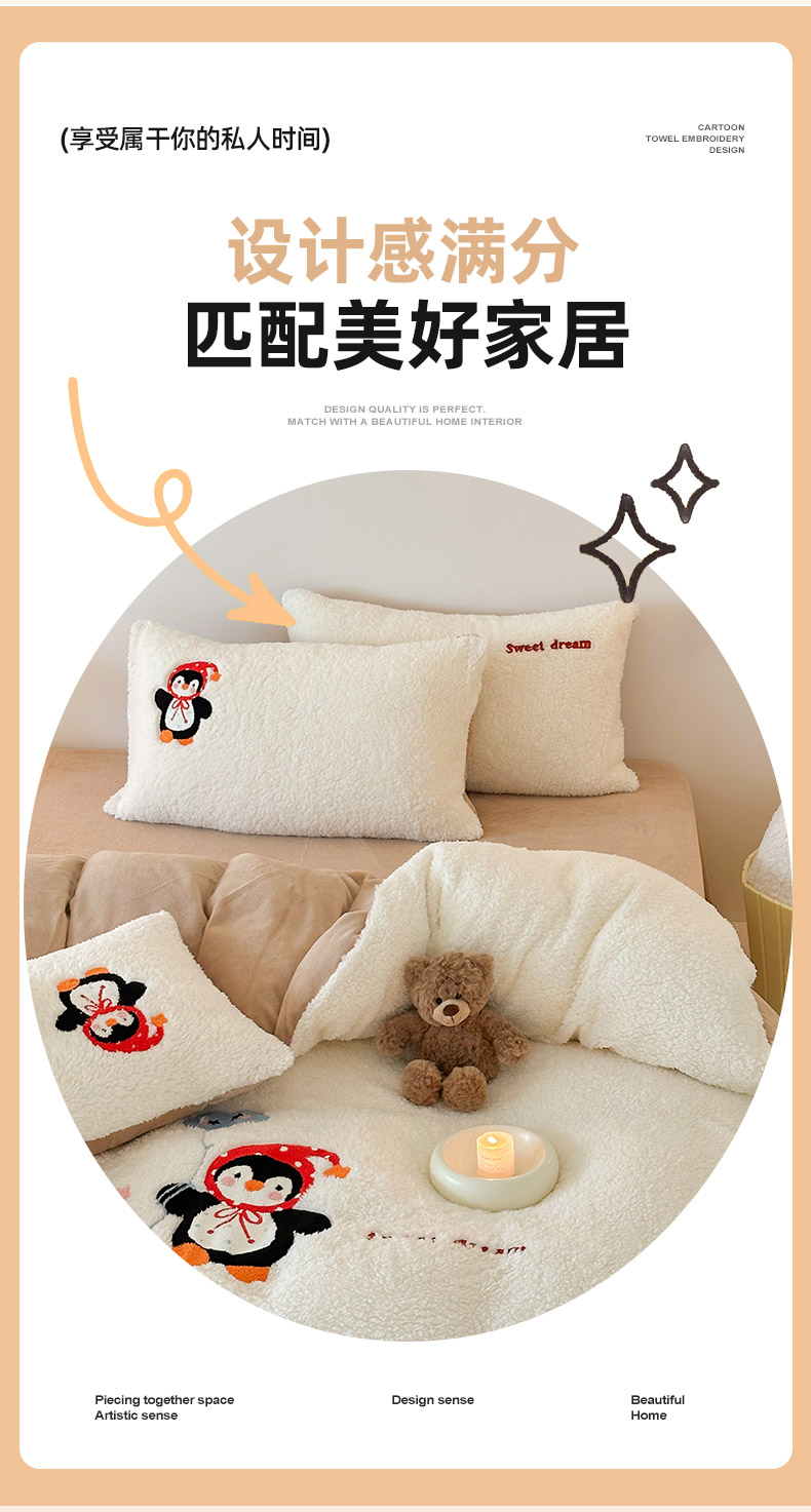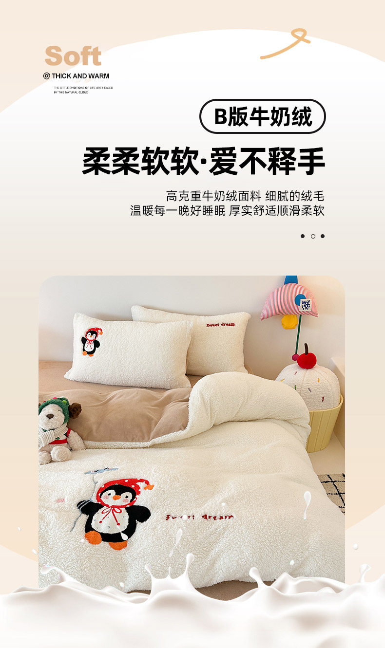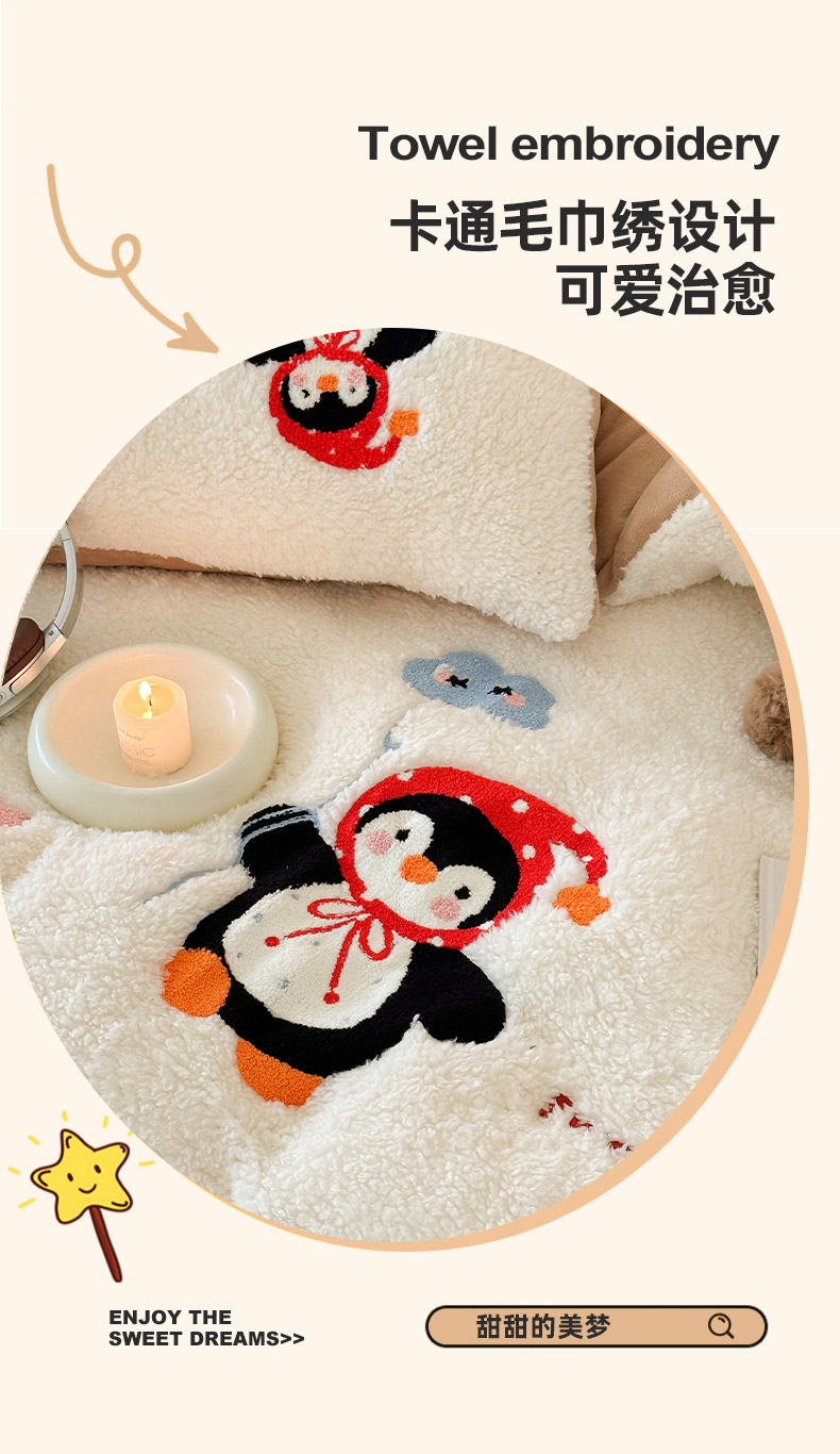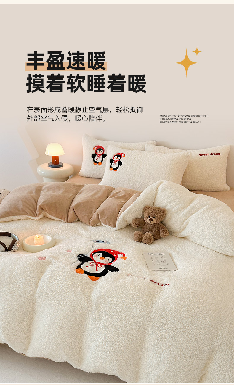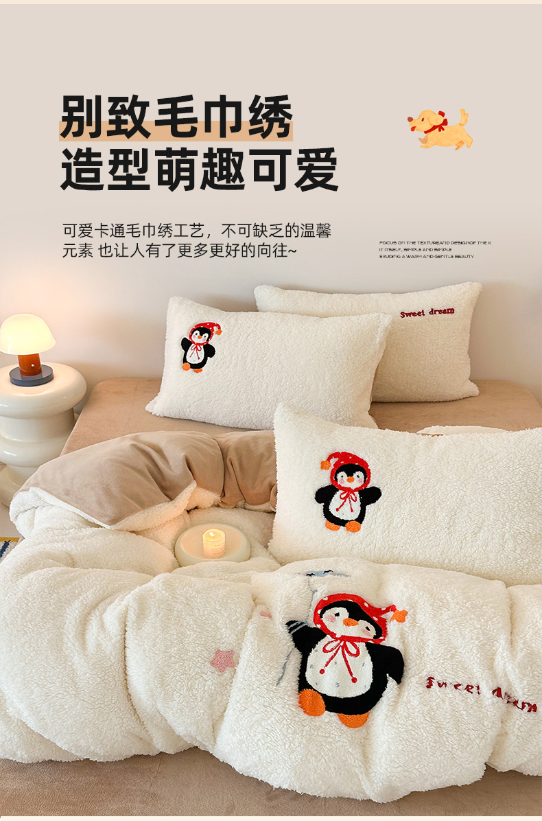商品名称:梓之赫 2025新款小版羊羔绒牛奶绒卡通四件套冬季加厚保暖 企鹅-白卡其