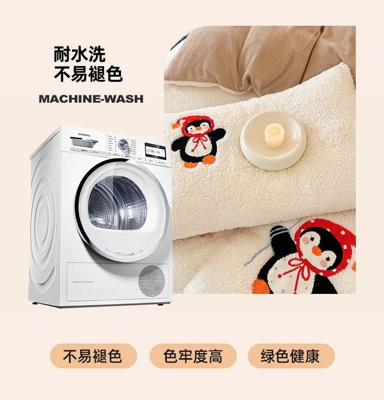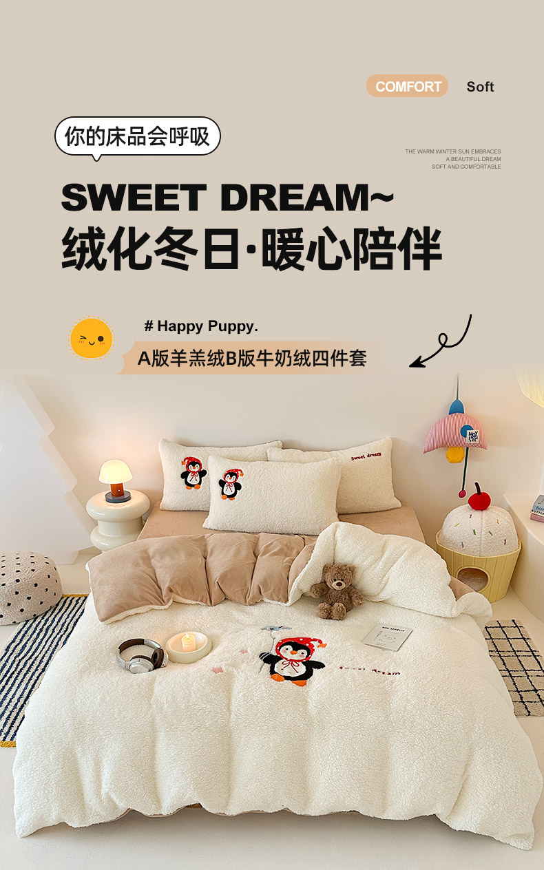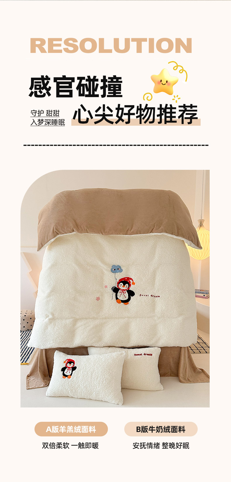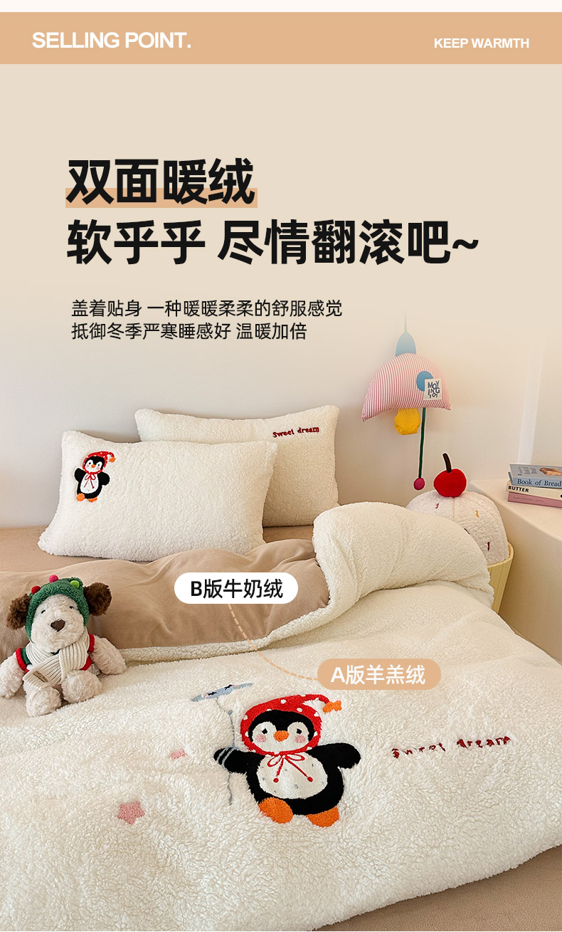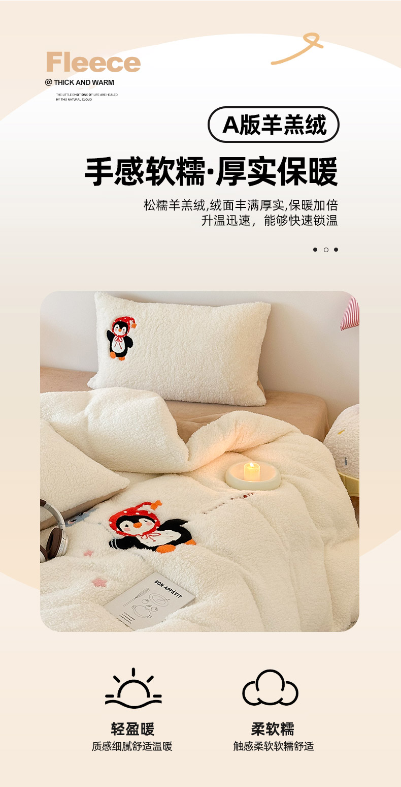 商品名称:梓之赫 2025新款小版羊羔绒牛奶绒卡通四件套冬季加厚保暖 企鹅-白卡其